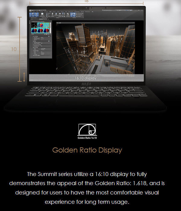 Het scherm van deze Summit E14 laptop is iets groter dan normaal het geval is. Ook al is het scherm 14 inch groot, de verhouding is wel wat anders. Waar er normaal gebruik gemaakt wordt van een 16:9 scherm in laptops en monitoren is er hier gekozen voor een 16:10 verhouding. Deze verhouding zit dicht tegen de 1.618 aan wat ook wel de Golden Ratio genoemd wordt. Er is dan meer zichtbaar op het scherm en helpt bijvoorbeeld bij het ontwerpen van websites. Daarbij zijn de layouts ook over het algemeen gemaakt volgens dit principe. Meer informatie over de golden ratio kun je hier vinden.