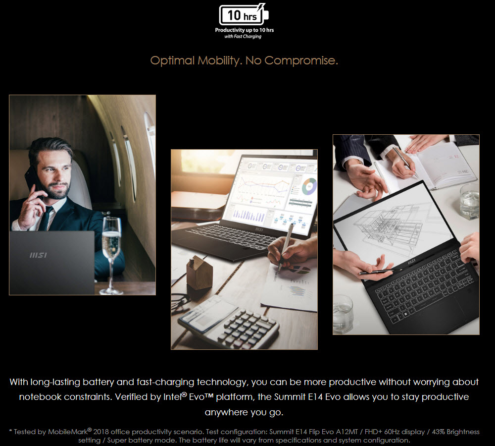 Qua prestaties weet de Summit redelijk goede scores neer te zetten. Hij zal een desktop processor zeker niet gaan verslaan maar komt toch in de buurt van een middenklasse processor van de vorige generatie. En dat voor een draagbaar apparaat. Wat dat betreft weet de processor wel te scoren. De batterijduur van de laptop is redelijk te noemen maar helaas haalt deze versie bij standaard gebruik niet de 9 uur die beloofd wordt voor een machine uit de EVO reeks. Dit is wellicht wel te halen wanneer de eco stand ingeschakeld is en de laptop niets doet maar daarvoor schaf je deze machine natuurlijk niet aan. Gelukkig ondersteunt de laptop snel laden. Daardoor kan de laptop weer snel gebruikt worden voor een aantal uur.