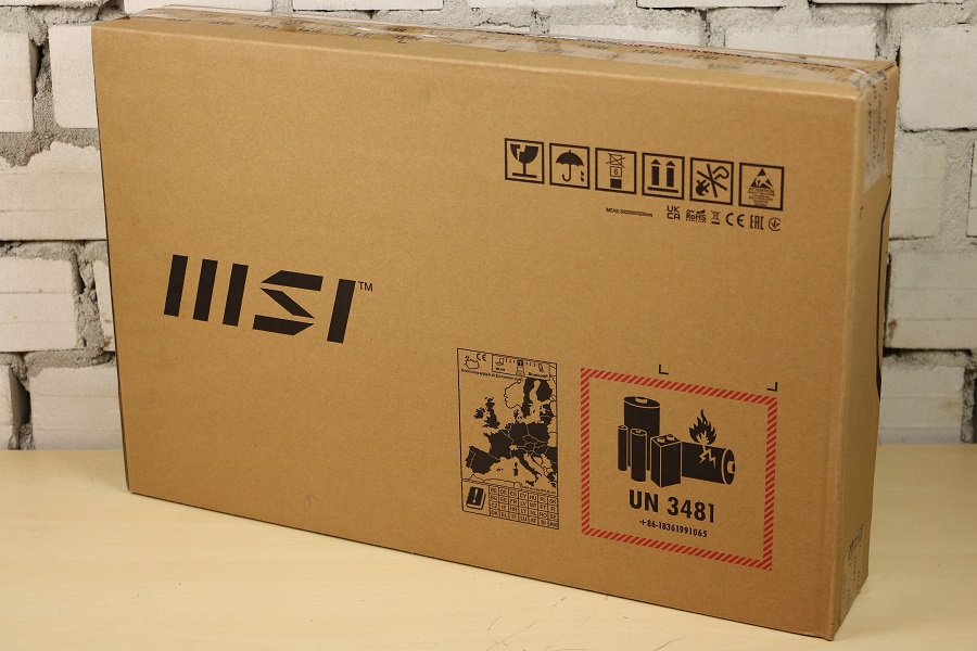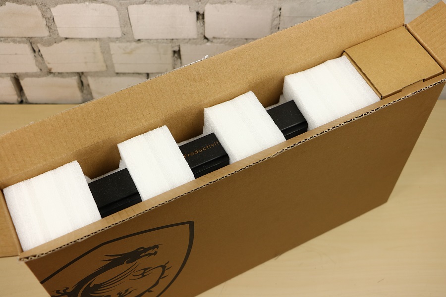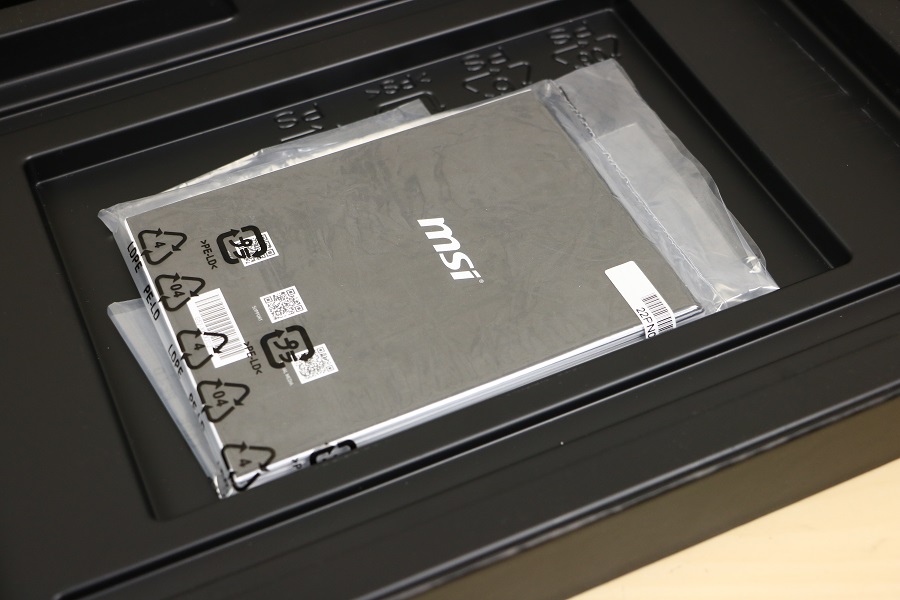 De voorkant van de doos ziet er… wat kaal uit eigenlijk. Er staat het logo van MSI op, meer niet. Moet wel zeggen dat ik persoonlijk het logo nog steeds mooi vindt. Draaien we de doos om dan staat daar het andere, strakkere logo van MSI wat gebruikt wordt voor de zakelijke markt. Ook vinden we logo’s voor het opstapelen van de dozen, een kaart waar de laptop goedgekeurd is voor de WLAN en Bluetooth die in de laptop zit en het feit dat er een batterij in de doos aanwezig is (wat vrij logisch is bij een laptop). Op de zijkant van de doos zien we de productinformatie. Denk hier aan de productnaam, het serienummer, de SKU en het gewicht. Wel fijn om te zien wat je in je handen hebt. Maken we de doos aan de bovenkant open dan zien we daar een hoop schuim en twee verschillende dozen.