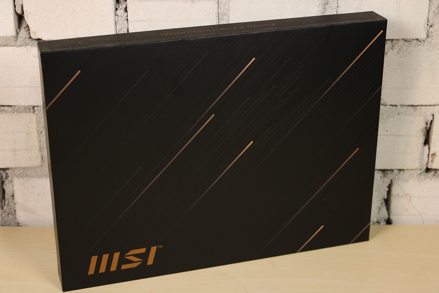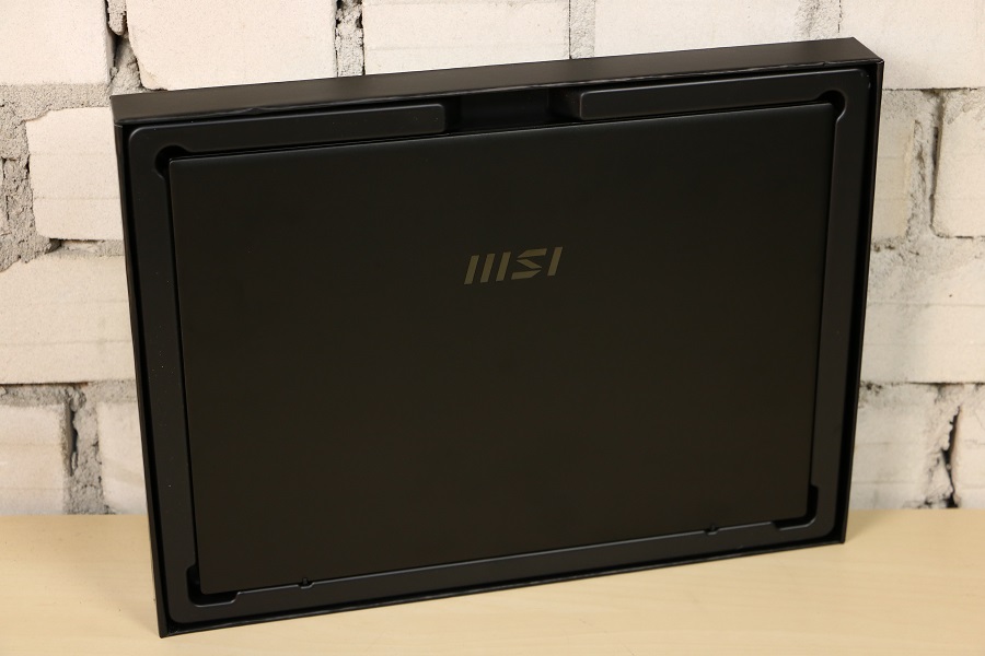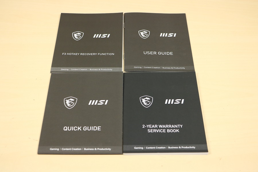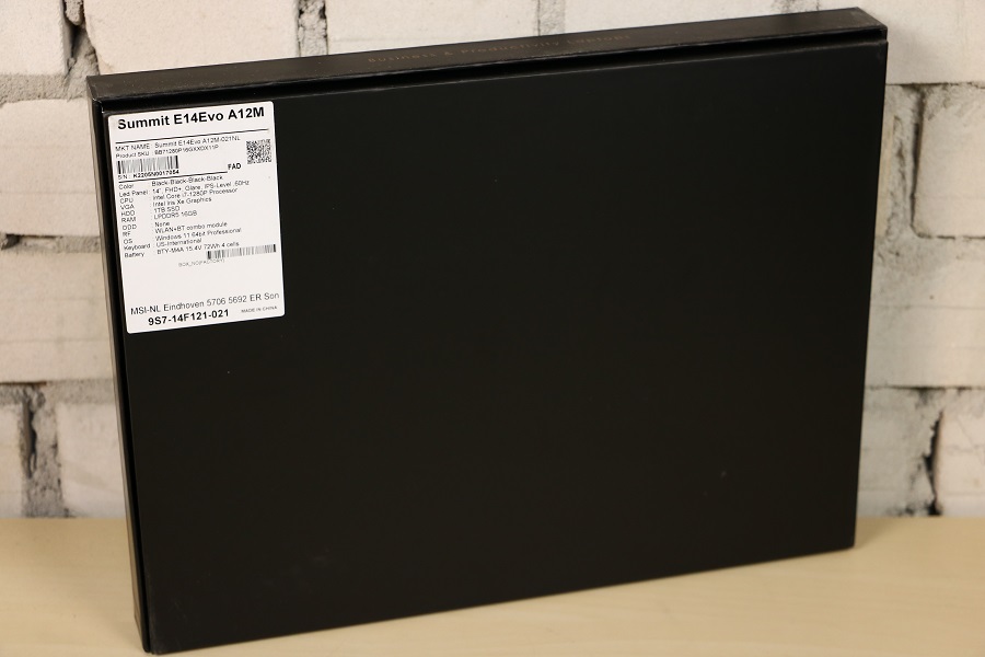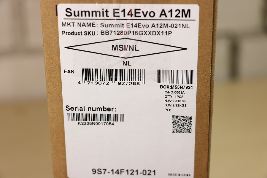 Tijd om de andere doos onder het schuim vandaan te halen en te zien wat er daar allemaal in zit. De doos ziet er al wat beter uit dan de doos waar het geheel in verpakt was. Mooi zwart uitgevoerd, MSI logo links onderin en speelse diagonale strepen op de voorkant. De achterkant is in principe zwart maar er is linksboven een sticker te zien. Op deze sticker kunnen we wederom het model aflezen maar nog veel belangrijker de specificaties van de laptop zelf. Zo weten we dat deze laptop een IPS scherm heeft, een i7-1280P processor, 16 GB LPDDR5 geheugen en een 1TB SSD. Dan vinden we op de zijkant van de doos nog de tekst: “Business & Productivity Laptops”, een verwijzing naar de Summit Serie. Het zijn dus geen laptops waar je veel zware games op kunt spelen, daarvoor moet toch gekeken worden naar een andere laptop. Halen we de deksel van de doos dan zien we de laptop netjes in de doos liggen. Het logo valt al meteen op. Halen we de laptop uit de doos dan vinden we daar het papierwerk in een zakje. Dit zijn de verschillende handleidingen, het service boekje en een papier hoe de laptop teruggezet kan worden naar fabrieksinstellingen.