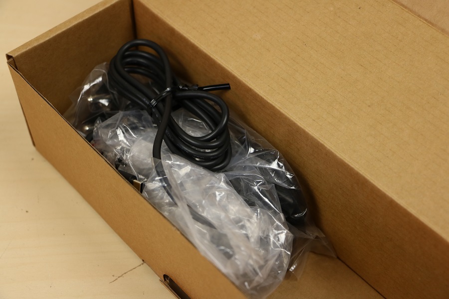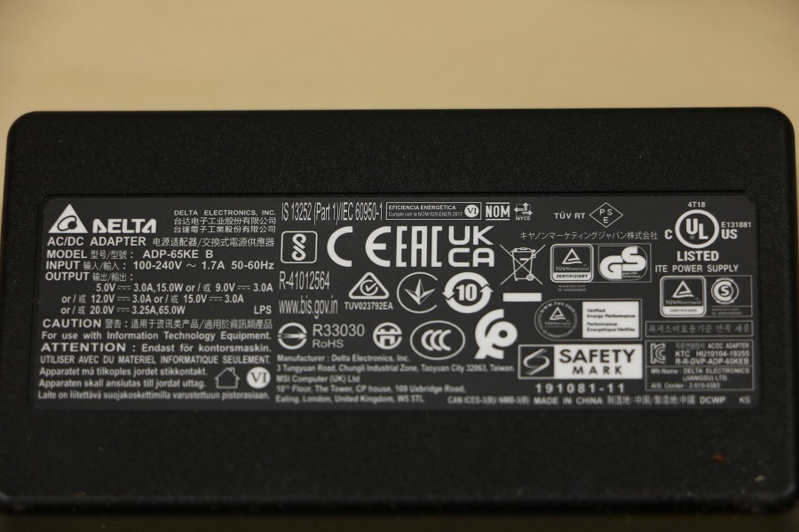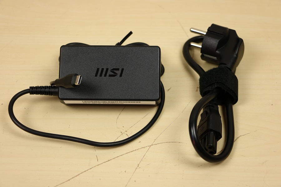 We kijken eerst naar de kleine bruine doos die aan de zijkant verstopt zit. Maken we deze open dan zien we daar wat plastic liggen en een stroomkabel. Bij nader inzien blijkt het plastic de verpakking van de adapter te zijn. Deze adapter is an sich niet groot te noemen en bevat aan de voorkant het logo van MSI. Het stroomsnoer is ietwat kort en heeft een “Mickey Mouse” connector die in de adapter gestoken wordt. De andere kant van de adapter is een USB Type-C connector. Dit betekent dat eigenlijk elke USB lader wel gebruikt kan worden maar dan moet hij wel genoeg stroom kunnen leveren aan de laptop. De adapter zelf heeft een maximale output van 65 Watt, dit is te zien op de achterkant van de adapter. Daar zien we ook dat de fabrikant van deze adapter Delta is, een bedrijf wat adapters maakt voor meer laptops.