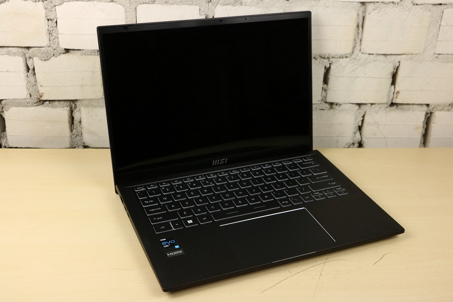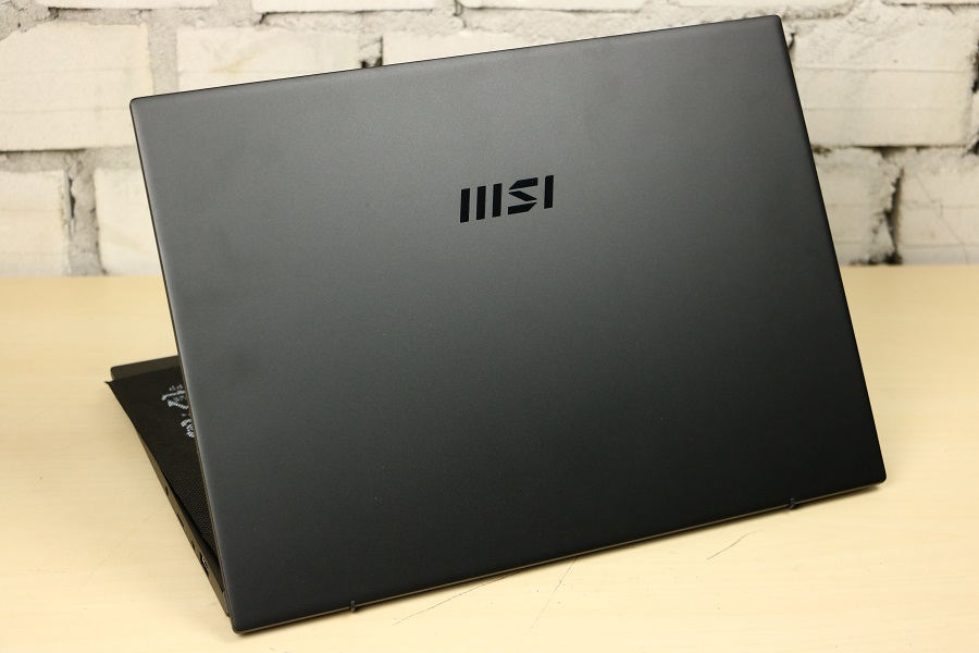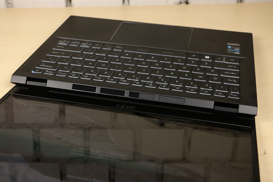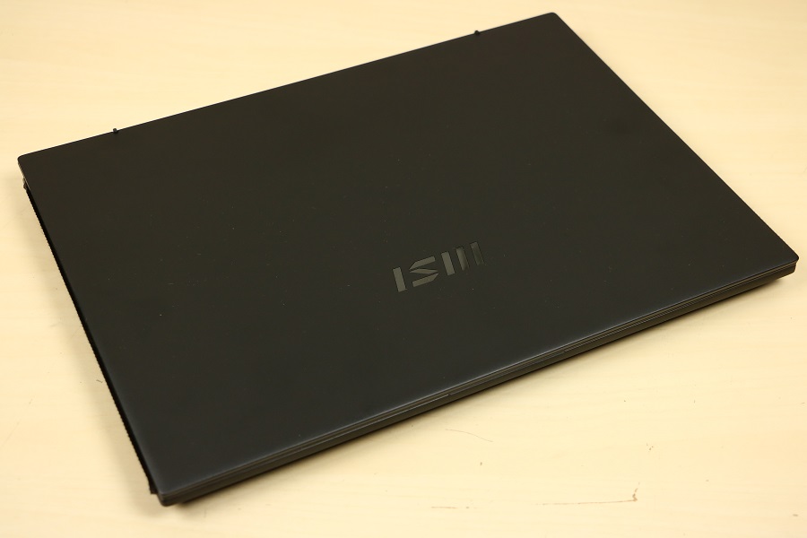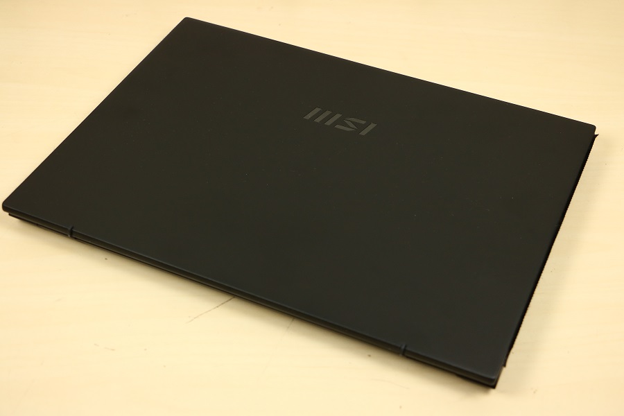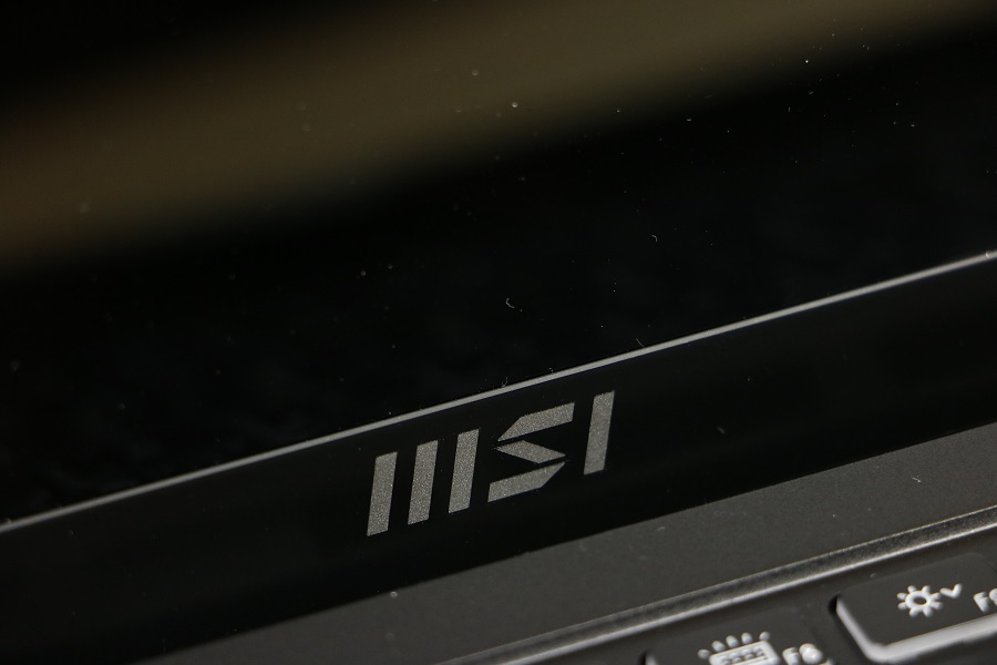 Voordat we de binnenkant van de laptop gaan bekijken, kijken we eerst nog naar de aanwezige aansluitingen op de zijkant van de laptop. Aan de linkerkant van de laptop vinden we een HDMI aansluiting om het beeld naar een extern display te sturen en twee USB Type-C poorten die zowel Thunderbolt als DP ondersteunen. Ook kan de laptop via deze poorten opgeladen worden. Aan de andere kant van de laptop hebben we een combo aansluiting voor de hoofdtelefoon en microfoon, een micro-SD kaartlezer, een schakelaar om de webcam uit te schakelen en een USB Type-A connector. Verder zijn er geen poorten aanwezig. Klappen we de laptop open dan zien we op het eerste gezicht niet veel spectaculairs. Dit lijkt op een standaard laptop maar uiterlijk hoeft niet echt wat te zeggen. Onderaan het scherm vinden we het zakelijke logo van MSI terug.