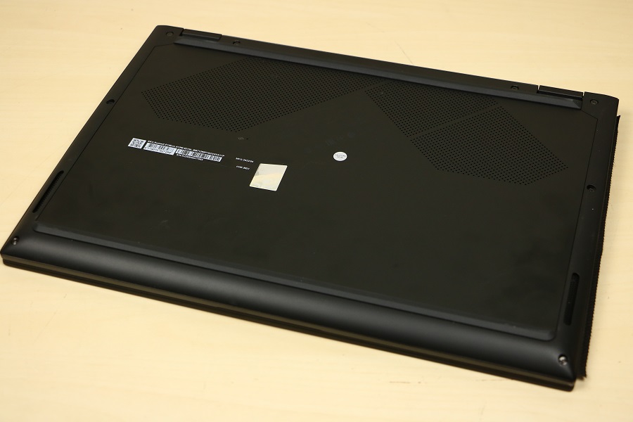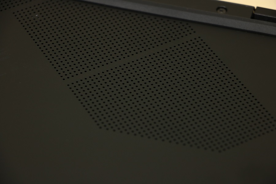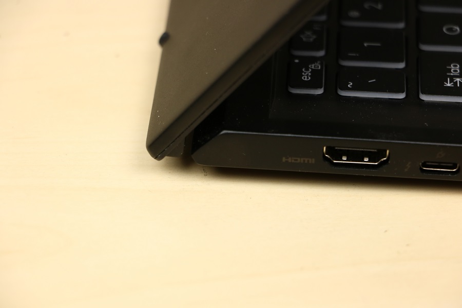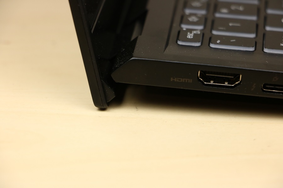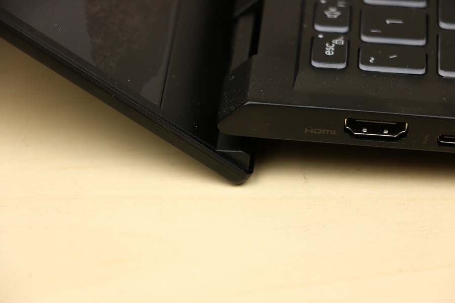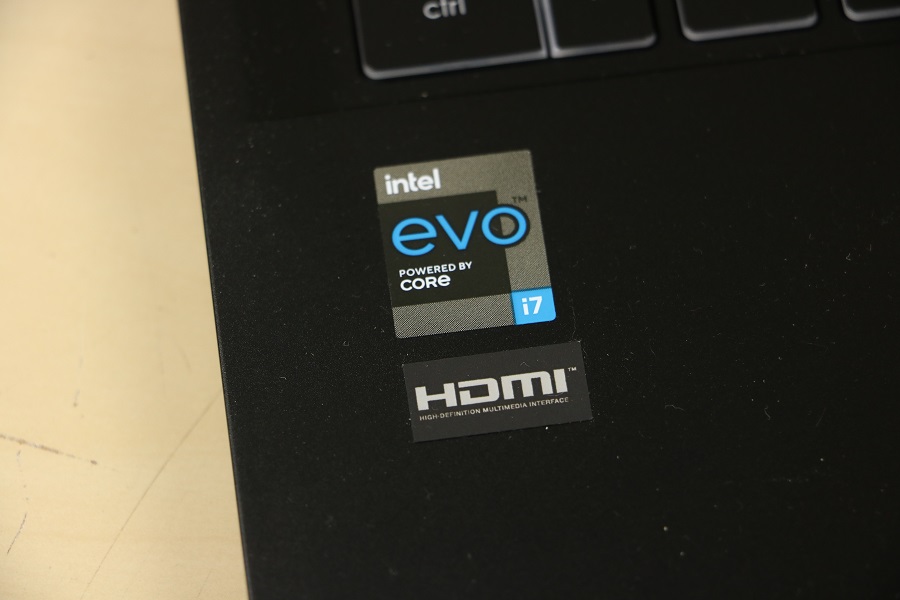 Natuurlijk mogen stickers niet ontbreken op de laptop. Hier zien we dat er een HDMI poort aanwezig is op de laptop en dat hij voorzien is van een Intel EVO Core i7 processor van Intel. Wat tegenwoordig ook standaard is op een laptop is een webcam. Deze bevindt zich bovenin het scherm. Hier zitten tevens de microfoons voor het opvangen van het geluid. Dit is wellicht niet de beste microfoon maar het doet wat het moet doen. Het scherm van de laptop heeft trouwens een dubbelfunctie. Niet alleen laat deze het beeld zien (zoals we direct kunnen zien) maar deze fungeert ook als een soort standaard. Hoe verder je het scherm naar achteren klapt hoe hoger de laptop komt te staan. Nadeel is wel dat het scherm steeds lastiger te lezen is. We zien, als we het scherm helemaal naar achteren klappen, een aantal ventilatieroosters. Zo kan de laptop toch een deel van zijn warmte kwijt. Afhankelijk van hoe het scherm staat wordt de lucht naar boven of naar achteren geblazen. De rubbers zorgen ervoor dat het scherm niet beschadigt.