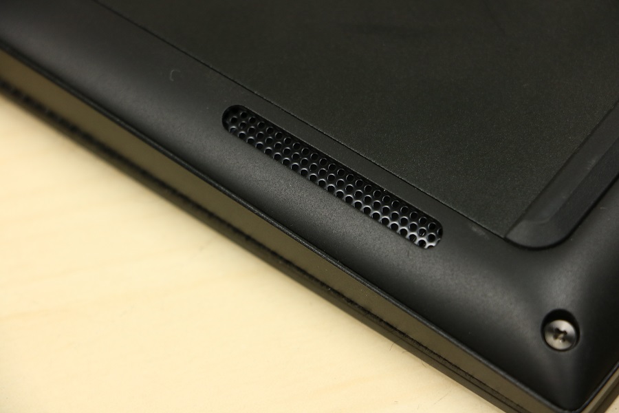 Tijd om te kijken naar de laptop zelf. De bovenkant ziet er niet al te spannend uit en dat maakt ook niet uit voor een zakelijke laptop. Daarvoor wil je eigenlijk geen laptop hebben die allerlei fratsen en verlichting op deze kant heeft. Tevens zien we het zakelijke logo van MSI op deze kant, dus niet het logo met de draak. Dit logo is dus ook niet verlicht wat in deze niet zo erg is. Draaien we de laptop om dan zien we daar veel gaten zitten die moeten zorgen voor koeling van de laptop. De ventilatoren van de laptop zullen hierlangs ook warme lucht proberen af te voeren. Tevens vinden we hier een sticker met daarop de SKU, de barcode en het serienummer. Op die manier kun je altijd zien welke machine je voor je neus hebt. Ook vinden we aan de voorkant van de laptop wat meer gaten. Deze zijn bedoeld om het geluid de laptop uit te krijgen. Het zijn dan geen grote speakers maar ze laten iets van geluid horen. Dan gaan we de laptop open klappen om te kijken wat er aan de binnenkant van de laptop zit.