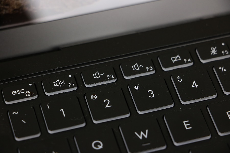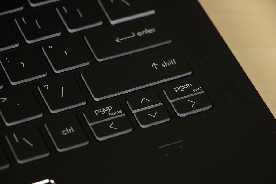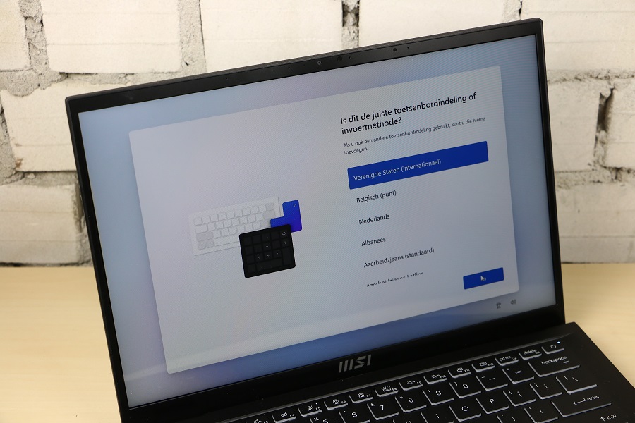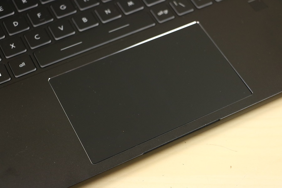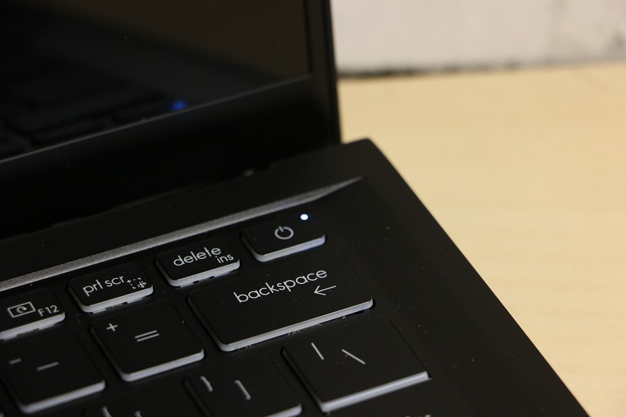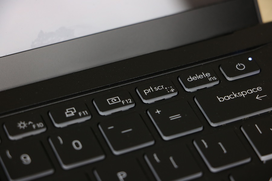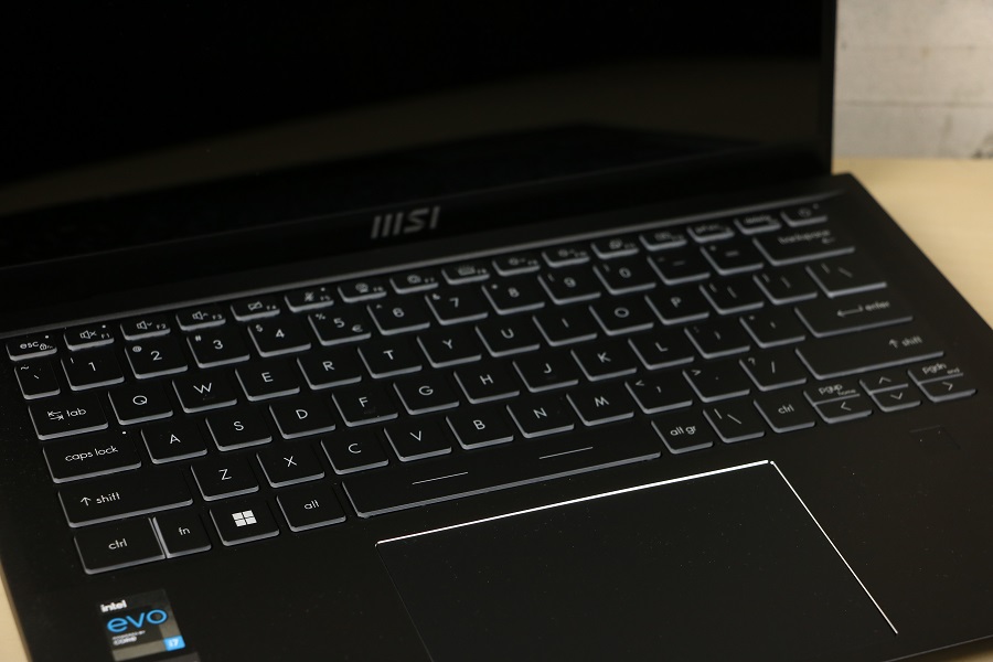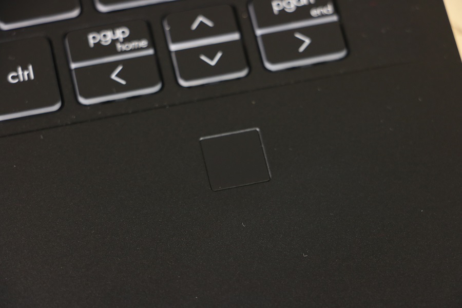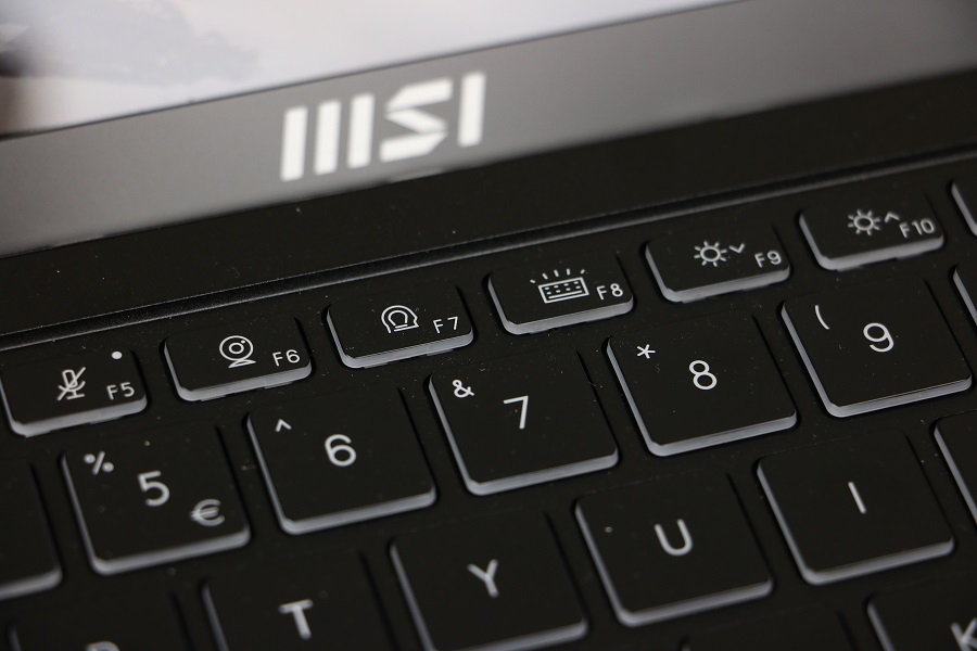 We zien meteen het toetsenbord liggen wat toch een aanzienlijk deel van de ruimte in beslag neemt. Er zijn echter meer functies aanwezig dan knoppen dus heeft MSI een hoop van de functies verstopt onder de Functie toetsen. Daar kunnen onder andere het volume, de verlichting en de helderheid aangepast worden. Ook kun je hier de microfoon en webcam bedienen zonder dat je Windows nodig hebt. Bij de pijltjestoetsen vinden we ook meerdere functies verstopt onder één knop. We zien tevens dat een numeriek toetsenbord ontbreekt op deze laptop. Niet zo gek gezien de ruimte die beschikbaar is op de machine. Je moet dus gebruik maken van de bovenste cijfers of een los numeriek toetsenbordje kopen. Rechts bovenin hebben we dan de knop om de laptop aan te zetten. Deze is voorzien van een LED, mocht je twijfelen of de laptop wel aan staat. Verder vinden we buiten het toetsenbord nog een fingerprint reader onder de pijltjestoetsen. Hiermee kan de laptop ontgrendeld worden, mocht je dat willen. Tevens is het mogelijk om met je vingerafdruk bepaalde handelingen uit te voeren voor authenticatie. Natuurlijk mag het touchpad niet ontbreken op deze laptop. Dit is één geheel en bevat geen losse muisknoppen. Het ziet er erg strak en netjes uit alleen wilt het wel eens gebeuren dat, terwijl je rechts wilt klikken, toch met links aan het klikken bent. De scheidingslijn is niet makkelijk te zien.