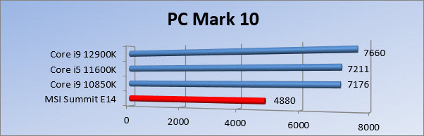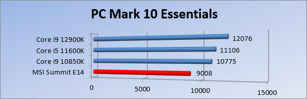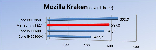 We zien in PC Mark 10 dat de Summit het een beetje moet afleggen tegen de rest. Dit is een benchmark die verschillende taken uitvoert en een gemiddelde laat zien van alle tests. Even verderop zien we ook de reden waarom de score wat lager uitvalt. In de productivity tests zet de Summit een lage score neer. Ga je kijken naar de Essentials dan doet de laptop het zeker een stuk beter. In Kraken zien we dat de i7 het toch redelijk netjes doet.