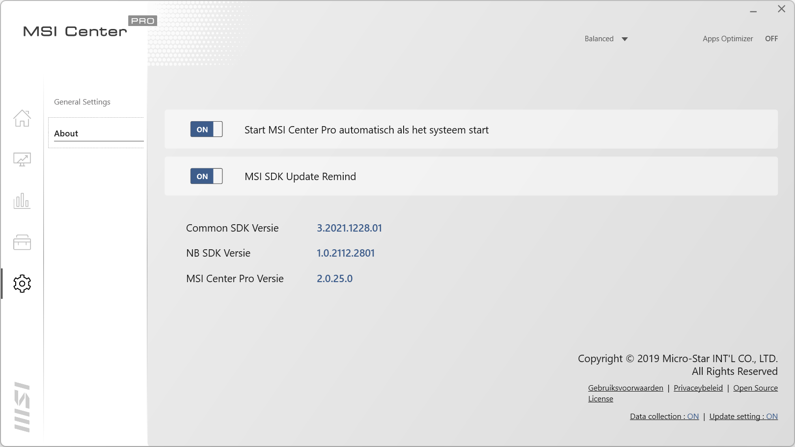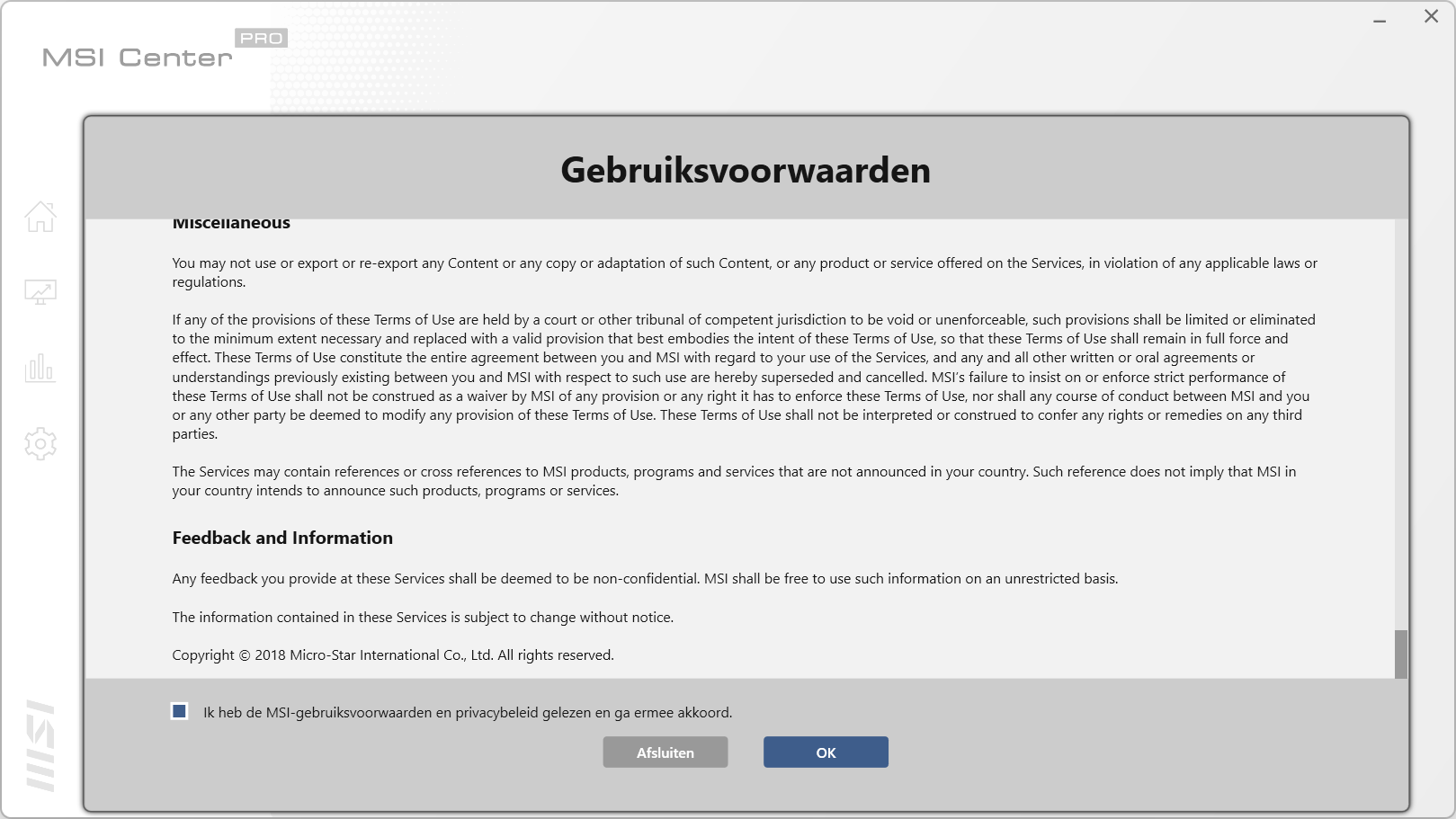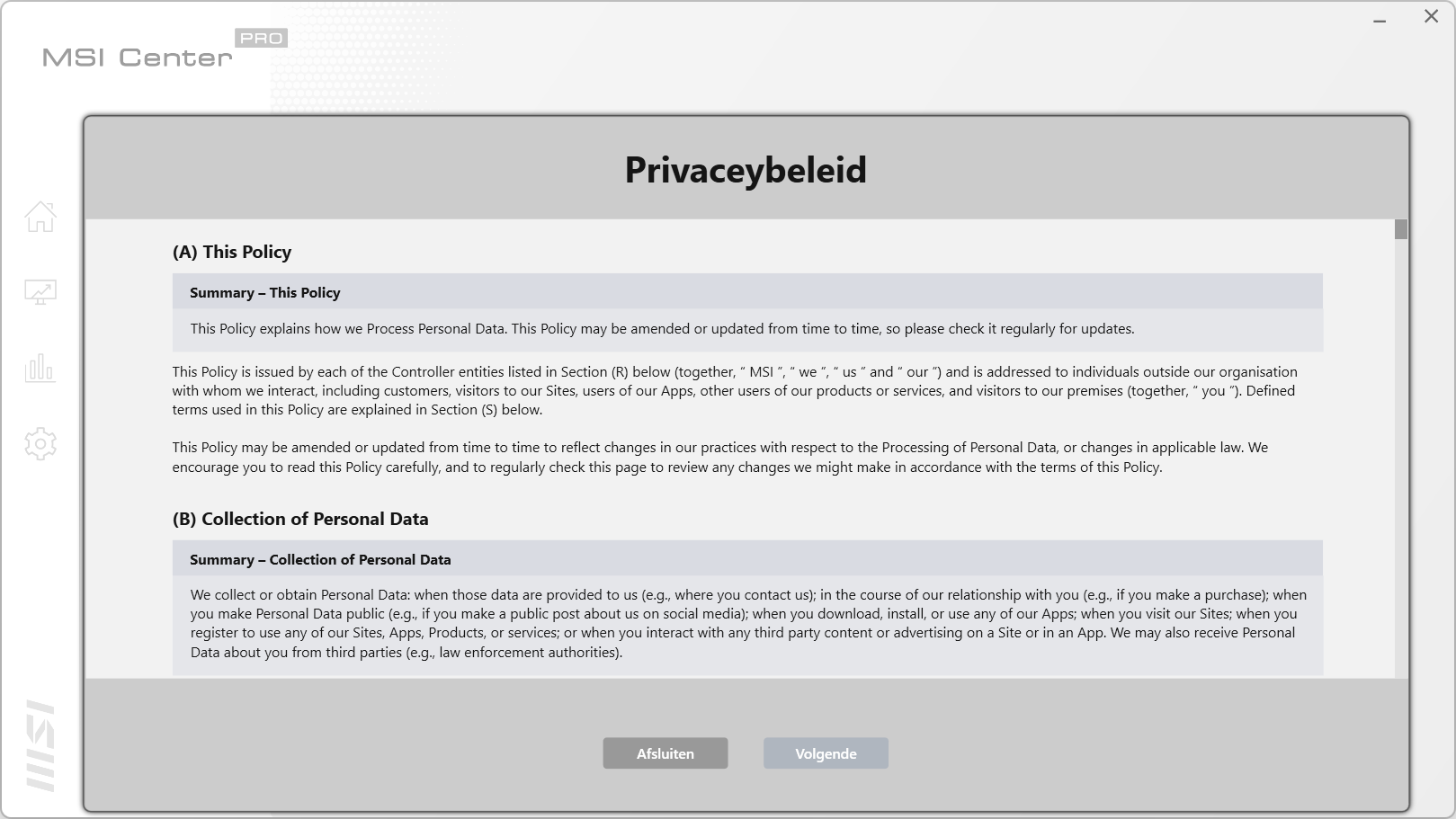MSI heeft voor deze laptop uiteraard software. Dit is het MSI Center Pro pakket, een programma waar verschillende opties en tools in te vinden zijn. Deze software is standaard geïnstalleerd op de laptop. Wel is het handig om een internetverbinding te hebben als je het programma voor het eerst start. Het kan wel eens zo zijn dat het programma een update heeft gekregen. Als het pakket voor het eerst gestart wordt krijg je twee schermen te zien: één voor de privacy en één voor de gebruikersvoorwaarden. Overigens laat de vertaling te wensen over: de kop is in het Nederlands terwijl de rest van de tekst in het Engels is. Nadat we deze schermen gehad hebben krijgen we een scherm die toont dat verschillende onderdelen gestart worden. Vervolgens zien we het programma verschijnen. We zullen de verschillende schermen bekijken.