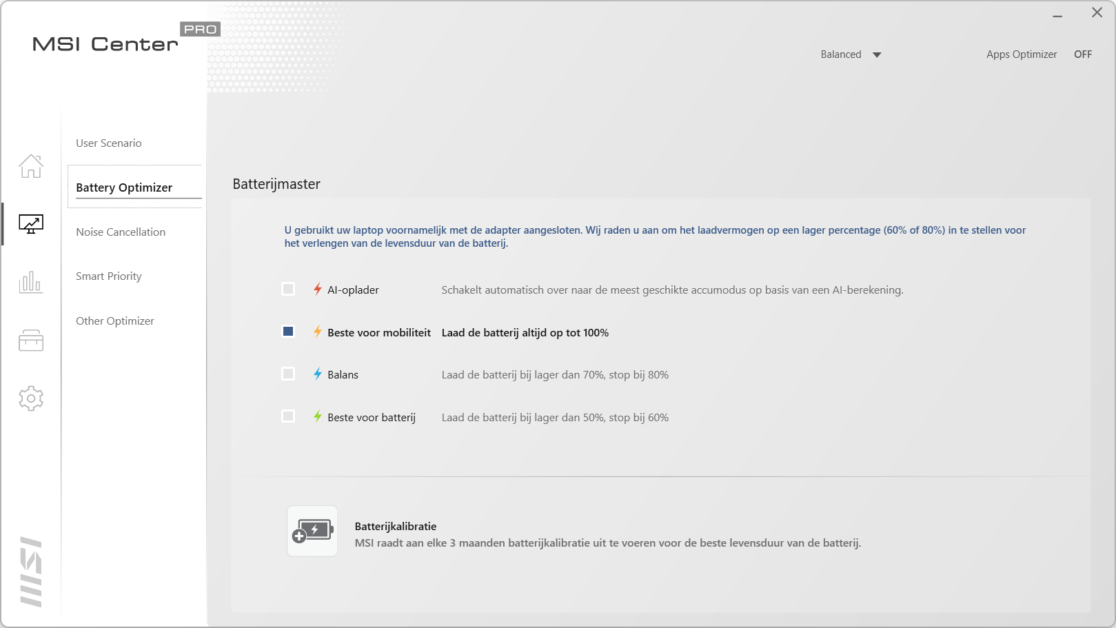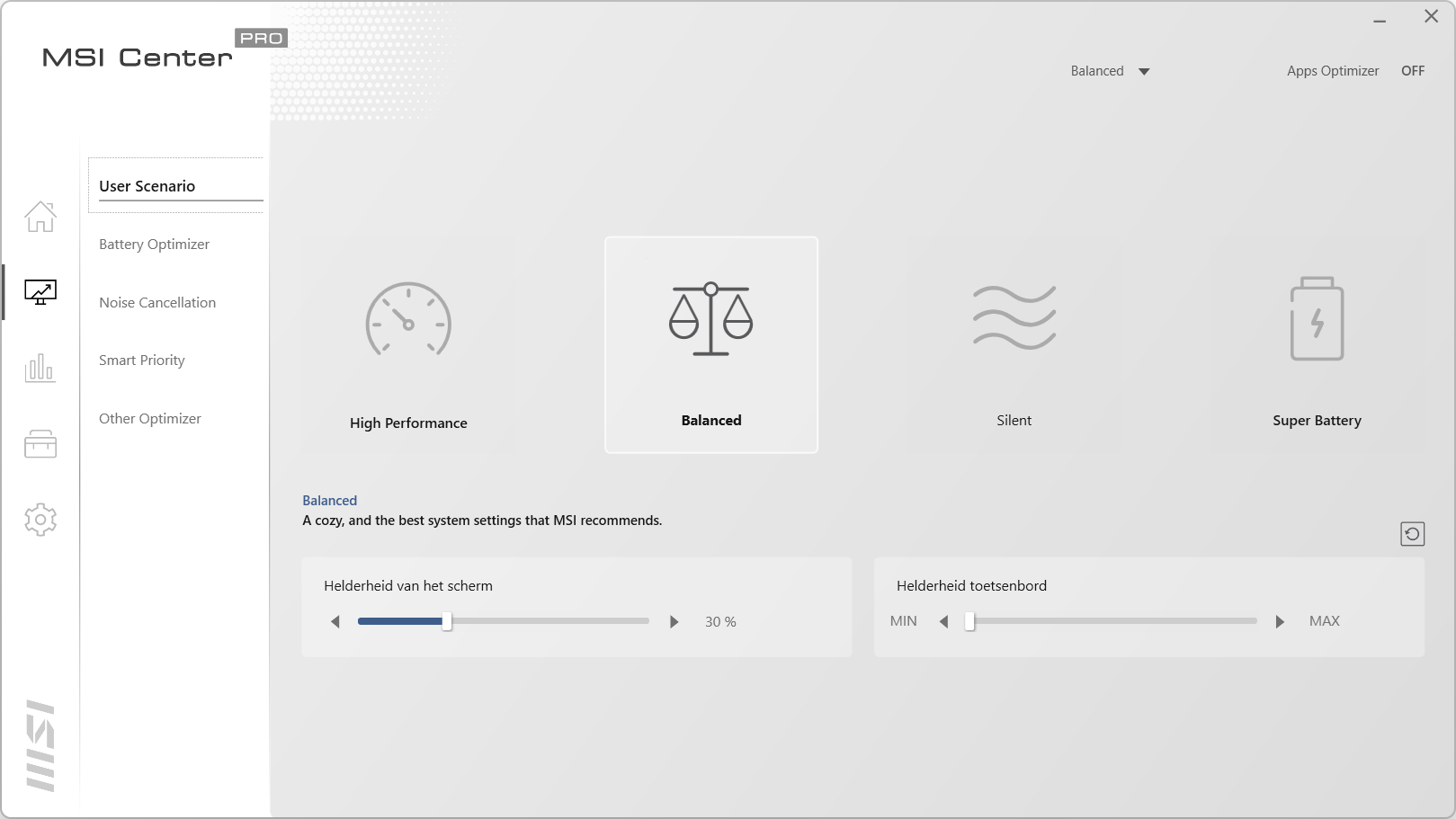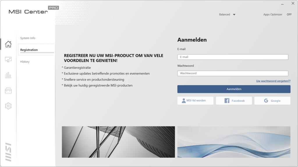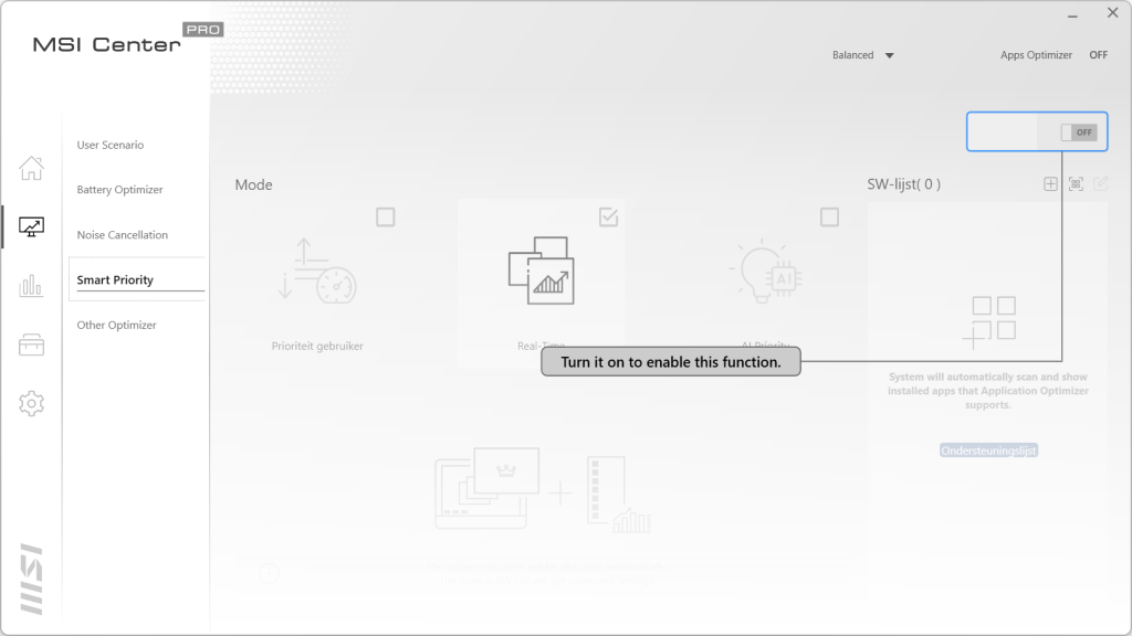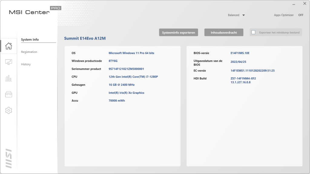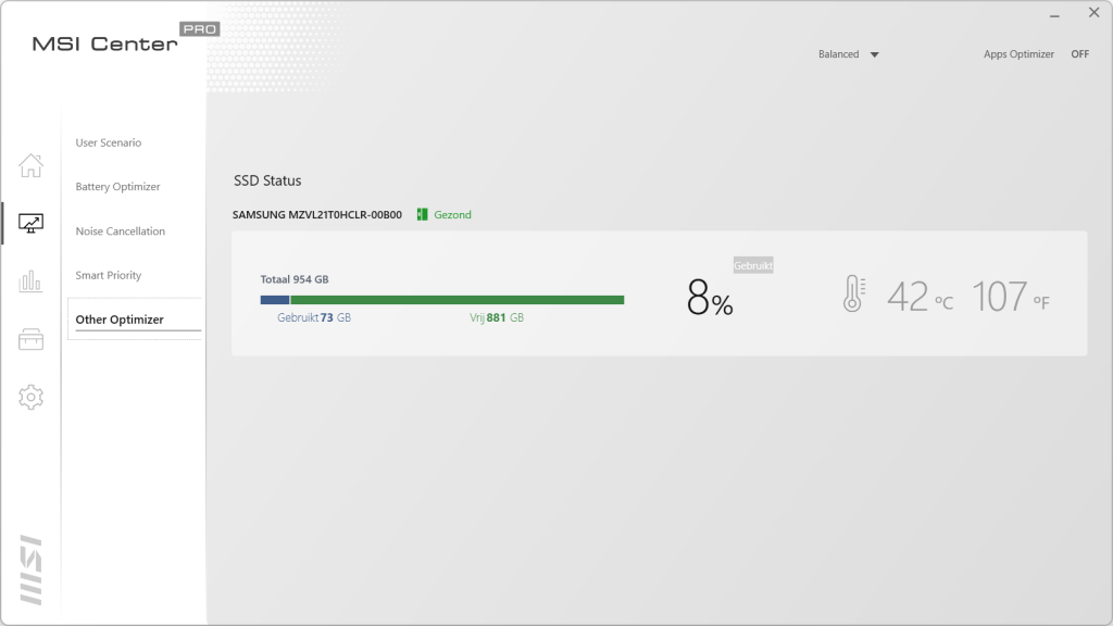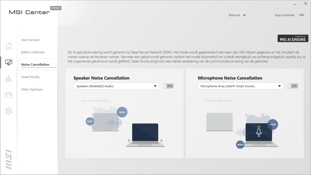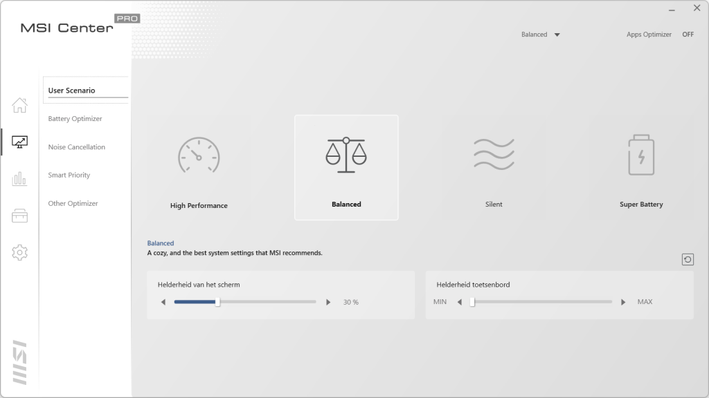 In het home scherm hebben we drie tabbladen. In het eerste tabblad staat de informatie van de laptop vermeld. Hier zien we ook dat het geheugen op 2400MHz draait ook al geven de specificaties iets anders aan. We zien de videokaart terug en de capaciteit van de accu. Als laatste wordt ook de BIOS versie weergegeven. In het volgende blad kan de laptop geregistreerd worden voor betere ondersteuning en garantie. Ook krijg je op deze manier nieuwsberichten gemaild. In het laatste tabblad staat de historie van de laptop. Gaan we naar de tweede knop dan komen we uit bij het optimalisatie centrum van MSI. Hier kan bepaald worden of je een gebalanceerde mode wilt draaien, de High Performance wat weer ten koste gaat van de accuduur en de Super Battery mode die juist de levensduur van de accu verlengt. In het volgende tabblad is de instelling van de batterij aan te passen. Het derde blad is voor de speakers en de microfoon. Hier kan de noise cancellation ingeschakeld worden die achtergrondgeluiden weg filtert als het nodig is. Met Smart Priority wordt bepaald welke programma’s prioriteit krijgen tot de bronnen. Dit kan de laptop uiteraard ook zelf bepalen. Als laatste kan in Other Optimizer gekeken worden wat de status is van de schijf, het processorverbruik en de temperaturen van de verschillende onderdelen.