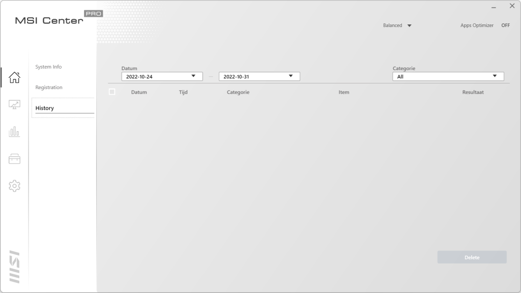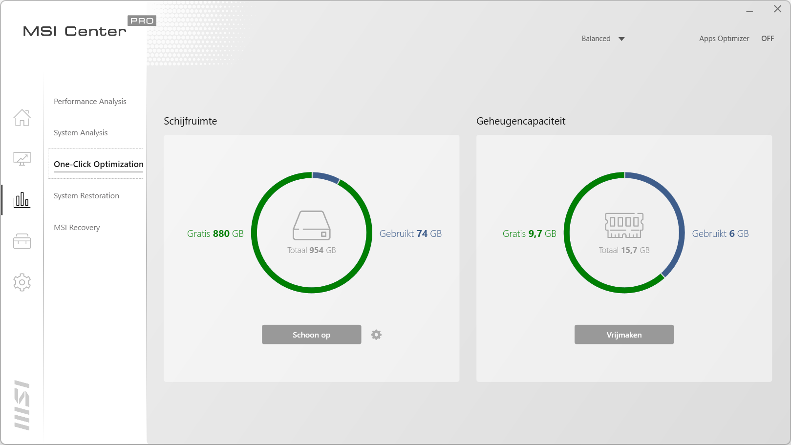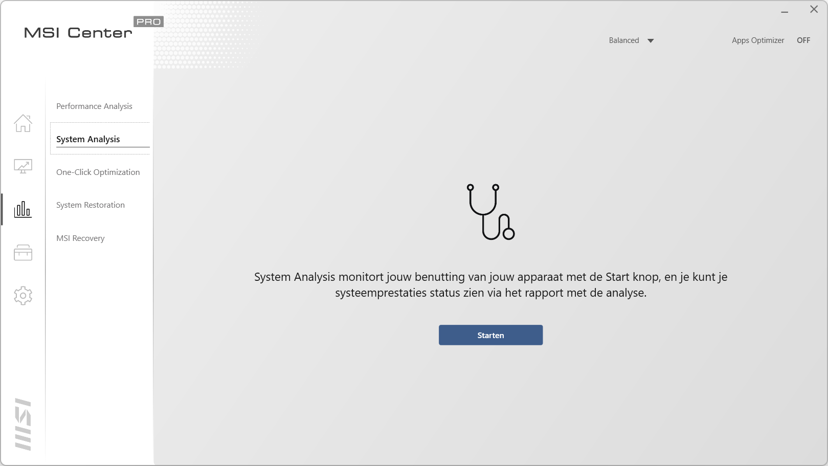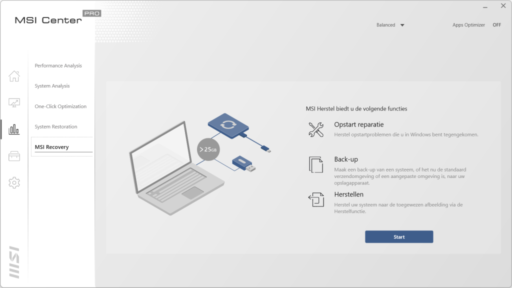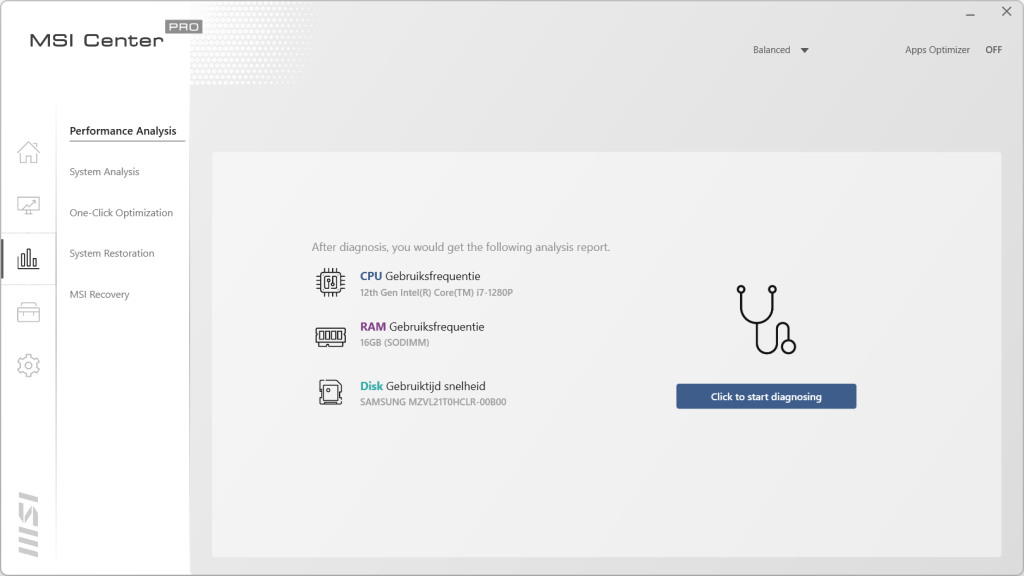 De derde knop in dit programma is bedoeld voor analyses en herstel wanneer het nodig is. Het eerste scherm laat het verbruik van de processor, het geheugen en de snelheid van de schijf zien. De volgende maakt een complete analyse van het systeem en laat zien wat er eventueel verbeterd kan worden in Windows. In het middelste scherm kan er geheugen vrijgemaakt worden als dit nodig is en de SSD opgeschoond worden, mocht je ruimte tekort komen. In System Restoration kan de status van een eerdere installatie teruggezet worden, net zoas System Restore in Windows zelf. Met MSI Recovery kan de laptop hersteld worden of compleet opnieuw ingesteld om zo opnieuw te beginnen of voor de verkoop.