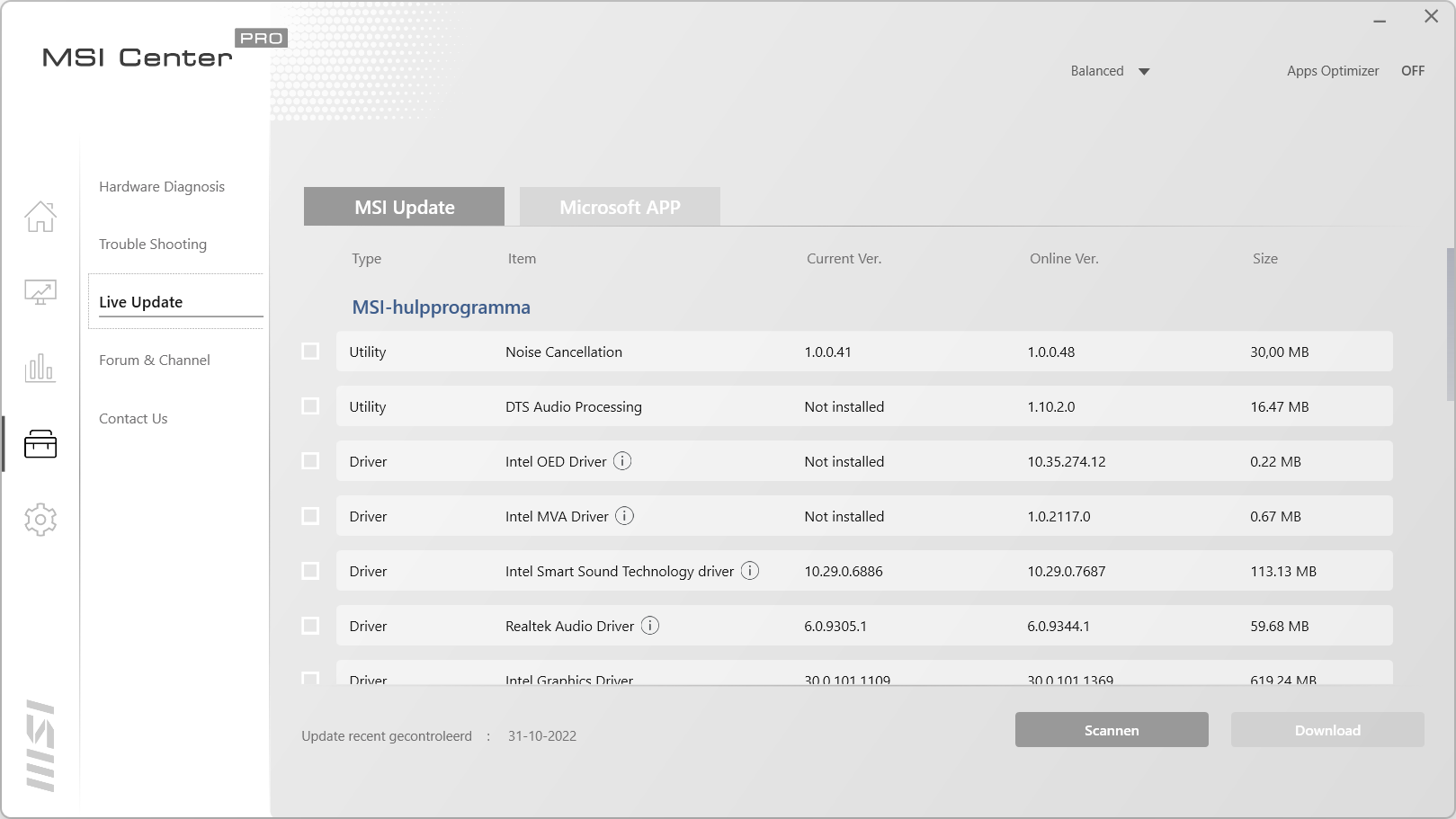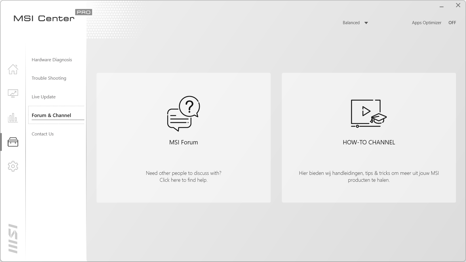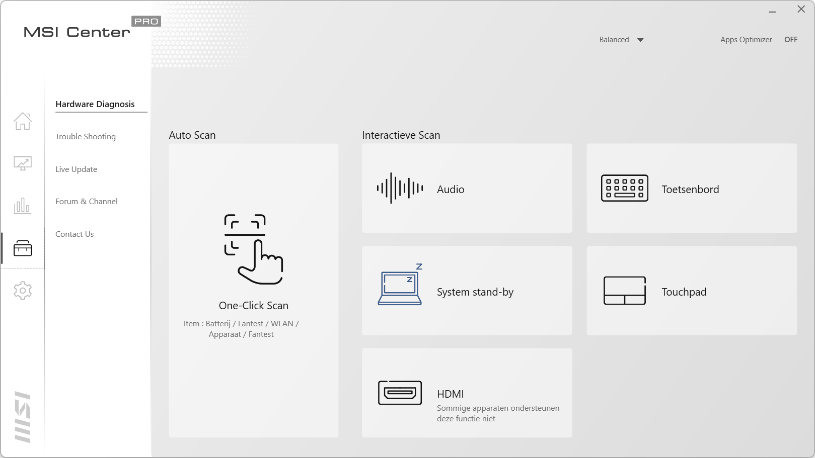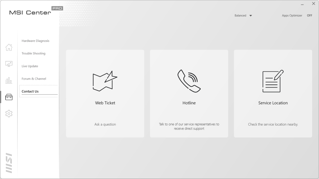 Het vierde scherm is een toolkit voor de laptop. Bij Hardware Diagnosis kun je zien of er problemen zijn met de complete laptop. Het is ook mogelijk om dit op de verschillende onderdelen van de laptop uit te voeren. Het tab Trouble Shooting laat een kennisbank zien, mocht je problemen hebben met de laptop. In Live Update zijn de verschillende programma’s en drivers bij te werken. Let wel op dat je de juiste programma’s bijwerkt en niet de programma’s selecteert die je eigenlijk niet wilt hebben. Forum en Channel geeft links naar het MSI forum en naar een pagina met handleidingen, filmpjes en meer. Bij Contact Us kunnen problemen gemeld worden via een ticket systeem of kan het telefoonnummer opgezocht worden van de klantenservice.