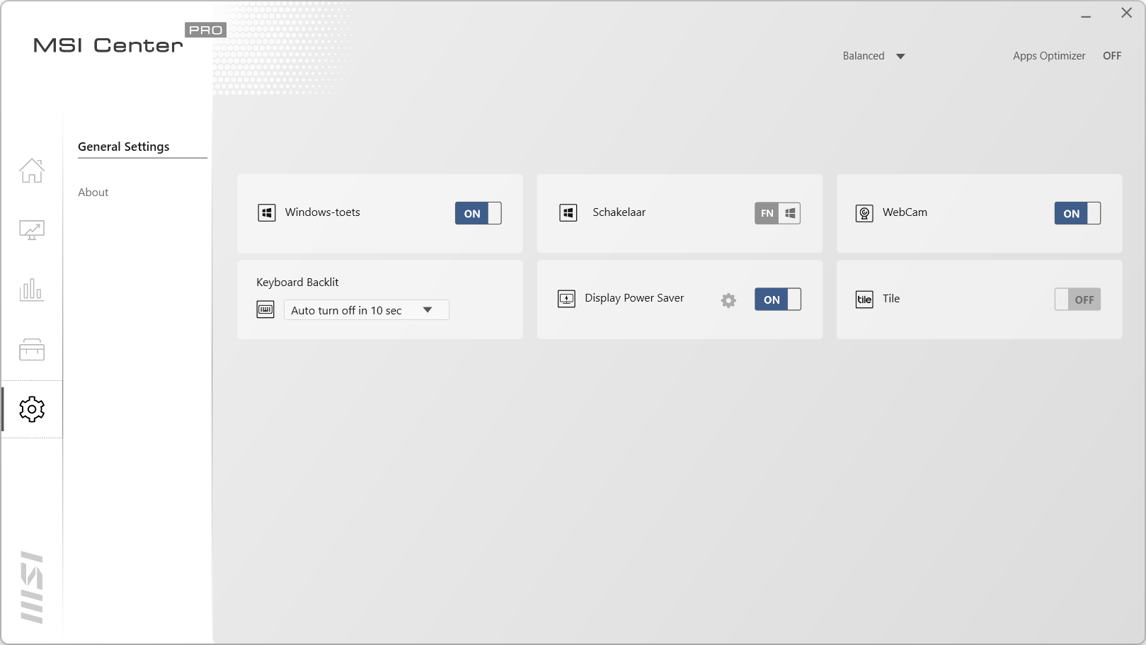 Het laatste scherm is een tandwiel icoon wat het instellingen scherm toont. Hier kunnen toetsen ingeschakeld worden en de verlichting van het toetsenbord. In het laatste scherm, About genoemd, zien we de verschillende software versies, of het MSI Center meteen moet opstarten als Windows start en of er gekeken moet worden naar updates. Niet zo gek veel instellingen dus.