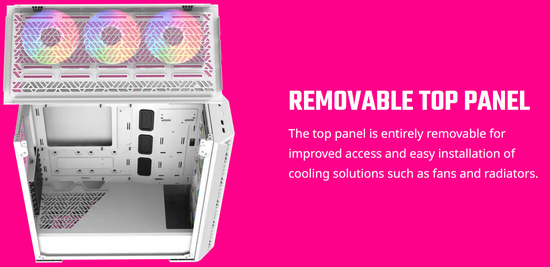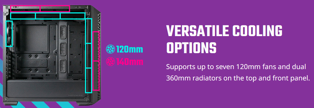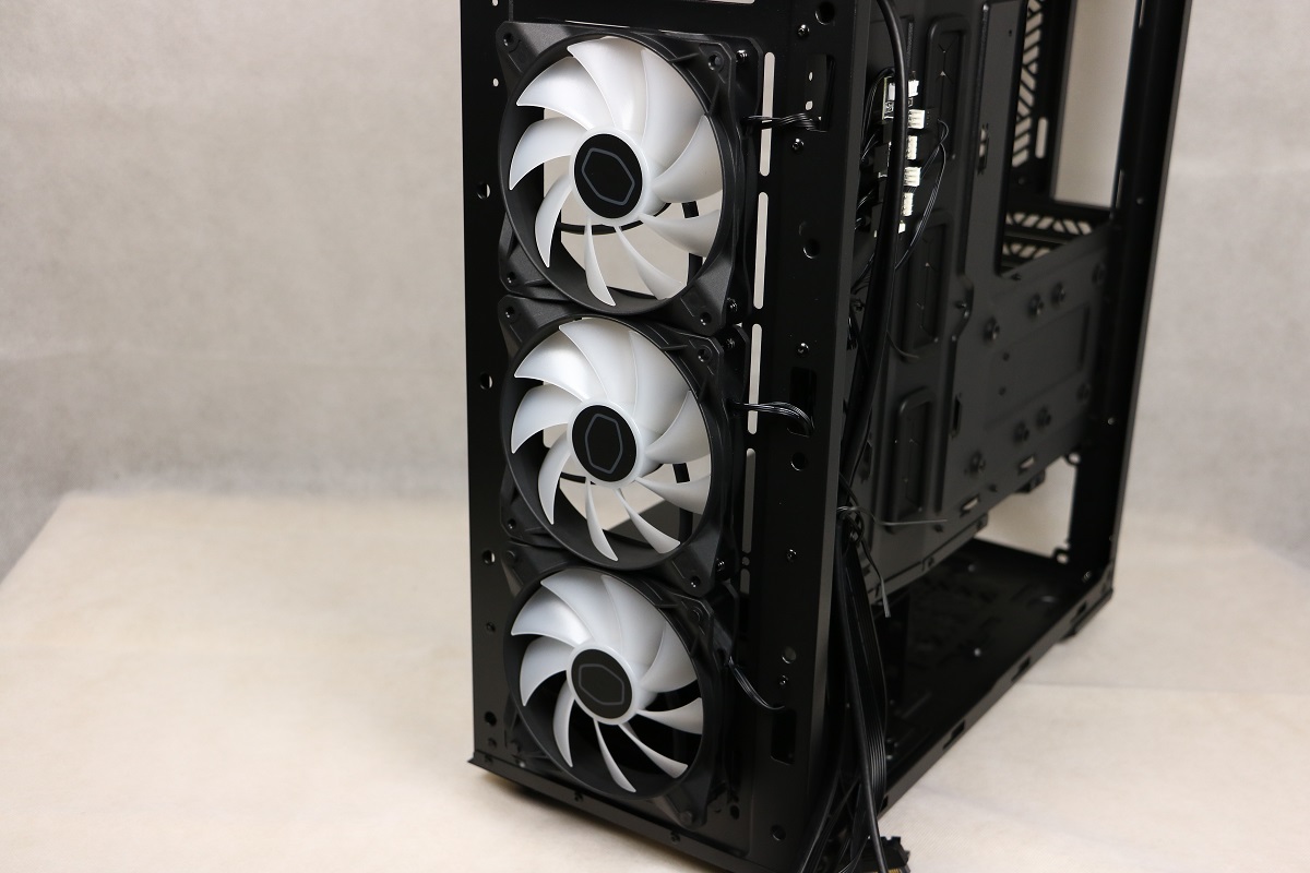 De kast heeft sowieso veel koelopties. Niet alleen is de voorkant voorzien van mesh wat lucht door moet laten, de kast komt standaard met drie ARGB ventilatoren. In totaal kunnen er 7 120mm ventilatoren geplaatst worden. In plaats van ventilatoren kan je verschillende radiatoren in de kast kwijt. Het is mogelijk om twee 360mm radiatoren te plaatsen wat moet zorgen voor behoorlijk wat koeling. Maar kleiner is altijd mogelijk. Tevens passen 140mm ventilatoren in de kast, al is er dan slechts ruimte voor vier stuks.