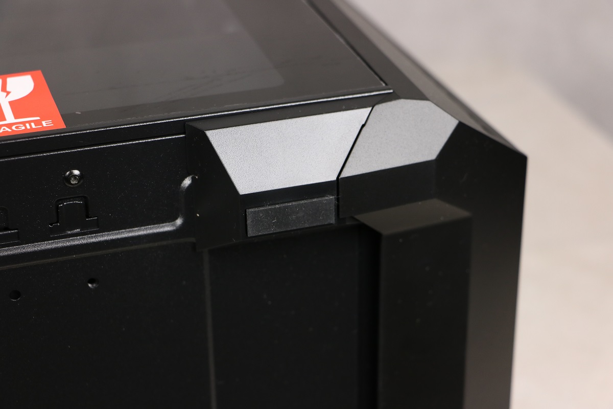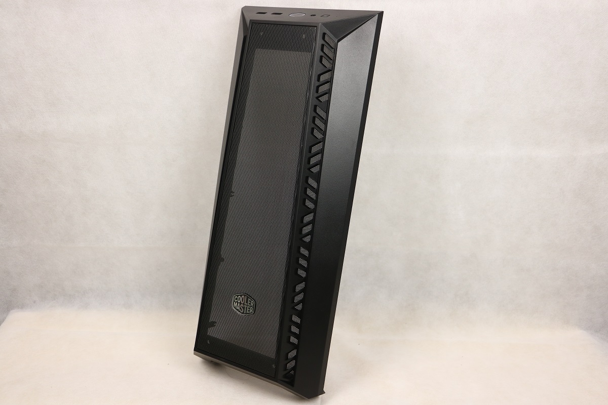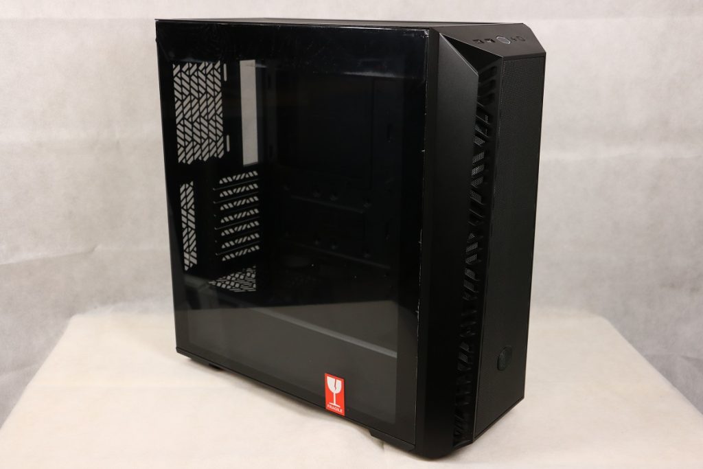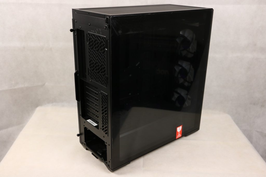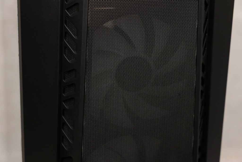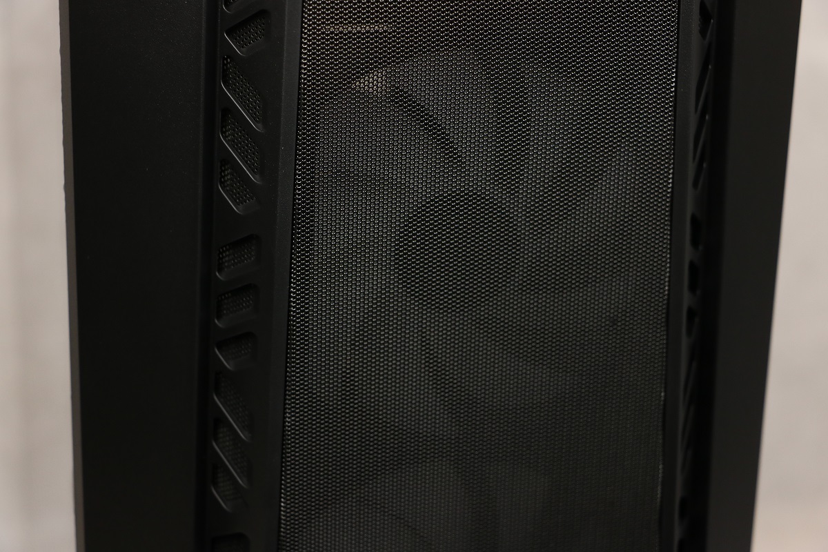 De kast is in het zwart uitgevoerd. Hier is niets mis mee maar bijna alle fabrikanten doen dit tegenwoordig. Het is bijna een standaard in de wereld van de computerkasten. Wel valt op dat er mesh aan de voorkant van de behuizing zit. Hier doorheen zien we al iets van ventilatoren zitten, daar komen we later in de review op terug. Overigens helt de voorkant iets naar voren waardoor de knoppen iets schuin komen te staan. De rechterkant van de kast heeft een aluminium plaat terwijl de linkerkant van de kast voorzien is van een Tempered Glass paneel. Dit is in het verleden wel anders geweest. Op deze plaat is ook te zien dat het breekbaar is, wat vrij logisch is met glas.