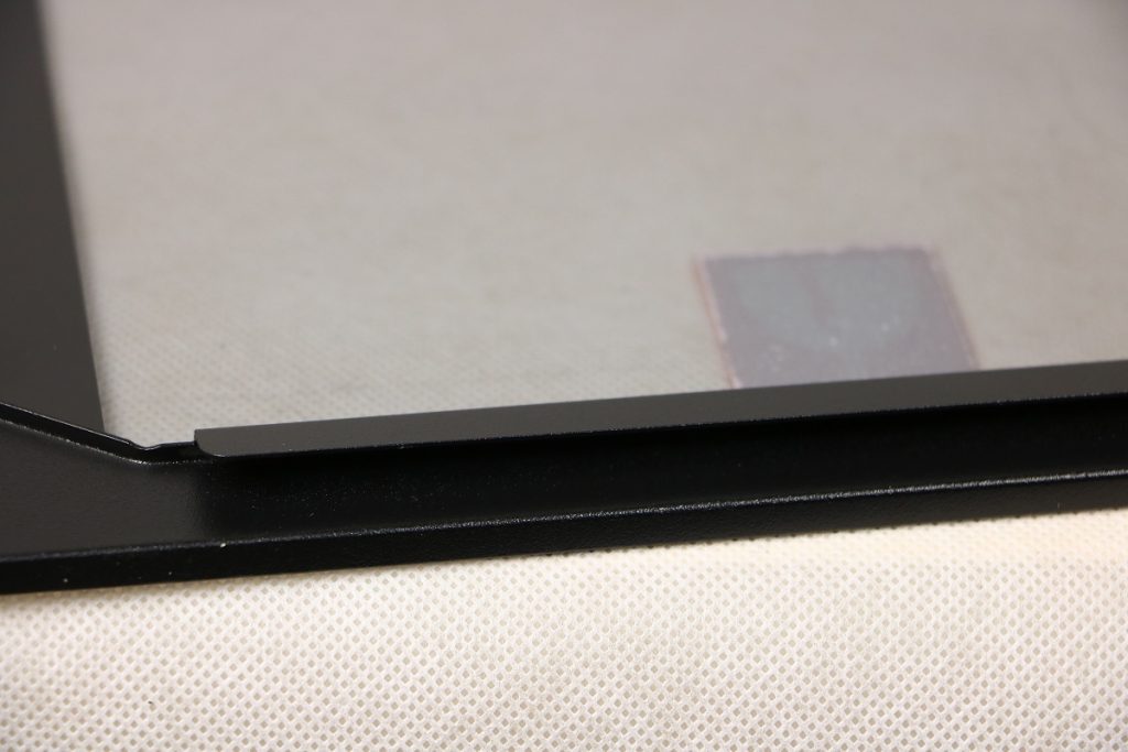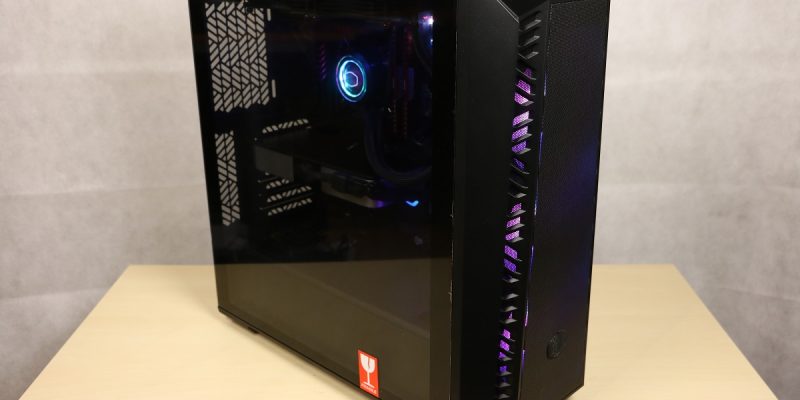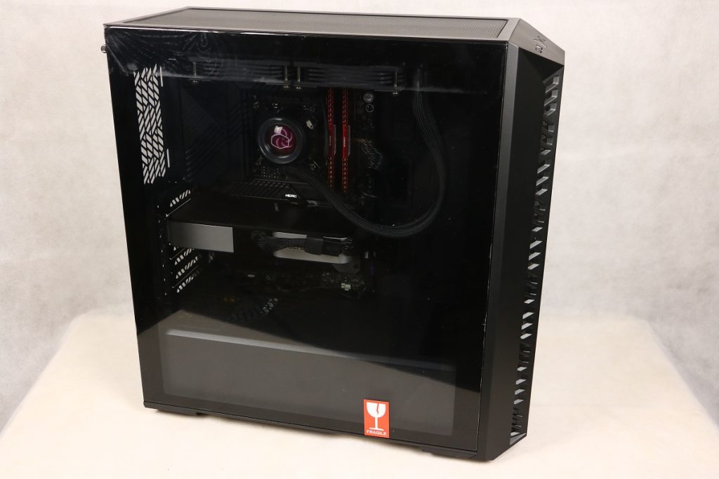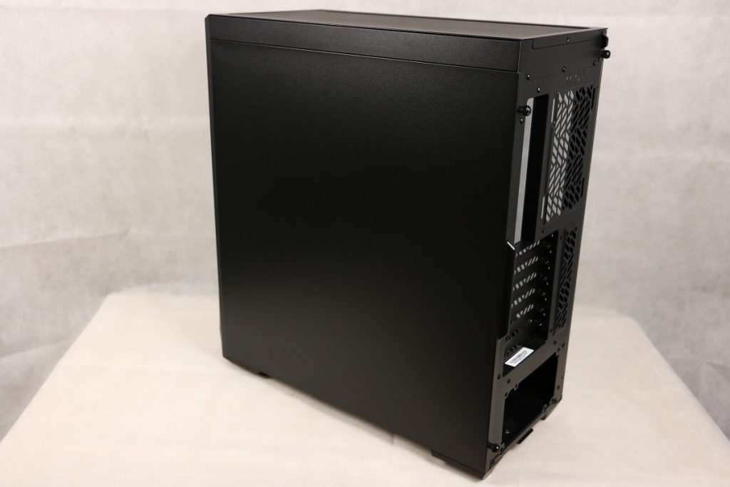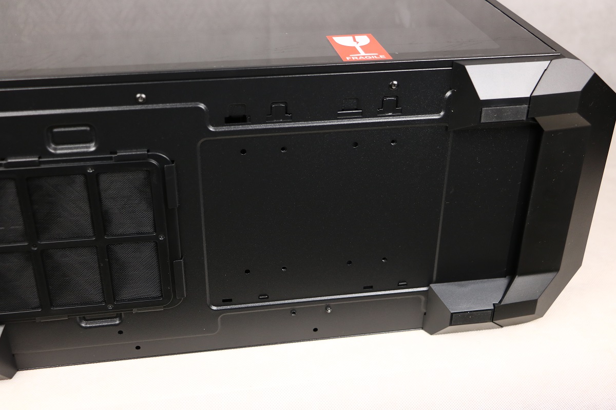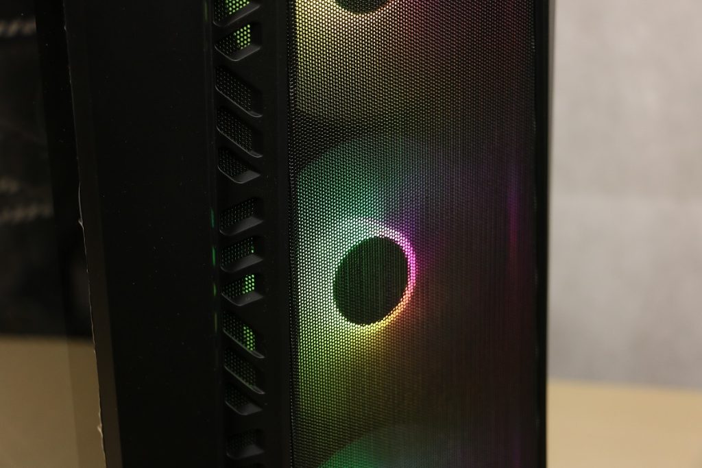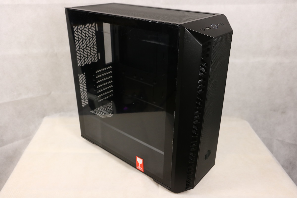 De kast is in het zwart uitgevoerd. Hier is niets mis mee maar bijna alle fabrikanten doen dit tegenwoordig. Het is bijna een standaard in de wereld van de computerkasten. Wel valt op dat er mesh aan de voorkant van de behuizing zit. Hier doorheen zien we al iets van ventilatoren zitten, daar komen we later in de review op terug. Overigens helt de voorkant iets naar voren waardoor de knoppen iets schuin komen te staan. De rechterkant van de kast heeft een aluminium plaat terwijl de linkerkant van de kast voorzien is van een Tempered Glass paneel. Dit is in het verleden wel anders geweest. Op deze plaat is ook te zien dat het breekbaar is, wat vrij logisch is met glas.