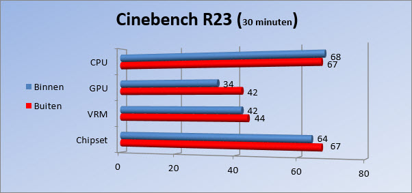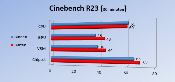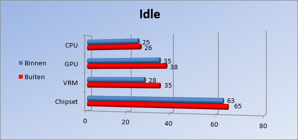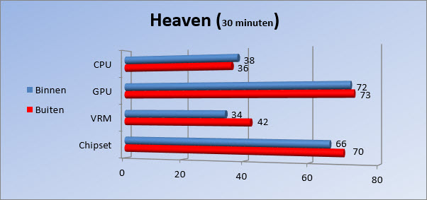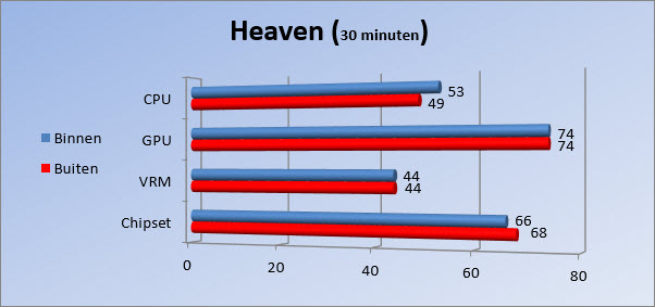 We bouwen de kast om van een waterkoeler naar een luchtkoeler. Wanneer we dan de pc alleen maar aan hebben staan dan zien we dat de processor temperatuur een paar graden warmer wordt dan dat deze buiten de kast draait. Echter wordt de videokaart enorm goed gekoeld want hier zakt de temperatuur maar liefst 9 graden. Ook de chipset wordt 4 graden koeler wat echt te danken is aan de airflow. Starten we Cinebench dan zien we hetzelfde resultaat terug: de processor wordt ietsjes warmer terwijl de overige componenten (flink) wat koeler worden. In Heaven wordt alleen de CPU wat warmer terwijl de rest ongeveer gelijk blijft qua waarde. En Doom dan: de scores daar zijn vergelijkbaar met die van Heaven. Het zijn desondanks keurige scores wat de kast neerzet, al zal een extra fan de waardes misschien nog wat extra verlagen.