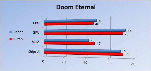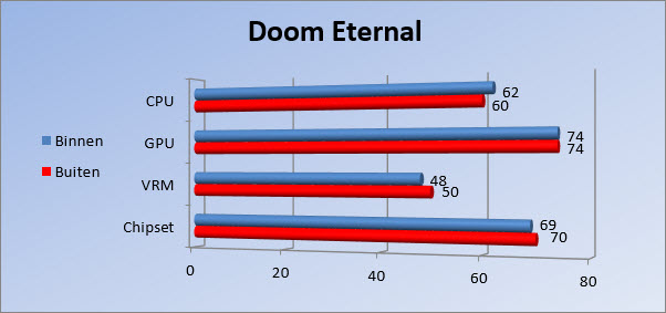We beginnen het testen met de opstelling die we zojuist gebouwd hebben, dus met de waterkoeler. Alle temperaturen zijn lager in de kast dan dat ze buiten de kast getest zijn. Vooral de VRM’s worden een stuk koeler. In Cinebench bijft de temperatuur van de processor nagenoeg gelijk maar de overige temperaturen vallen een stuk lager uit. De airflow doet hier goede zaken voor de koeling van de onderdelen. In Heaven wordt de processor ietsjes warmer (wat op zich niet zo gek is) maar ook hier zien we dat temperaturen lager liggen. De VRM’s worden maar liefst 8 graden koeler wat een behoorlijke afname is. De daling zien we ook terug bij Doom Eternal. De overige waardes verschillen niet veel van elkaar.
