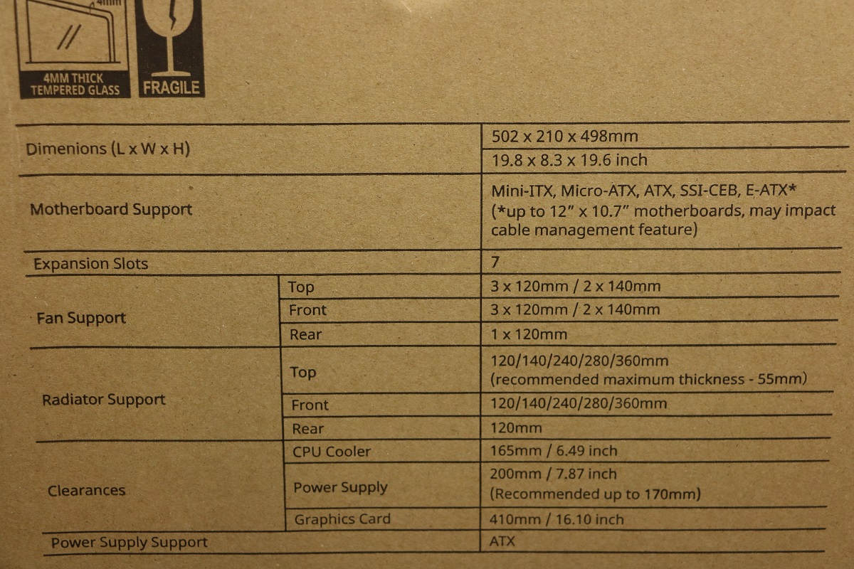 De kast is 49,9 bij 21 bij 49,8 centimeter groot. Er kunnen verschillende soorten moederborden in gebouwd worden, zelfs tot en met een E-ATX moederbord. Let er wel op dat het formaat ook daadwerkelijk past. E-ATX heeft niet echt een standaard maat waar het aan moet voldoen. Verder is er ruimte voor een koeler van 16,5 centimeter hoog, een voeding van maximaal 20 centimeter (al wordt 17 centimeter aangeraden) en een videokaart kan maximaal 41 centimeter lang zijn. Er is helaas niets bekend over het gewicht. Er kunnen maximaal twee 3.5 inch schijven geplaatst worden en drie 2.5 inch schijven.