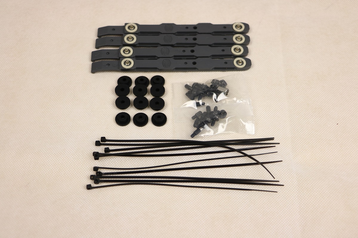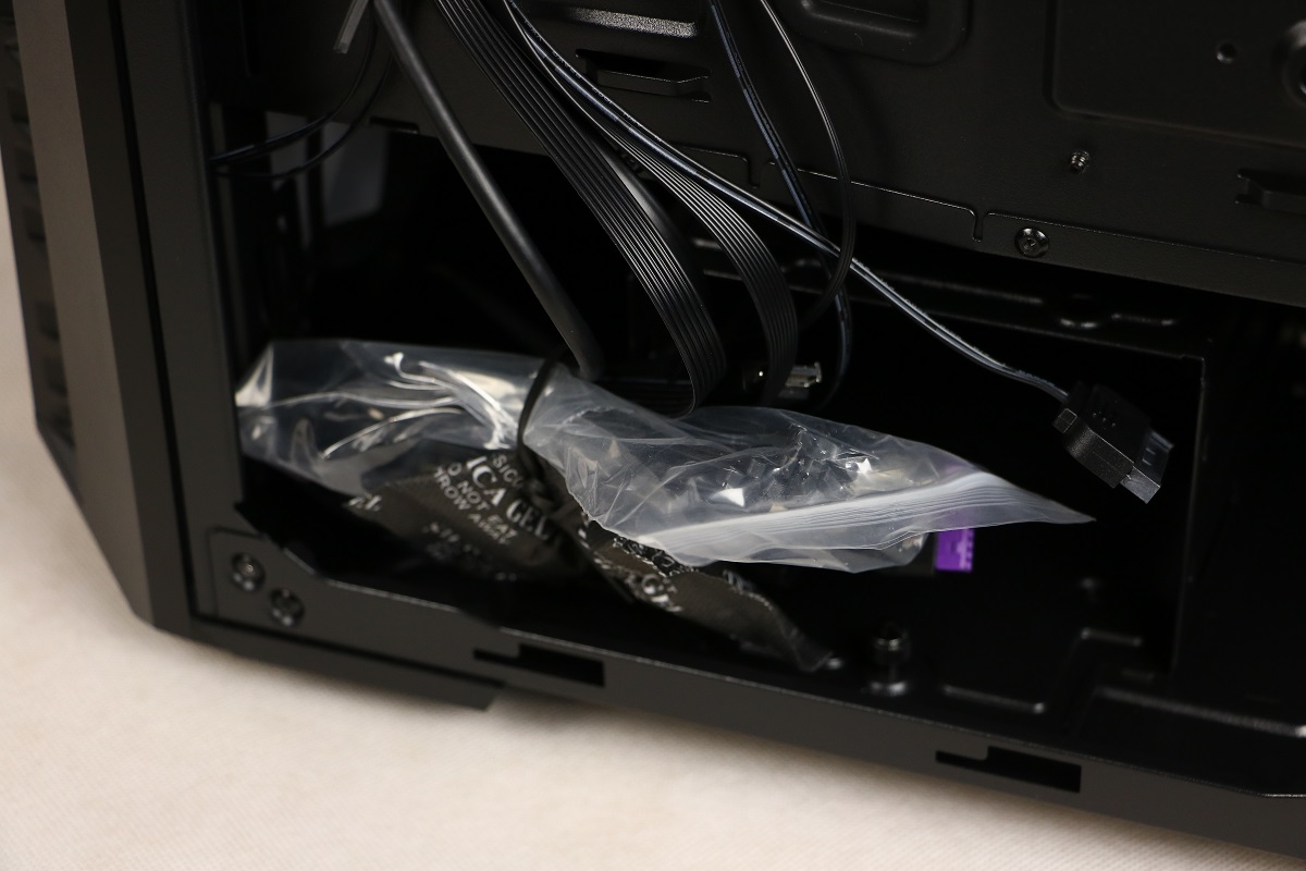 We kijken voor de losse onderdelen niet naar de kant met het glas maar naar de kant waar de stalen plaat zit. Daarachter, bij de harde schijf kooi, vinden we een zak met onderdelen. Gaan we deze bekijken dan vinden we daar een handleiding samen met wat accessoires. De handleiding vermeldt wat er allemaal geleverd wordt en hoe een en ander geïnstalleerd moet worden. De onderdelen zijn schroefjes om de schijven en het moederbord te plaatsen, de brackets voor de 3.5 inch schijven en wat tie wraps om de kabels netjes bij elkaar te binden. Ook zien we rubbers om voor iets van demping te zorgen waardoor de trillingen niet doorgegeven worden aan de kast.