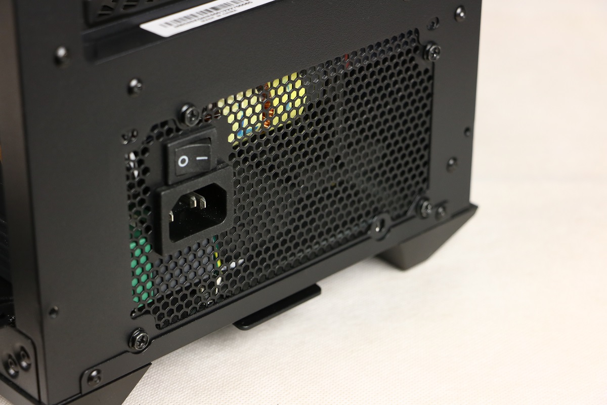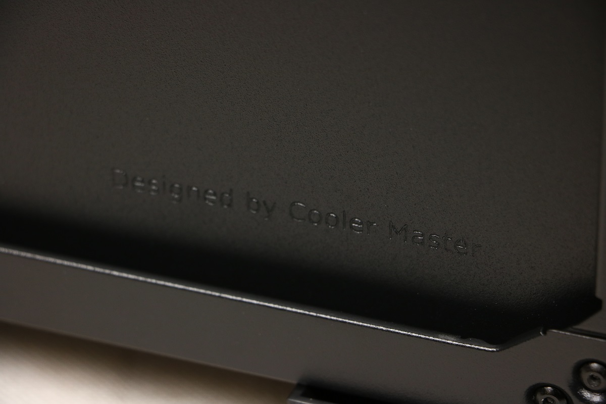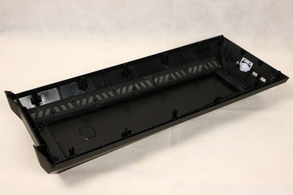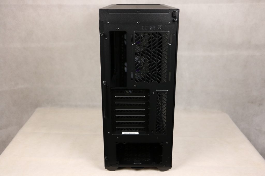 Als we de kast omdraaien dan zien we bij de achterkant van de kast onderin ruimte voor de voeding zitten. Deze wordt in de tunnel gemonteerd zodat warme lucht niet bij de componenten komt. Er is geen speciaal mechanisme voor montage of iets van demping. Daarboven zitten de sloten voor de uitbreidingskaarten. Tegenwoordig vinden we hier alleen videokaarten maar het kan handig zijn om eventueel een WIFI kaart of een aparte netwerkkaart in te prikken. Daarboven vinden we ruimte voor een 120mm ventilator. Cooler Master levert deze standaard niet mee dus mocht je er één willen gebruiken dan moet je deze los aanschaffen. Links daarvan hebben we de plek waar de I/O straks te vinden is. Dit valt ietsjes in de kast zodat kleine uitstekende delen niet meteen in de weg zitten. Aan de voorkant van de kast zien we de ventilatoren door het mesh heen. Hier is straks ook de verlichting te zien. Uiteraard mag het logo van Cooler Master niet op de kast ontbreken.