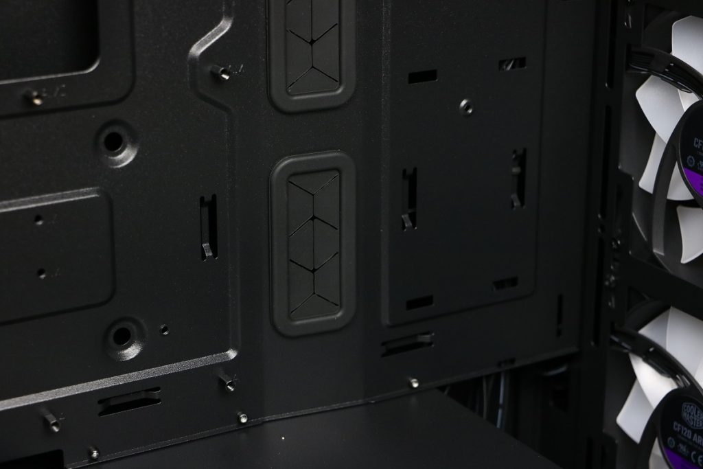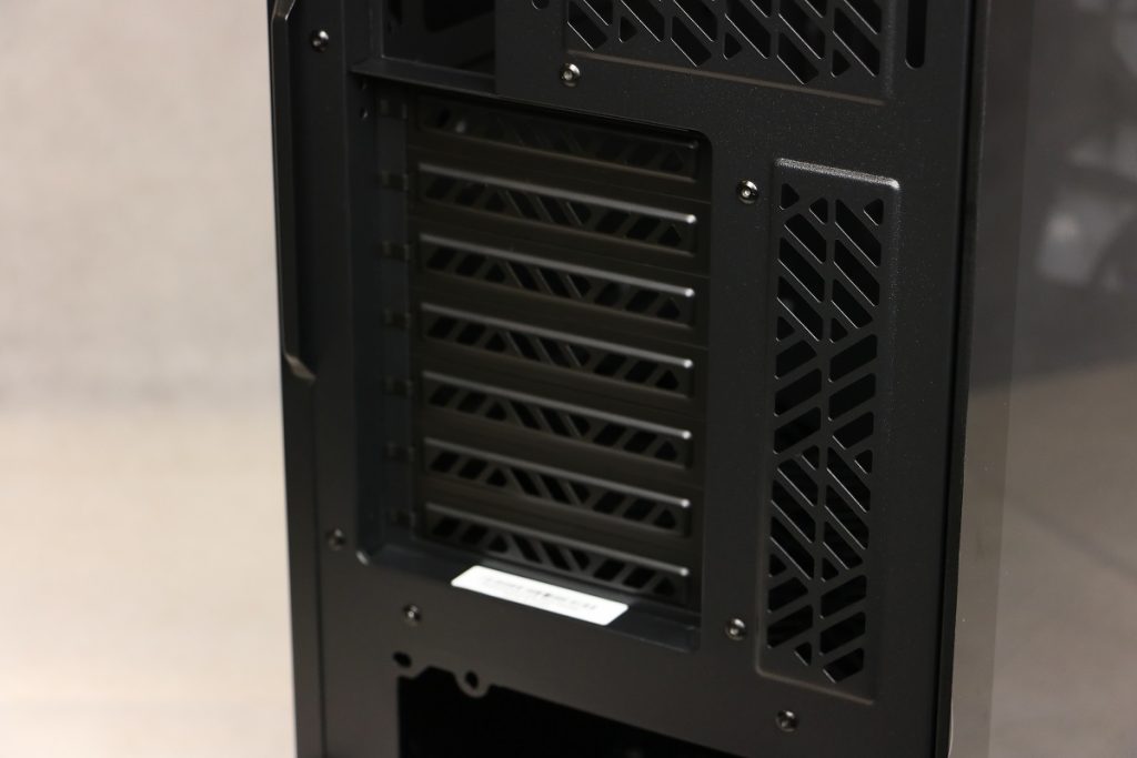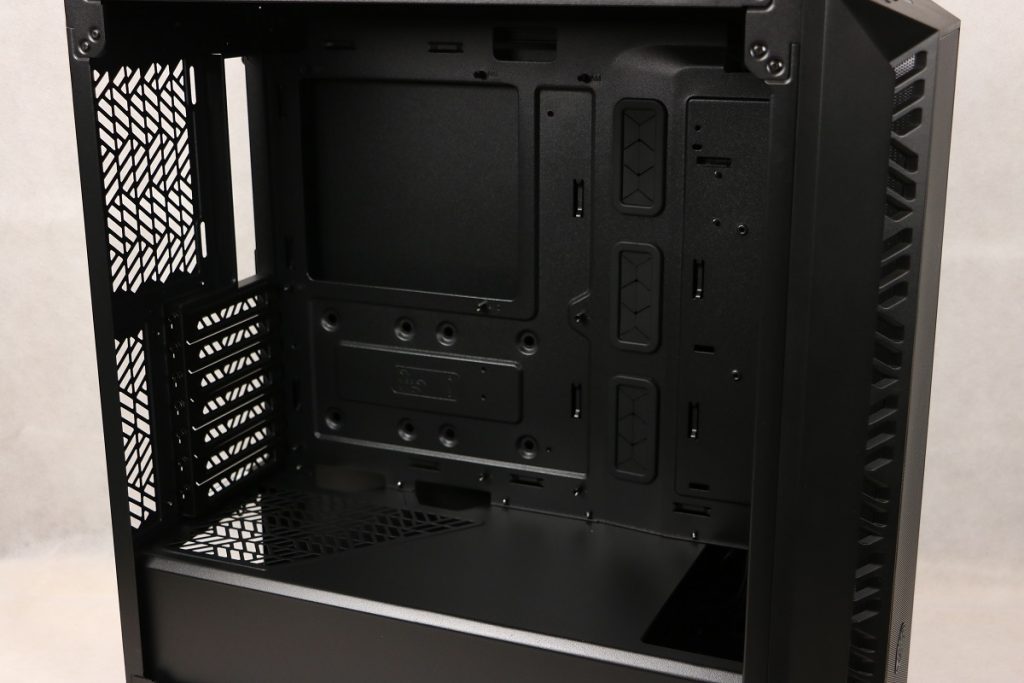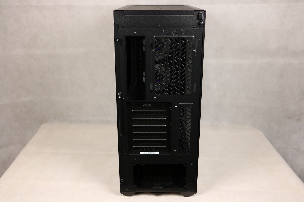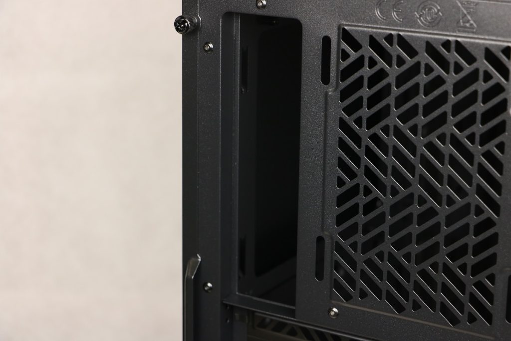 Nu het glas weg is zien we de binnenkant van de kast wat beter. Hier vinden we een aantal openingen voor diverse doeleinden. Het geheel is mooi zwart afgewerkt, iets wat redelijk standaard is tegenwoordig. In de tunnel van de voeding zien we een rooster die kan zorgen voor meer luchtstroom richting de voeding. Dat is echter wel afhankelijk van hoe de voeding geplaatst is in de kast. Verder zien we openingen voor kabels maar deze zijn helaas niet afgewerkt met rubber. De randen zijn echter niet scherp. Ook zien we op de tunnel staan dat de kast ontworpen is door Cooler Master, mocht dat nog niet duidelijk zijn. Op de achterkant hebben we de sloten zitten voor de uitbreidingskaarten. Ook hier zitten ventilatiegaten in voor extra luchtstroom. De sloten zitten vast met schroeven en niet met duimschroeven. Niet heel erg maar zou wel handig zijn als dit anders was. Boven deze sloten zien we weer een rooster.. Hier zou ik eigenlijk een ventilator verwachten maar die wordt niet geleverd door Cooler Master. Jammer want dat zou het plaatje wel compleet maken.
