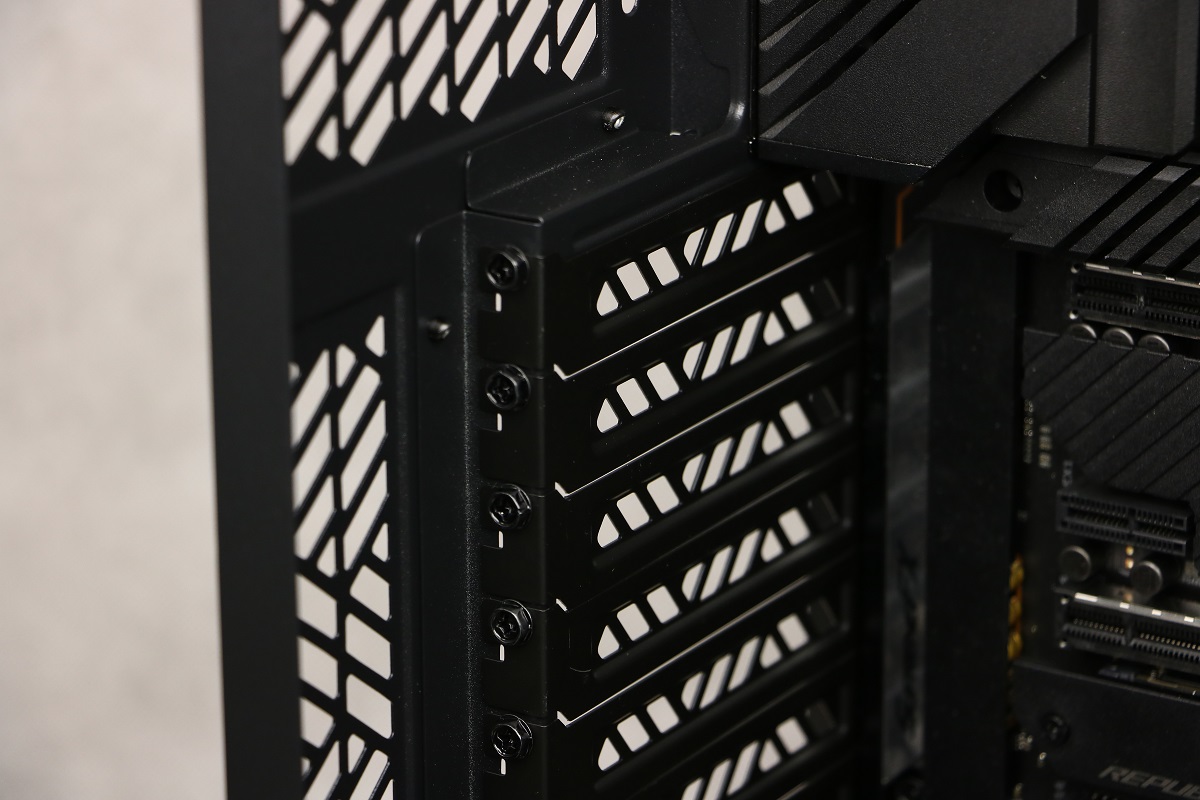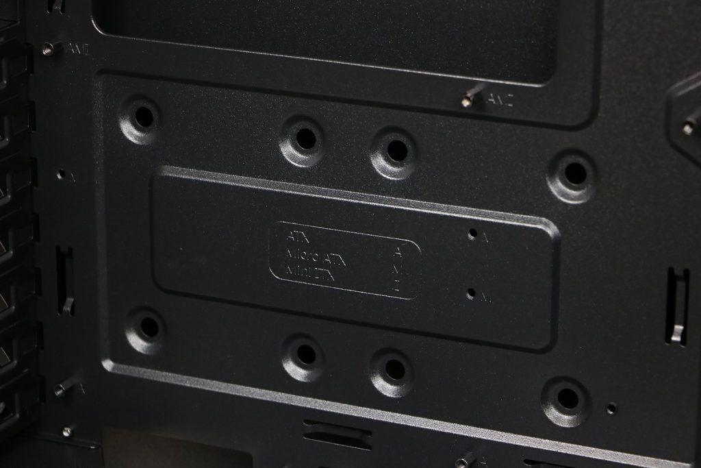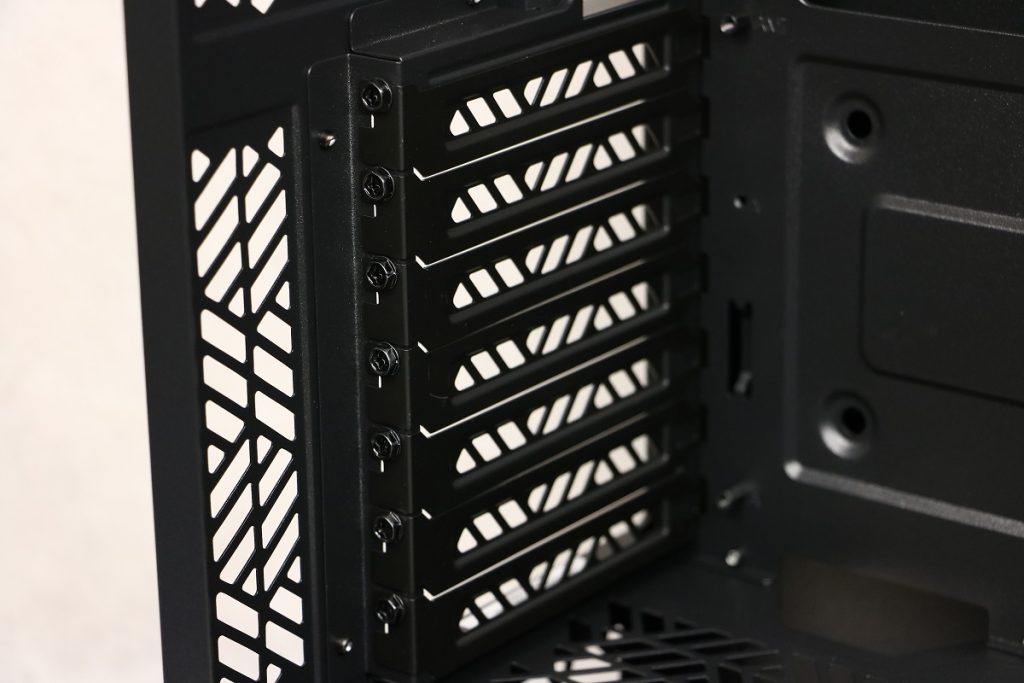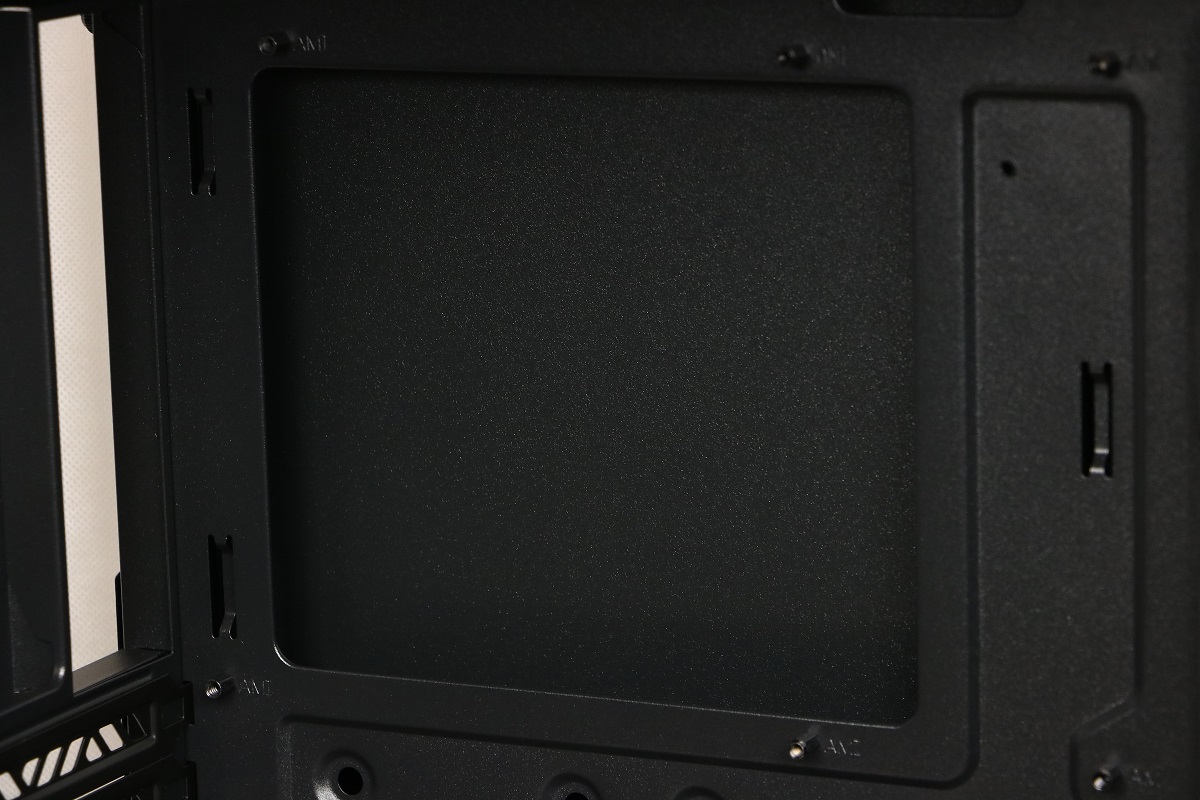 Nu het glas weg is zien we de binnenkant van de kast wat beter. Hier vinden we een aantal openingen voor diverse doeleinden. Het geheel is mooi zwart afgewerkt, iets wat redelijk standaard is tegenwoordig. In de tunnel van de voeding zien we een rooster die kan zorgen voor meer luchtstroom richting de voeding. Dat is echter wel afhankelijk van hoe de voeding geplaatst is in de kast. Verder zien we openingen voor kabels maar deze zijn helaas niet afgewerkt met rubber. De randen zijn echter niet scherp. Ook zien we op de tunnel staan dat de kast ontworpen is door Cooler Master, mocht dat nog niet duidelijk zijn. Op de achterkant hebben we de sloten zitten voor de uitbreidingskaarten. Ook hier zitten ventilatiegaten in voor extra luchtstroom. De sloten zitten vast met schroeven en niet met duimschroeven. Niet heel erg maar zou wel handig zijn als dit anders was. Boven deze sloten zien we weer een rooster.. Hier zou ik eigenlijk een ventilator verwachten maar die wordt niet geleverd door Cooler Master. Jammer want dat zou het plaatje wel compleet maken.