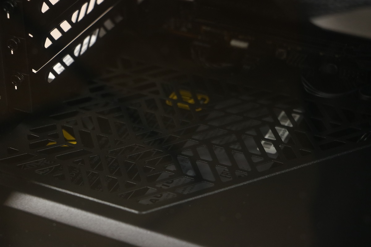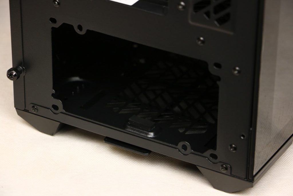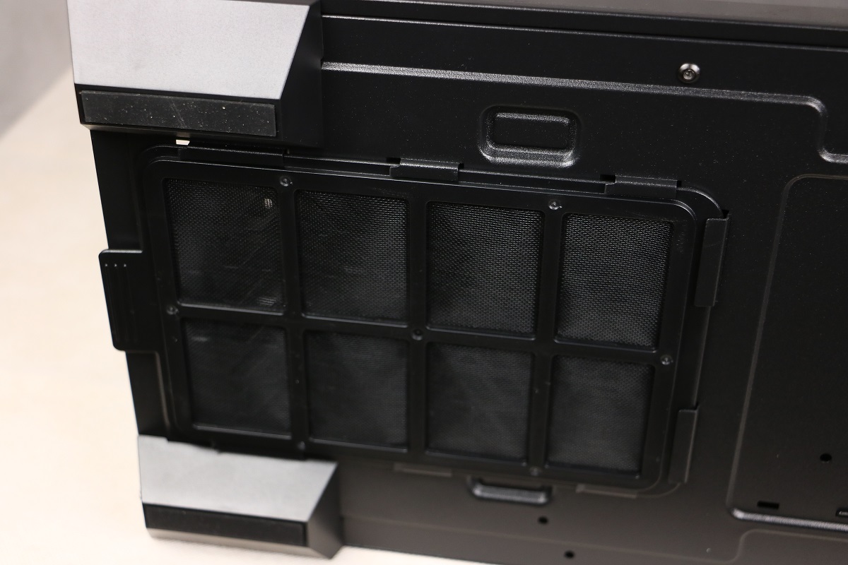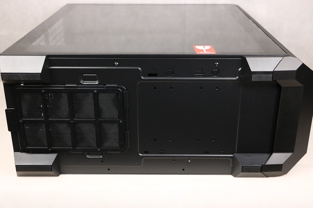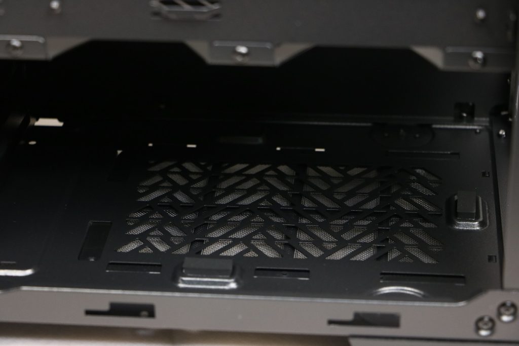 Bovenop de kast vinden we een stoffilter wat moet voorkomen dat de computer een stofnest wordt. Nu is het wel dat eventuele ventilatoren hier normaal lucht naar buiten blazen maar het kan nooit kwaad om hier een filter te hebben. Deze is makkelijk te verwijderen zodat er ventilatoren of een radiator geplaatst kunnen worden. Als we de onderkant bekijken dan zien we één stoffilter zitten bij de plek van de voeding. Deze kan alleen via de achterkant verwijderd worden wat een lastige richting is om hem los te halen. Makkelijker zou zijn via de zijkant. De voetjes onder de kast bevatten een rubber laag zodat de kast niet weg kan glijden. Deze voetjes zijn ook best breed en aan de voorkant zijn ze gelijk getrokken met de voorkant. We zien hier ook een gedeelte van de schijfkooi zitten. Hier is goed te zien dat de kooi op twee plekken geplaatst kan worden maar hij kan ook weggehaald worden.