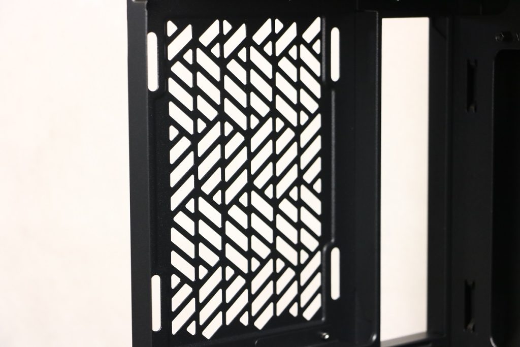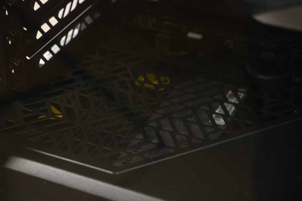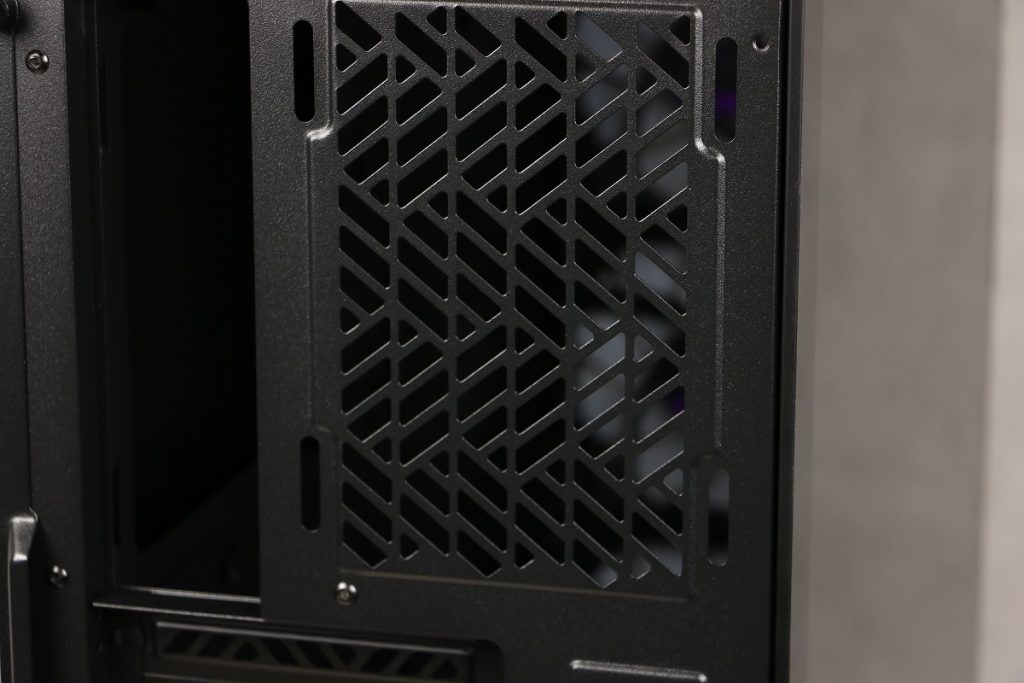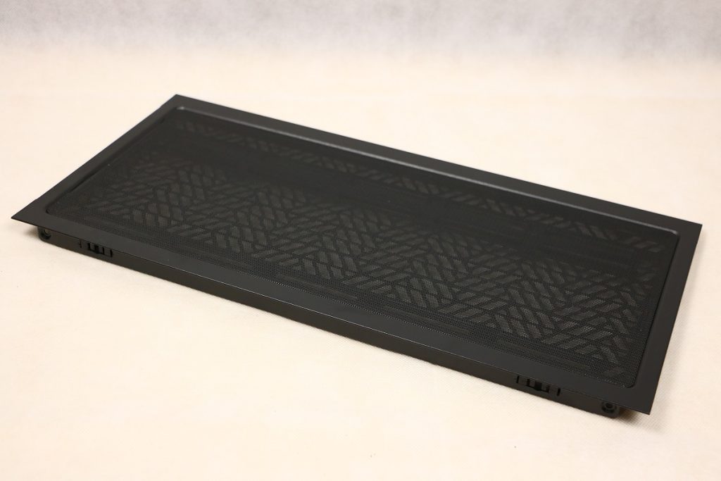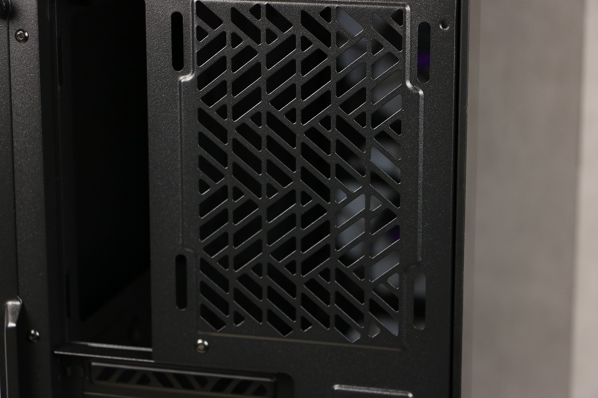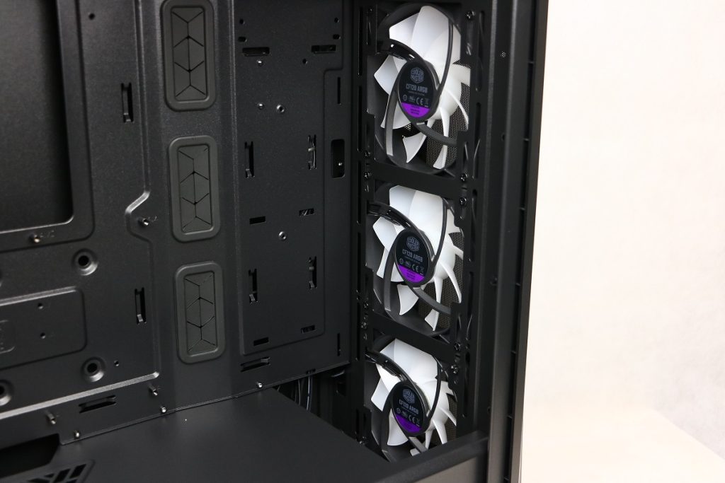 Kijken we als laatste nog naar de voorkant van de kast. Daar zien we een kap op zitten die vrij makkelijk te verwijderen is. Achter de kap zitten de drie ventilatoren verstopt waarvan de buitenkant zwart is en de bladen wit zijn uitgevoerd. De bovenste twee zijn met schroeven vastgezet maar de onderste ventilator is met een pushpin vastgemaakt. Waarom Cooler Master dit gedaan heeft is mij onduidelijk. Bovenin zien we de verschillende I/O poorten zitten maar ook de knoppen voor de aan/uit schakelaar en de verlichting. De kap zelf is voorzien van een strak mesh paneel wat netjes op elkaar aansluit. Aan de andere kant van de kap is niet zoveel spannends te zien.