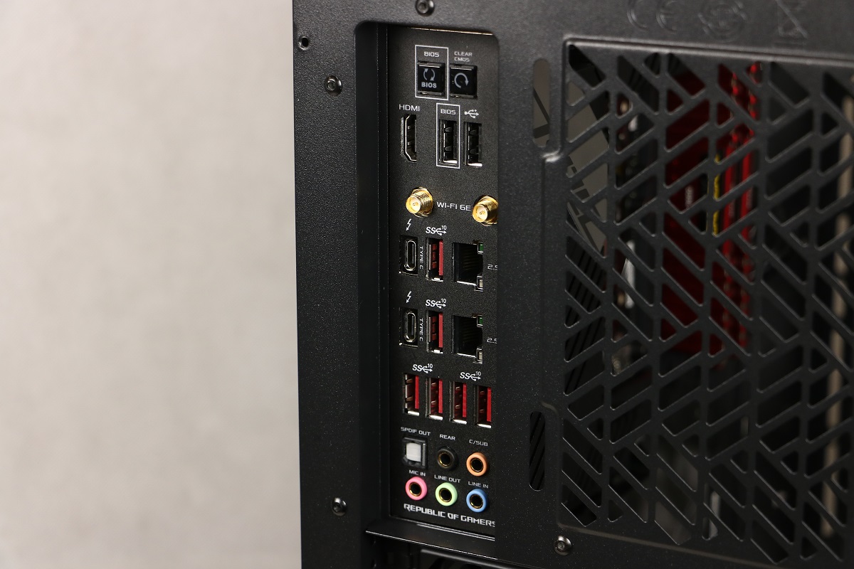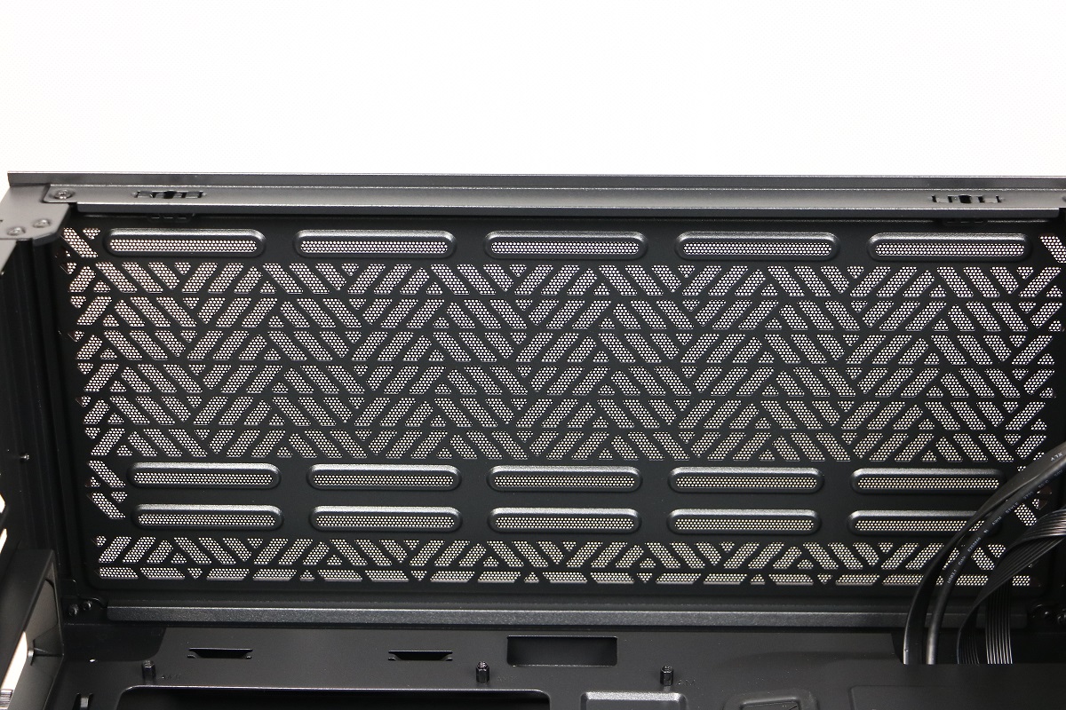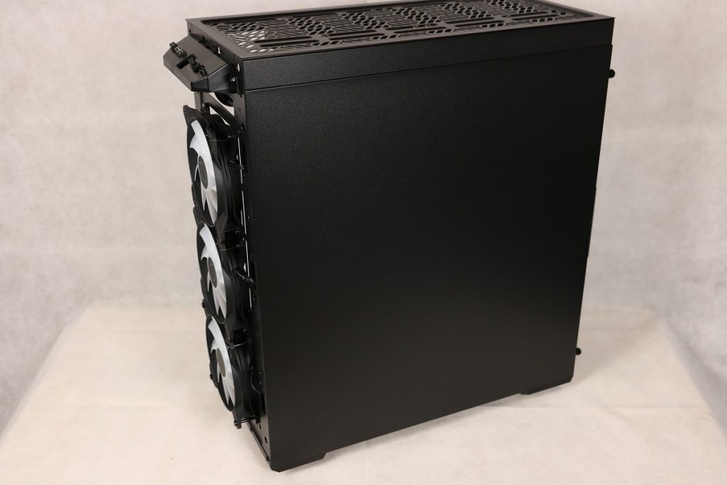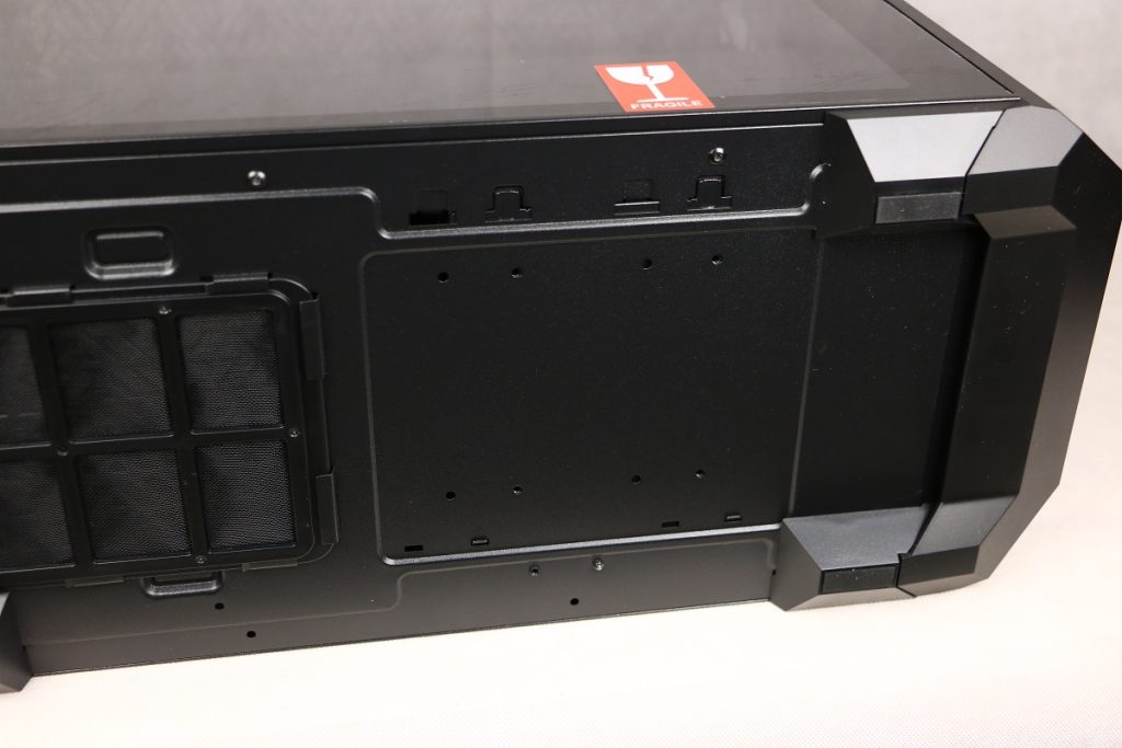 Aan de zijkant van de kast treffen we een grote opening aan. Dit is gedaan zodat, wanneer het moederbord in de kast geschroefd zit, de koeler losgehaald en eventueel vervangen kan worden. De opening is groot genoeg en zit niet in de weg. Onder dit gat zien we 8 gaten zitten. Dit is de plek voor rubbers waar je SSD’s aan de andere kant van de kast in vast kan prikken. Hier straks meer over. Kijken we verder naar links dan komen we daar drie ventilatoren tegen die moeten zorgen dat er koele lucht de kast ingeblazen wordt en de componenten niet te warm worden. Deze zijn nu wit maar kunnen van kleur veranderen. Hier is ruimte voor een 360 millimeter radiator als je besluit waterkoeling te gaan gebruiken. In het zijpaneel hebben we wel rubbers voor de kabeldoorvoer. Zo worden kabels niet kapot gesneden en niet gebruikte openingen worden netjes afgedekt zodat hier geen lucht of vuil doorheen kan. Bovenin lopen een paar kabels die de aansluitingen aan de voorkant verbinden met het moederbord. Helaas is ook dit niet helemaal netjes afgewerkt. Wellicht was mooier geweest om deze kabels via de zijkant te laten lopen. Kijken we naar de bovenkant van de kast dan zien we een rooster waar ruimte is voor ventilatoren of een extra radiator. Het bijbehorende stoffilter hebben we al eerder gezien.