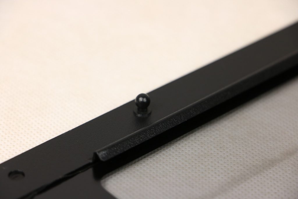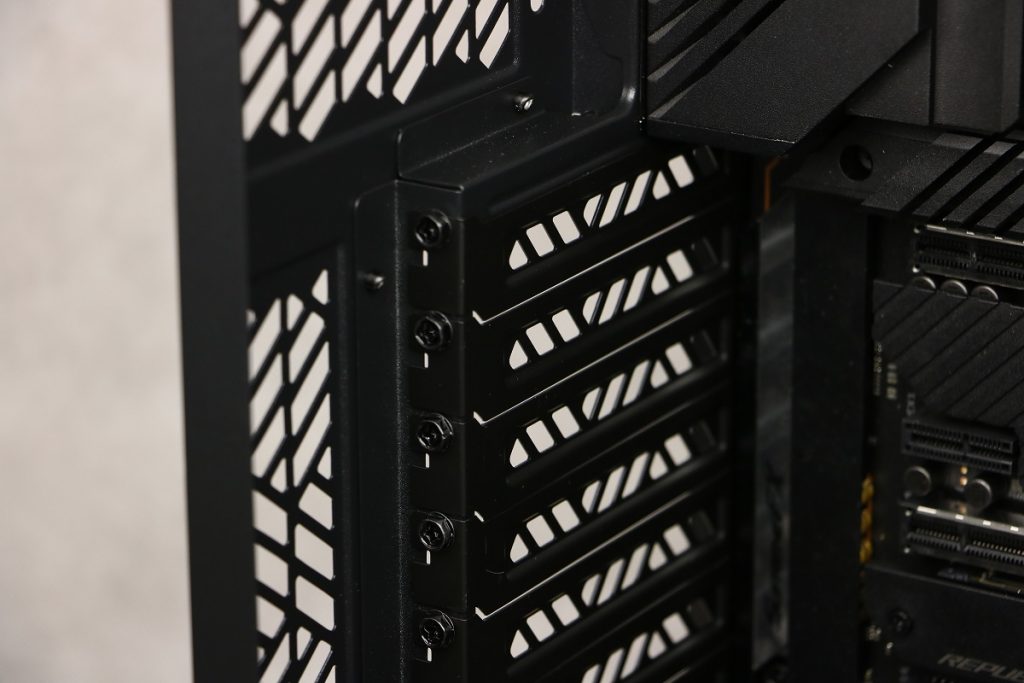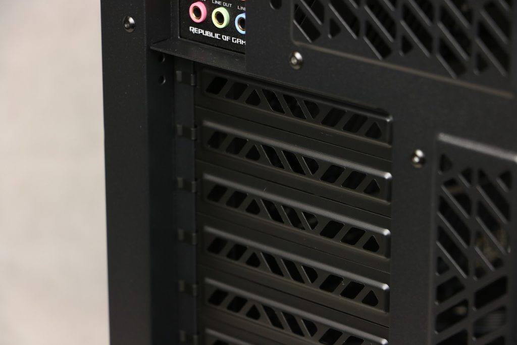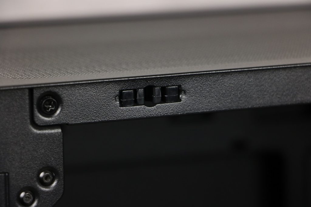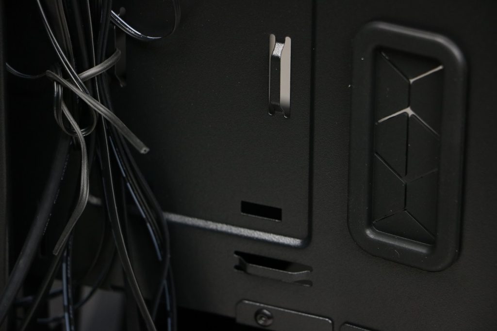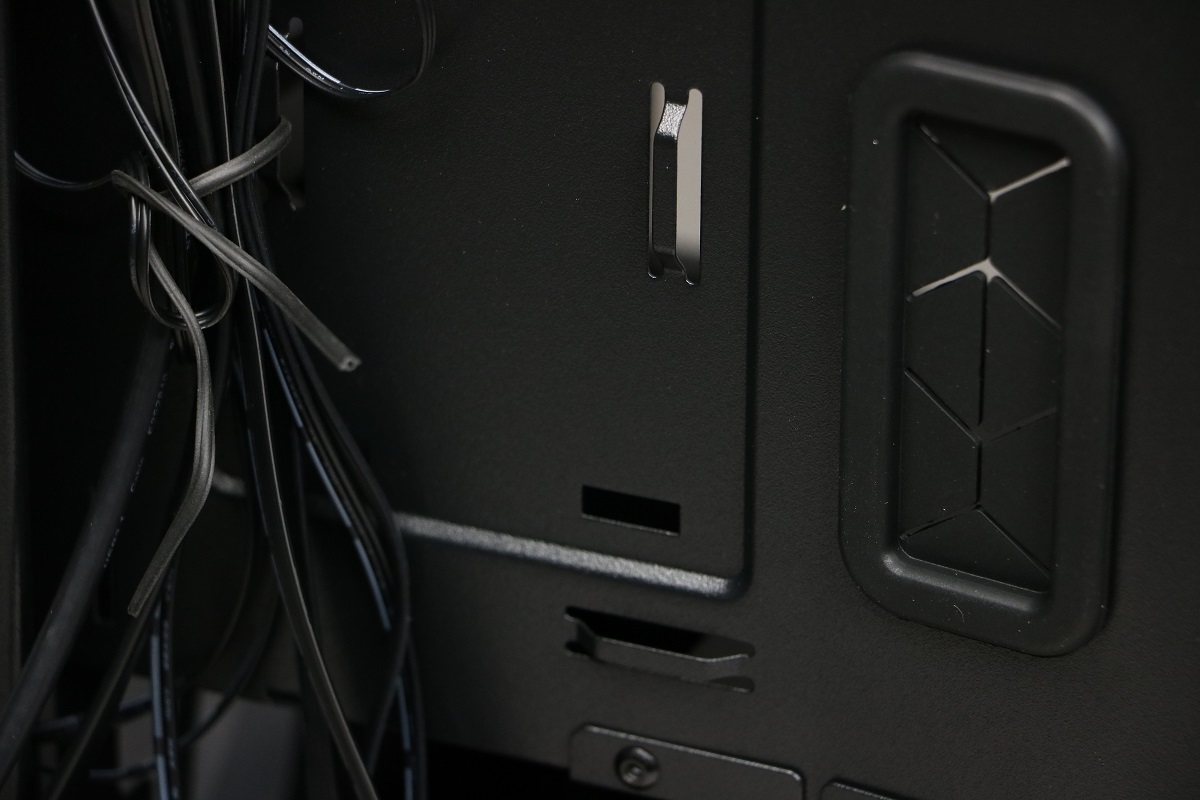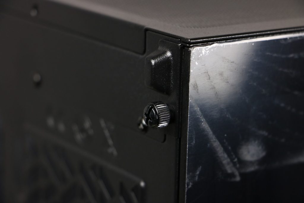 Om het glazen zijpaneel van de kast te halen is er niet meer nodig dan het loshalen van één duimschroef. Als deze los is kan het paneel van de behuizing losgetrokken worden. Deze zit namelijk met twee pushpins vastgeklikt aan de bovenkant. Dit is een mooie oplossing om een kast makkelijk te openen en aanpassingen aan het systeem te maken, ook al zal het niet vaak nodig zijn als het goed is. De onderkant van het paneel heeft een rand die in de onderkant van de kast kan haken zodat het paneel netjes op zijn plek terug geduwd kan worden.