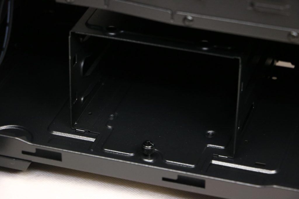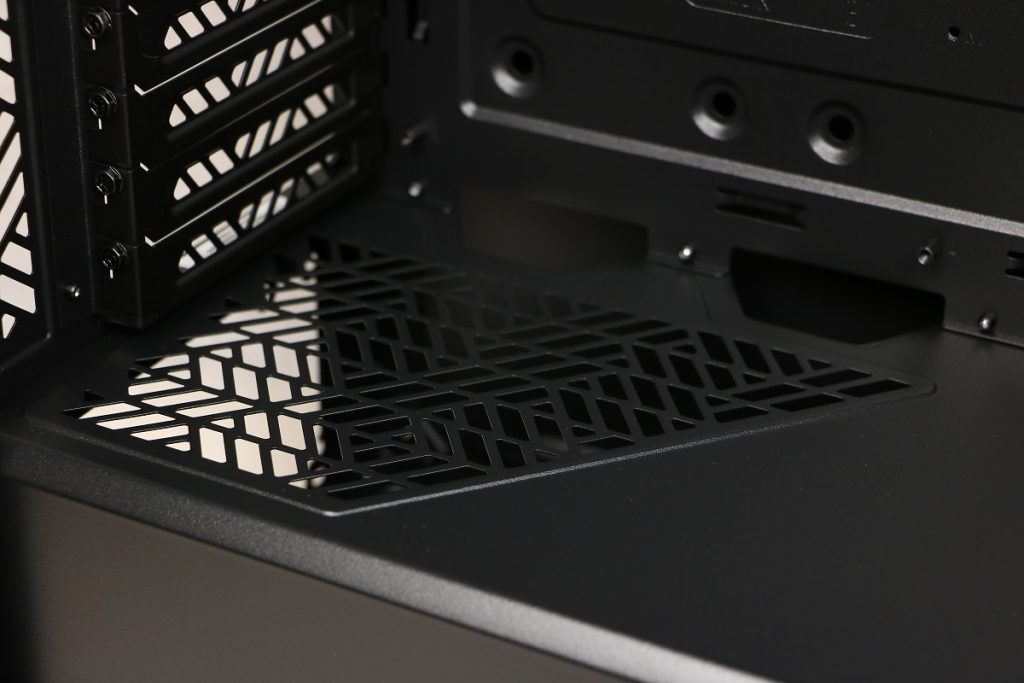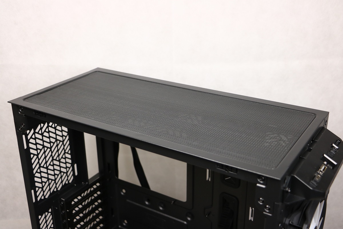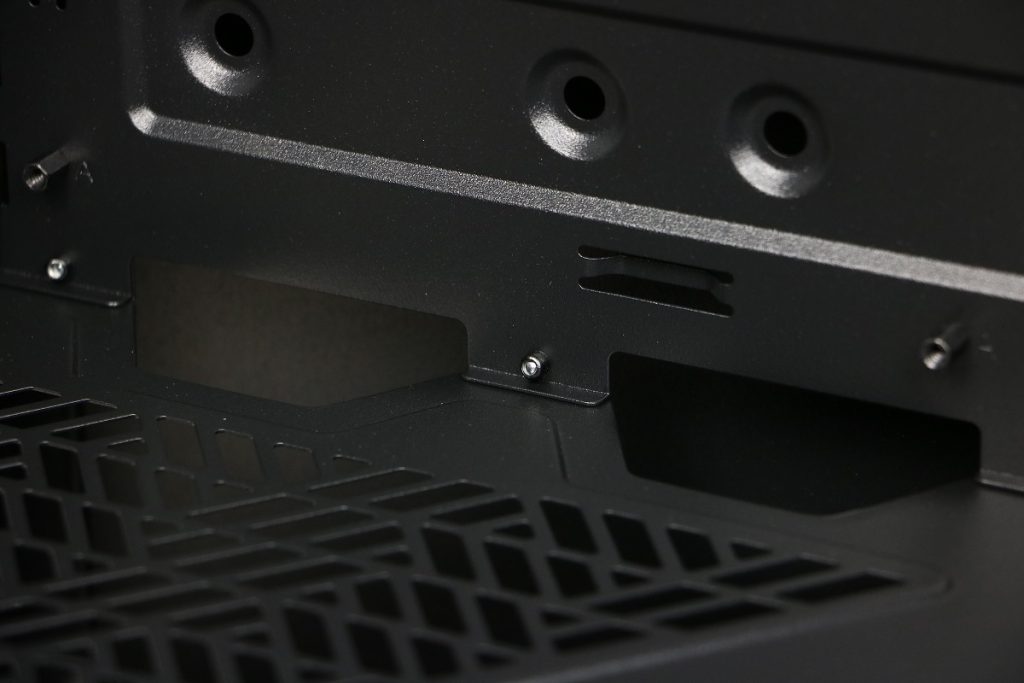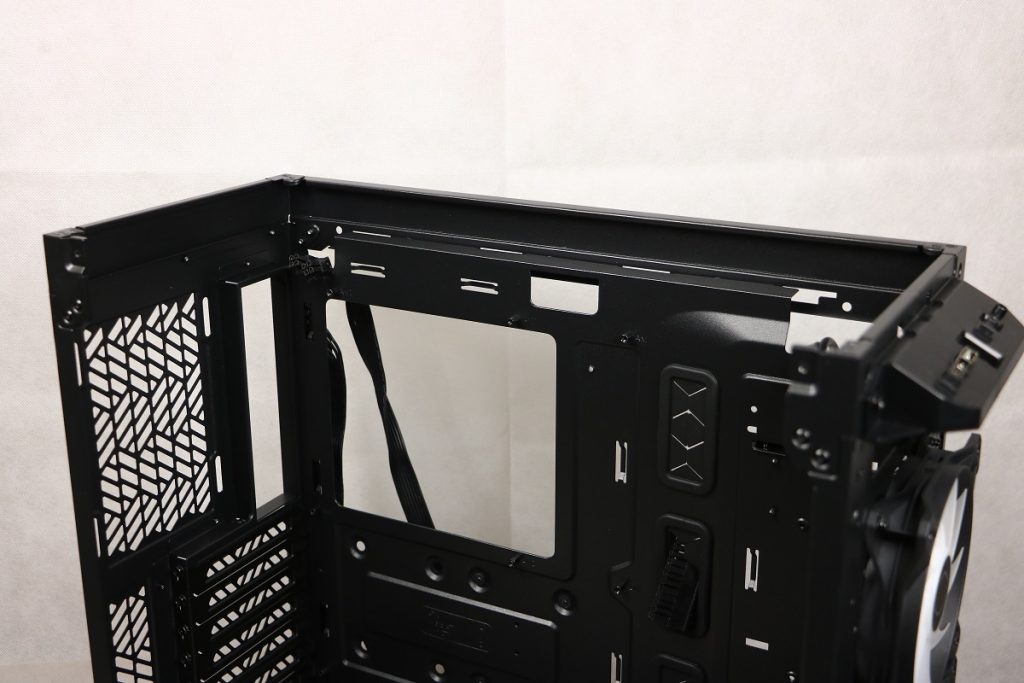 Er is genoeg ruimte aanwezig in de kast om een pc snel in te kunnen bouwen. De zijkanten van de kast zijn los te halen met duimschroeven, een schroevendraaier is standaard niet nodig. Wel kan het zijn dat de schroef vanuit de fabriek strak aangedraaid is. De zijkanten zitten verder vast met pushpins zodat deze niet zomaar van de kast vallen, ook al is de schroef los. Het meest handige aan de kast is dat de complete bovenkant los te halen is. Zo kunnen de kabels makkelijk op het moederbord aangesloten worden. Ook kan de radiator van een waterkoeler of een custom loop al op de bovenkant geschroefd worden zonder dat je capriolen moet uithalen (het vasthouden van de radiator, de schroevendraaier en de schroefjes). Wel is het handig dat, als je de bovenkant terug plaatst in de kast, de kabels aan de bovenkant allemaal aangesloten zijn. Als je dit nog moet doen wanneer de bovenkant er weer op zit dan is er heel weinig ruimte beschikbaar. Schijven zijn gelukkig wel makkelijk te plaatsen. Voor harde schijven en SSD’s is eigenlijk niet eens gereedschap nodig. De openingen aan het zijkant van het moederbord zijn netjes voorzien van rubber maar dit geldt niet voor de openingen aan de boven- en onderkant van de kast. De randen zijn niet scherp maar het zou het geheel wel afmaken. Kabels zijn weg te werken achter de stalen plaat van de kast, al houdt de hoeveelheid ruimte niet over. Een minpunt wat nog wel aangestipt moet worden is dat het stoffilter bij de voeding alleen maar via de achterkant losgehaald kan worden. De kast moet hiervoor dus van zijn plek gehaald worden. Het zou praktischer zijn om dit via de zijkant van de kast te doen.