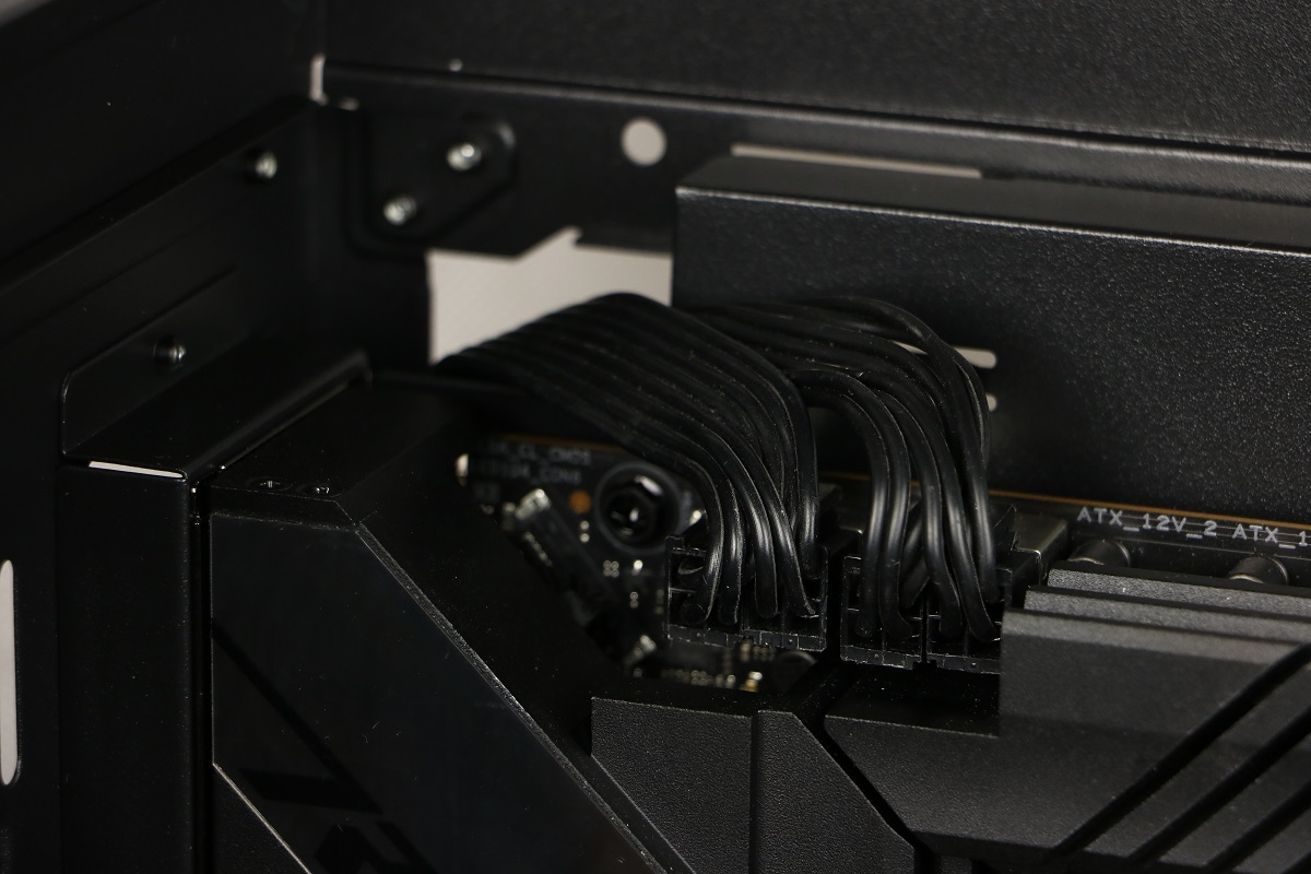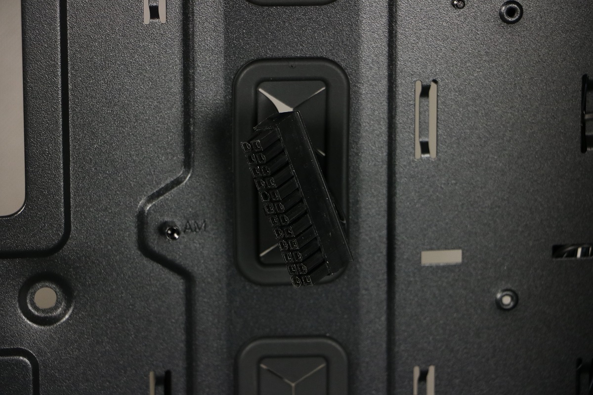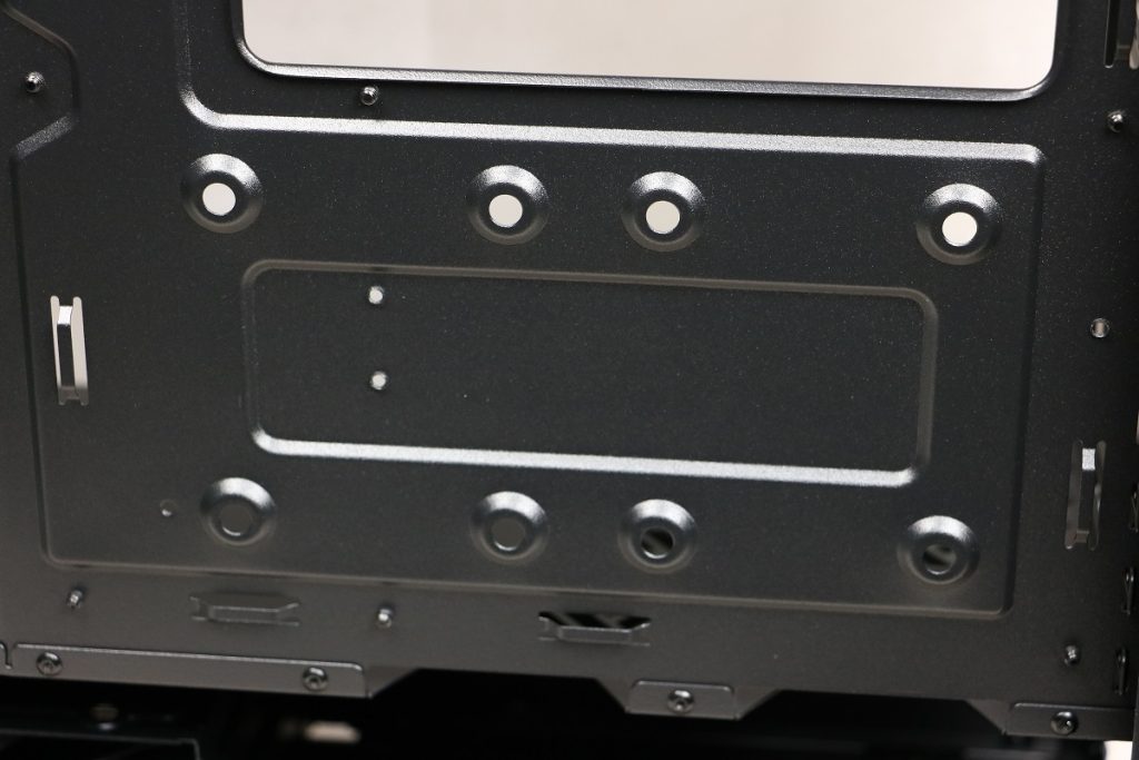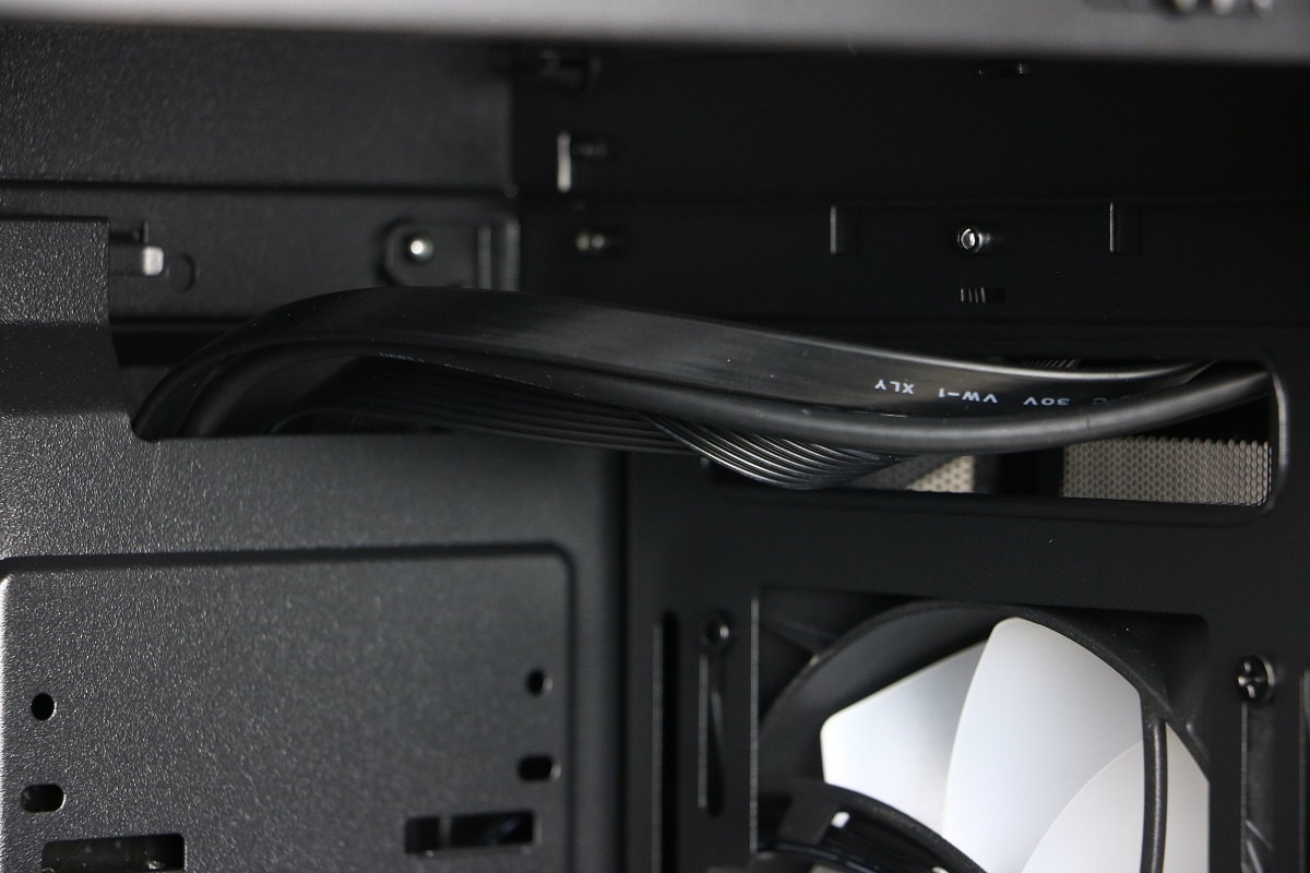 Er is genoeg ruimte aanwezig in de kast om een pc snel in te kunnen bouwen. De zijkanten van de kast zijn los te halen met duimschroeven, een schroevendraaier is standaard niet nodig. Wel kan het zijn dat de schroef vanuit de fabriek strak aangedraaid is. De zijkanten zitten verder vast met pushpins zodat deze niet zomaar van de kast vallen, ook al is de schroef los. Het meest handige aan de kast is dat de complete bovenkant los te halen is. Zo kunnen de kabels makkelijk op het moederbord aangesloten worden. Ook kan de radiator van een waterkoeler of een custom loop al op de bovenkant geschroefd worden zonder dat je capriolen moet uithalen (het vasthouden van de radiator, de schroevendraaier en de schroefjes). Wel is het handig dat, als je de bovenkant terug plaatst in de kast, de kabels aan de bovenkant allemaal aangesloten zijn. Als je dit nog moet doen wanneer de bovenkant er weer op zit dan is er heel weinig ruimte beschikbaar. Schijven zijn gelukkig wel makkelijk te plaatsen. Voor harde schijven en SSD’s is eigenlijk niet eens gereedschap nodig. De openingen aan het zijkant van het moederbord zijn netjes voorzien van rubber maar dit geldt niet voor de openingen aan de boven- en onderkant van de kast. De randen zijn niet scherp maar het zou het geheel wel afmaken. Kabels zijn weg te werken achter de stalen plaat van de kast, al houdt de hoeveelheid ruimte niet over. Een minpunt wat nog wel aangestipt moet worden is dat het stoffilter bij de voeding alleen maar via de achterkant losgehaald kan worden. De kast moet hiervoor dus van zijn plek gehaald worden. Het zou praktischer zijn om dit via de zijkant van de kast te doen.