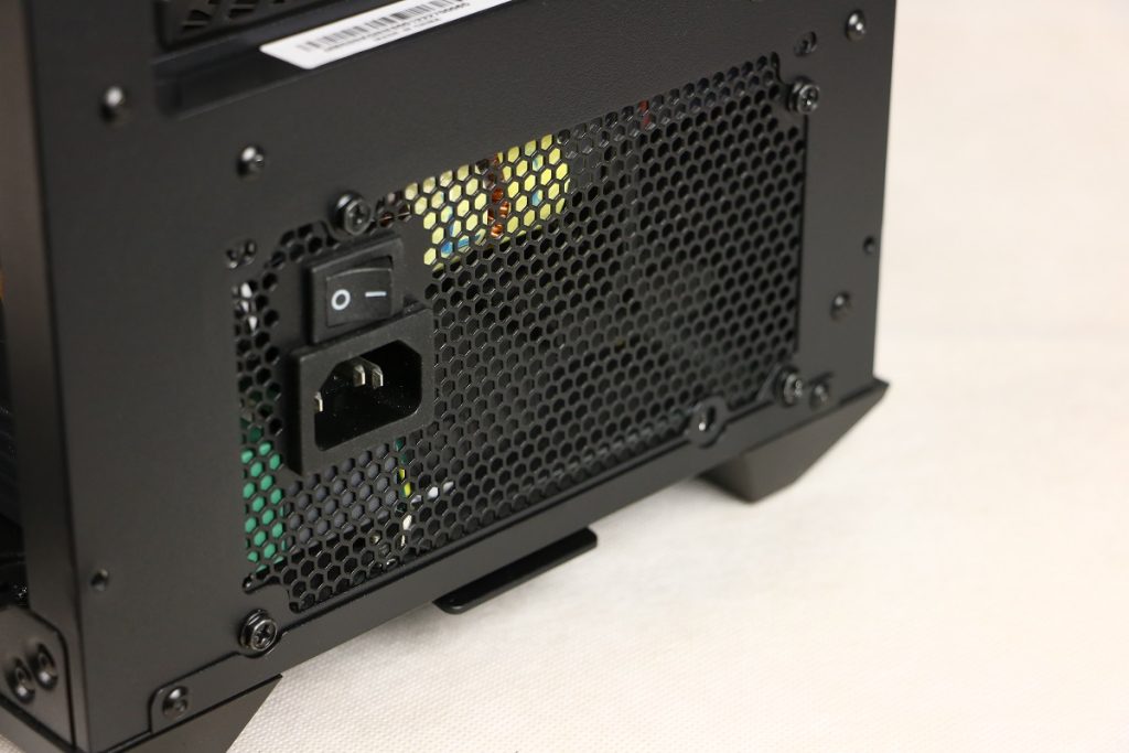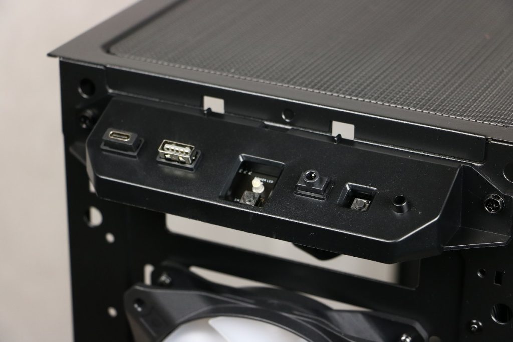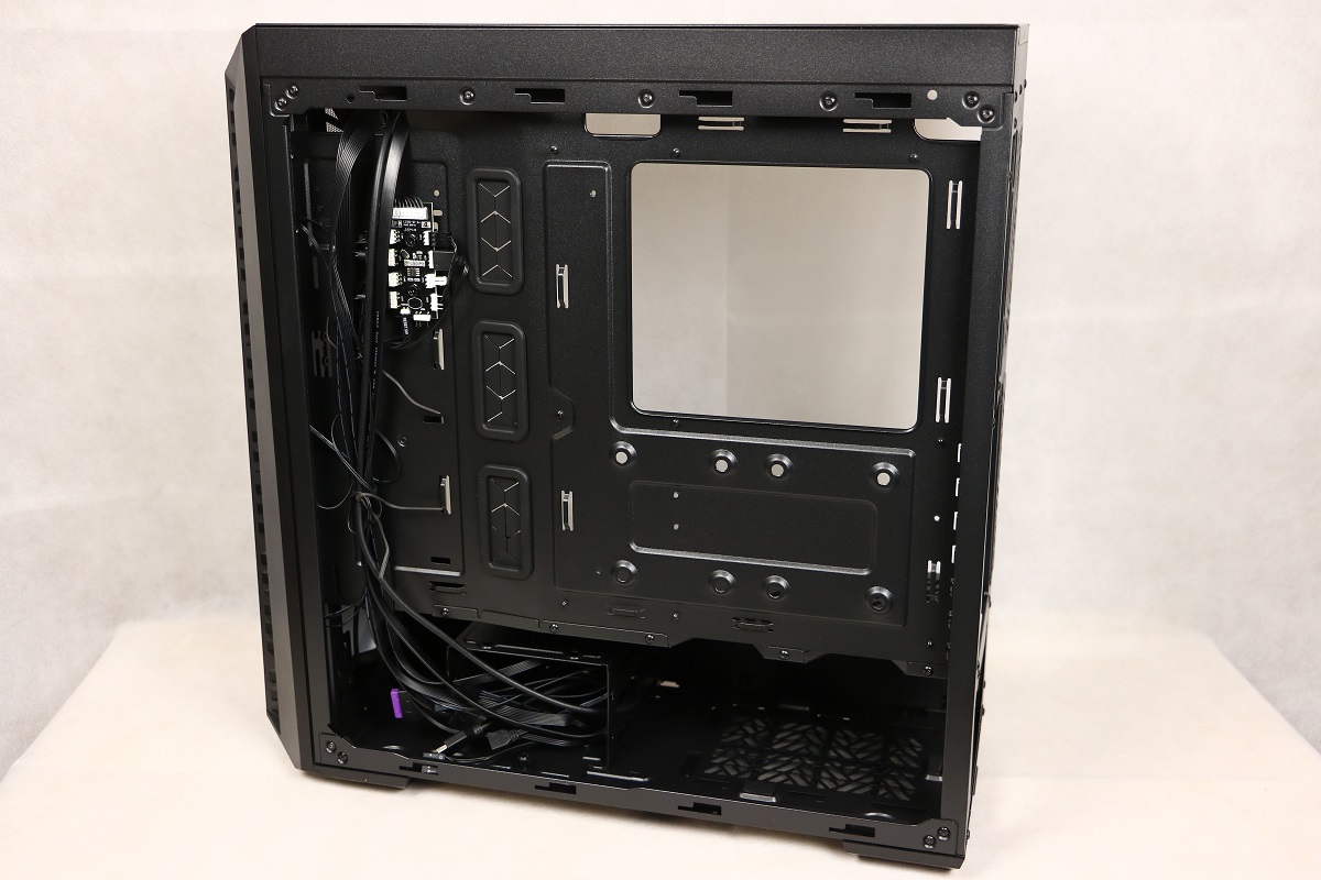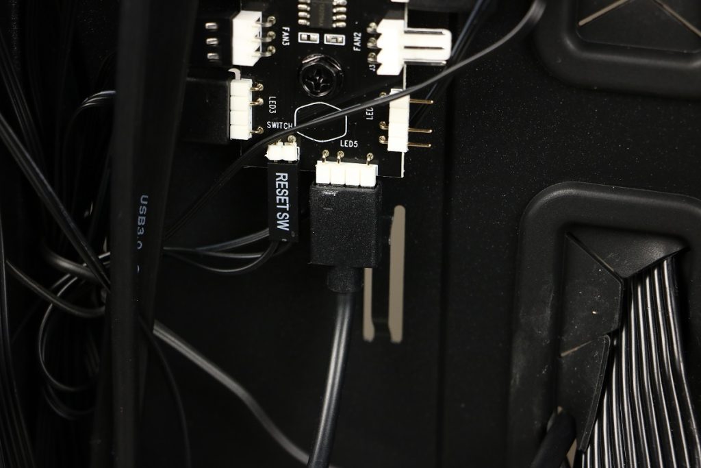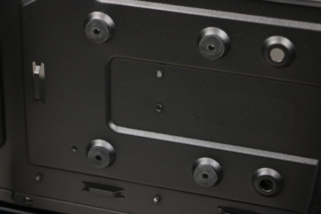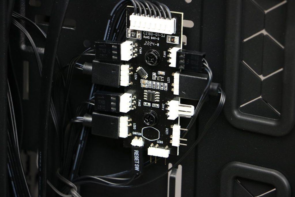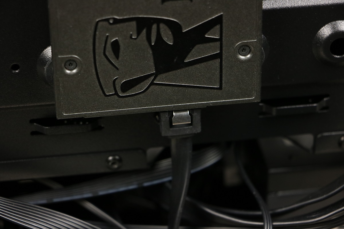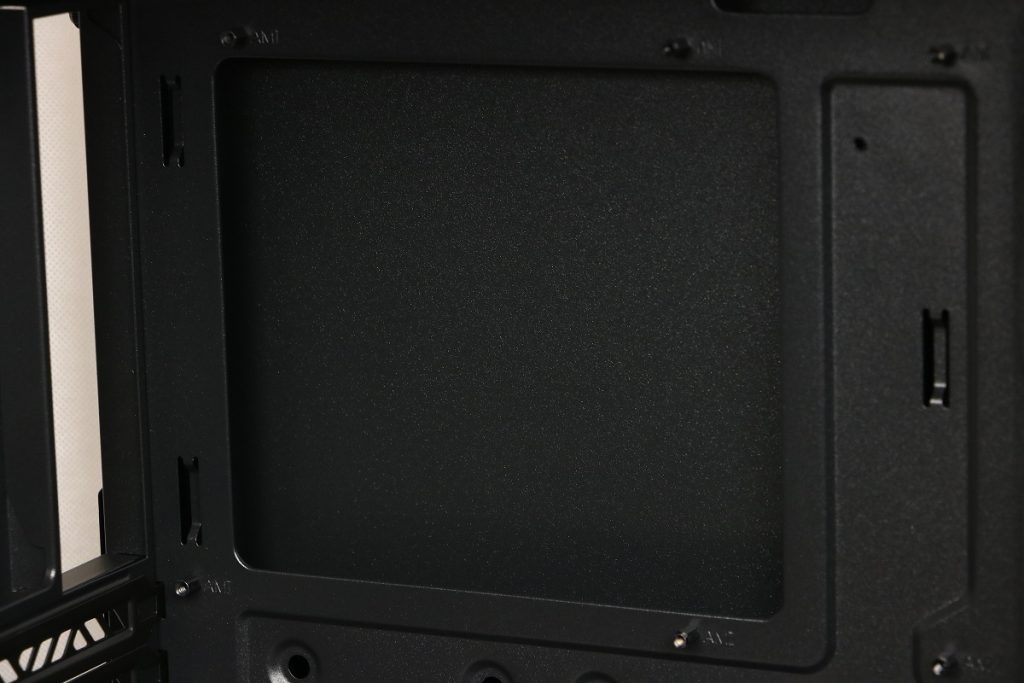We draaien de kast om en gaan kijken wat we hier aantreffen. Het paneel wordt op de standaard wijze losgehaald, dat wil zeggen: twee schroeven los draaien en van de kast afschuiven. Is deze los dan komen we een aantal dingen tegen die we eerder niet zagen. Natuurlijk hebben we de plaats waar de voeding komt. Deze plek is afgewerkt met een paar rubbers zodat de trillingen niet doorgegeven worden. Dit zou anders wel eens een vervelende brom op kunnen leveren. Verder naar boven hebben we de andere kant waar de SSD’s terecht komen. Hier lijkt weinig ruimte voor te zijn maar zoals we straks zien valt het allemaal wel mee. Onderin aan de voorkant hebben we plek voor nog eens twee schijven, al zijn dit de grotere varianten. Hier zijn de brackets voor nodig die we eerder zagen. Verder naar boven hebben we een kleine controller zitten voor de A-RGB verlichting en de ventilatoren. Er zijn al drie stuks aangesloten, namelijk de exemplaren aan de voorkant. Er is dus nog ruimte voor één ventilator en twee A-RGB apparaten. Dit kan ook een splitter zijn maar bedenk wel: het aantal apparaten is niet oneindig. Verder zien we ook hier de rubbers terug en een aantal ogen waar kabels bij elkaar gebonden kunnen worden. Deze zitten op verschillende plekken op de achterkant.