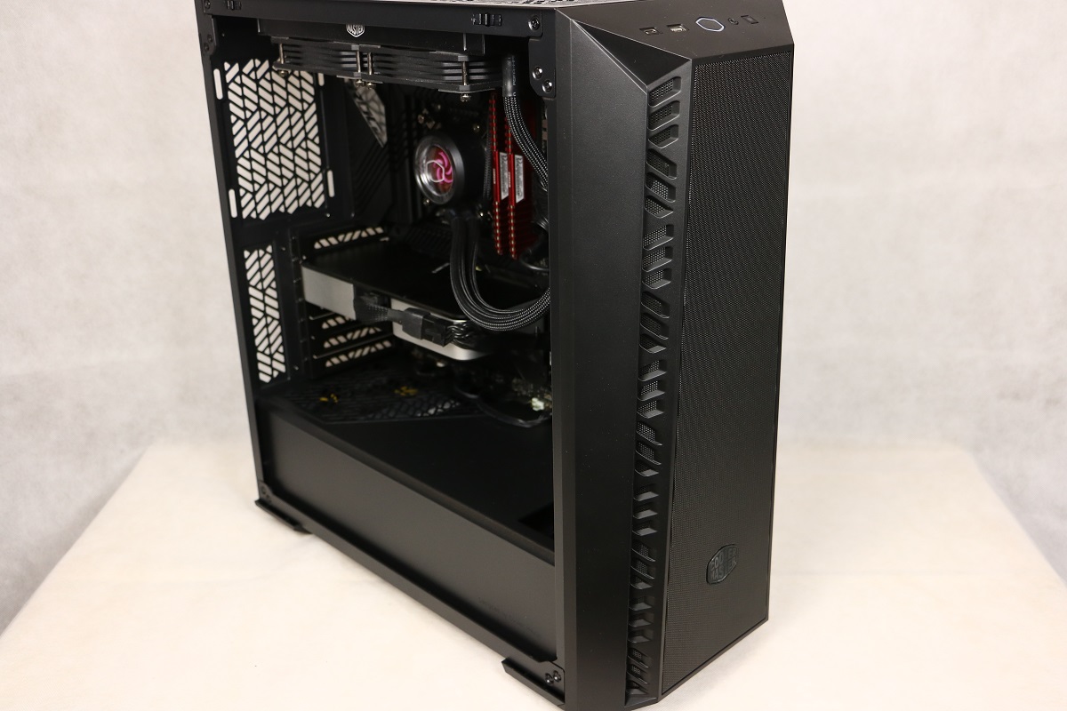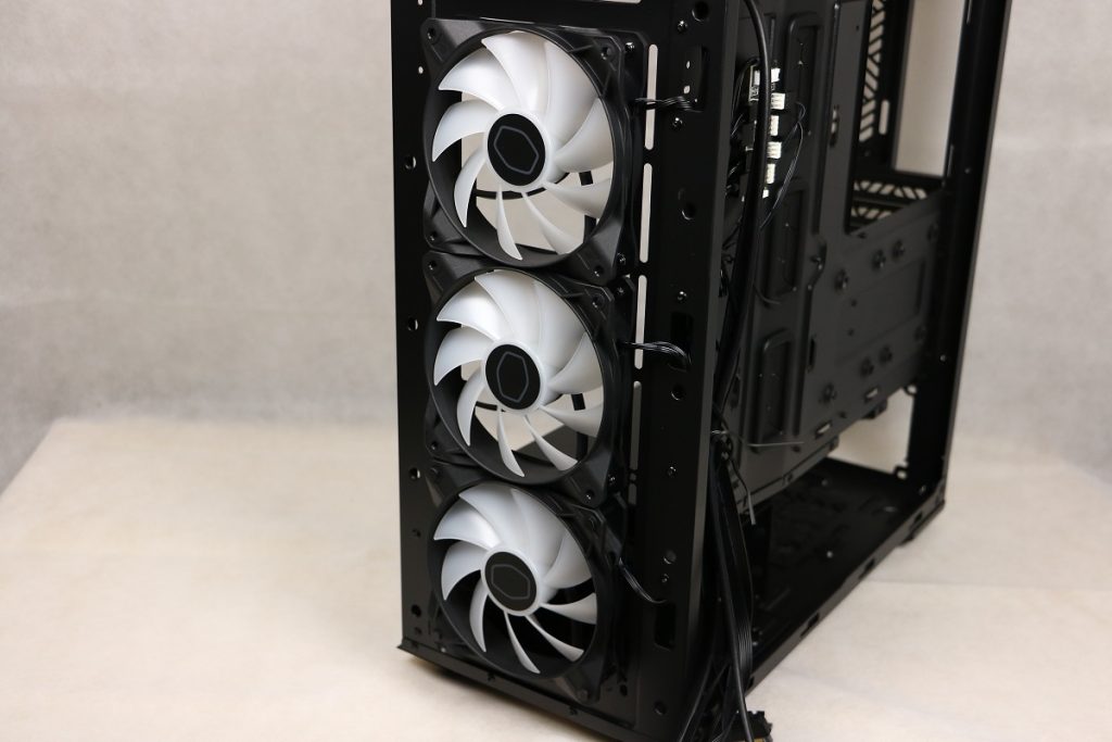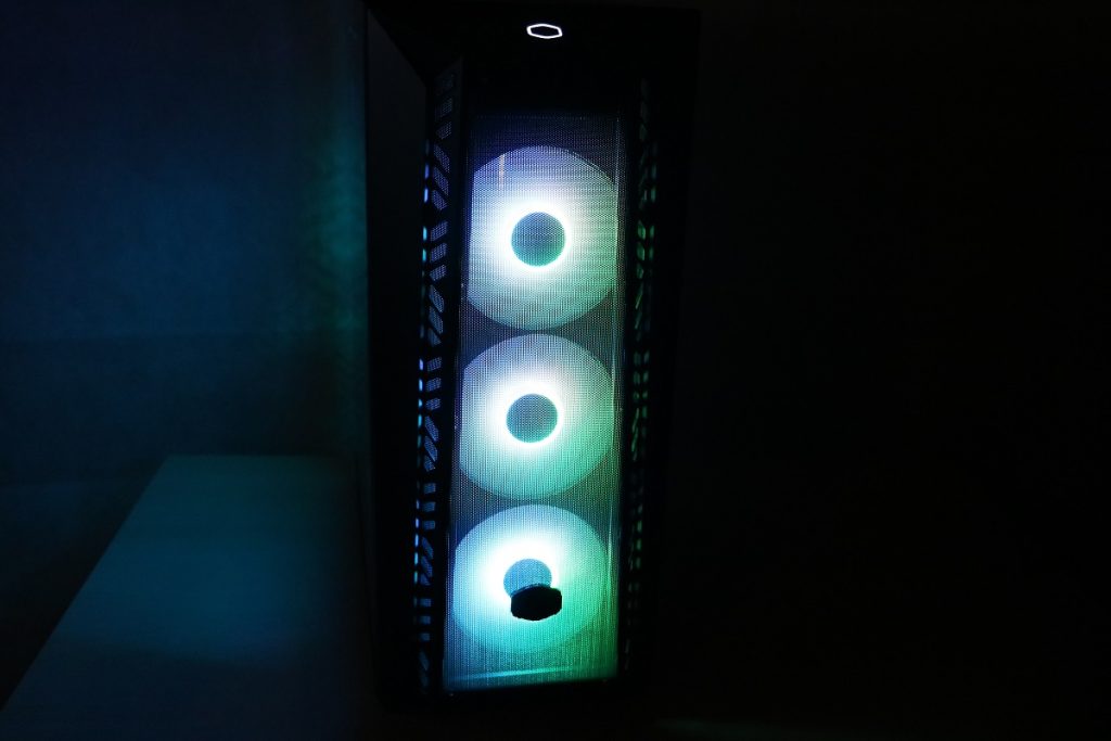Maar al zullen de meeste mensen een kast kopen voor het uiterlijk, het is ook belangrijk dat de kast de ingebouwde componenten weet te koelen. Wanneer je de kast op het eerste gezicht ziet ga je er wel vanuit dat het met de koeling wel goed zit. Er zijn drie ventilatoren ingebouwd en het voorpaneel is gemaakt van mesh. Gelukkig presteert de kast goed ten opzichte van een systeem wat op een testbench ligt. De processor wordt wellicht ietsjes warmer maar dit mag geen naam hebben. De overige onderdelen die we gemeten hebben kunnen tot maar liefst 9 graden koeler worden wat een wereld van verschil is. De ene keer ging het om een processor, de andere keer over de VRM’s op het moederbord. De ventilatoren zorgen dus voor voldoende airflow in het complete systeem. Wat ook belangrijk is om te vermelden is dat de kast daarbij vrij stil weet te blijven. Helaas levert Cooler Master niet een extra ventilator mee aan de achterkant. Dit zou er wellicht voor zorgen dat de temperaturen nog wat lager uitvallen dan ze nu al zijn.