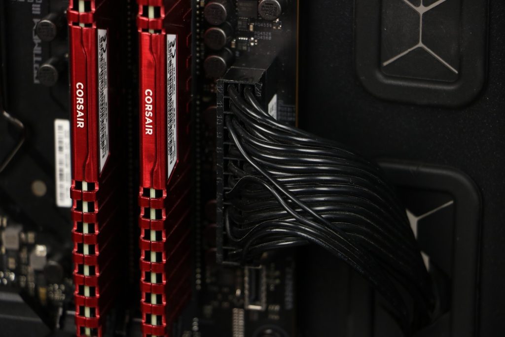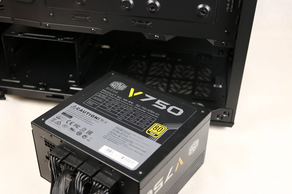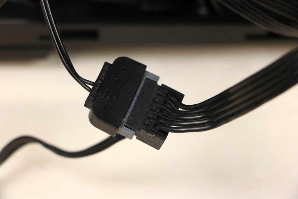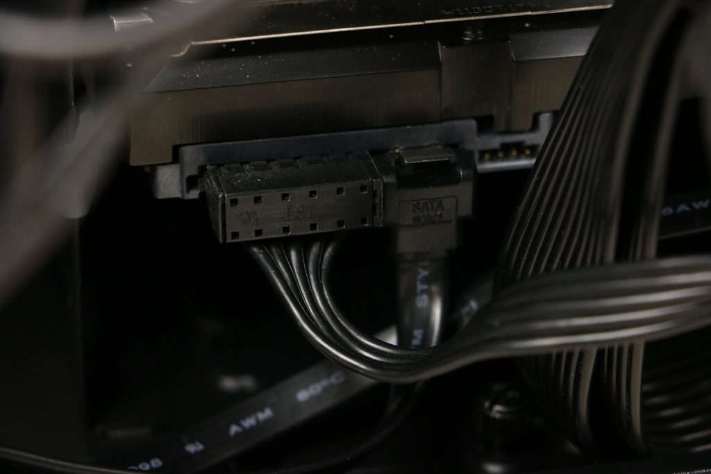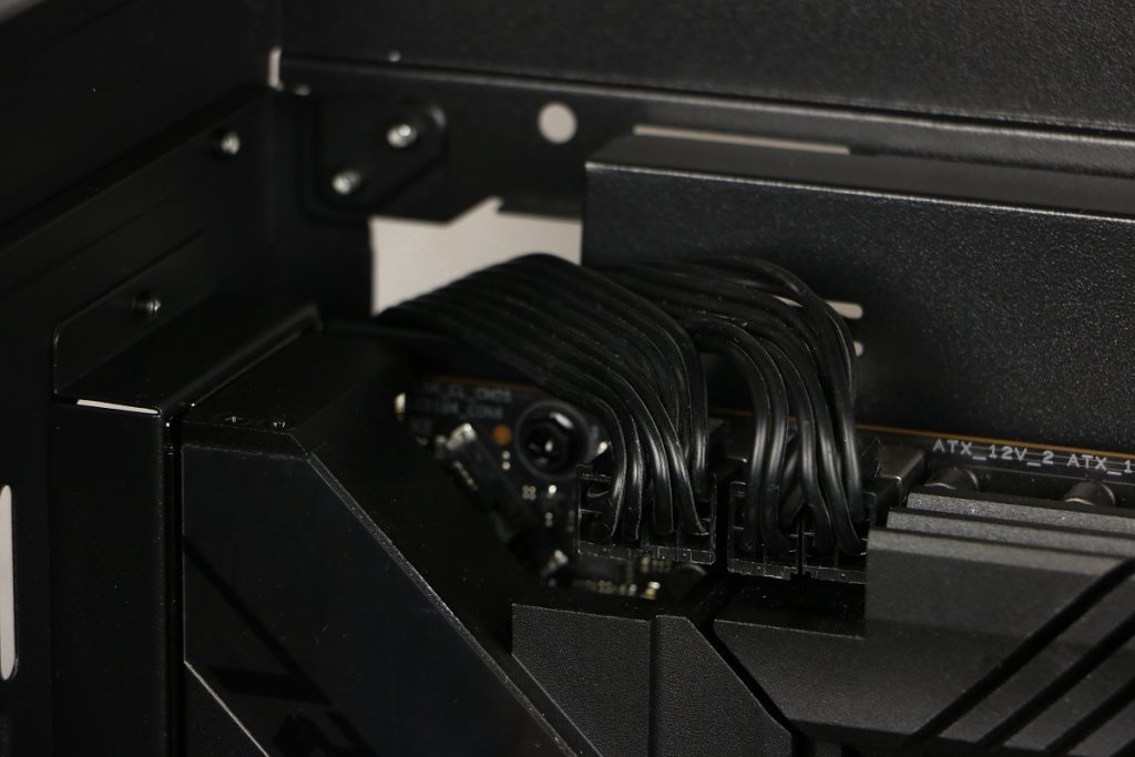 Zoals we eerder hebben gezien bij de TD500 kast wordt de voeding onderin geplaatst. Er is geen bracket aanwezig dus moet de voeding via de zijkant op zijn plek gelegd worden. Of de ventilator nu naar boven of naar onder wijst maakt niet zoveel uit. Een handige tip is wel dat je de benodigde kabels alvast op de voeding aansluit want het is lastig om dit op een later moment te doen vanwege ruimtegebrek. Ligt de voeding uiteindelijk op zijn plaats dan wordt hij vastgezet met vier schroeven. Nu de voeding vast zit kunnen de kabels van de 24-pins connector en de EPS connectoren alvast naar hun plek geleid worden.