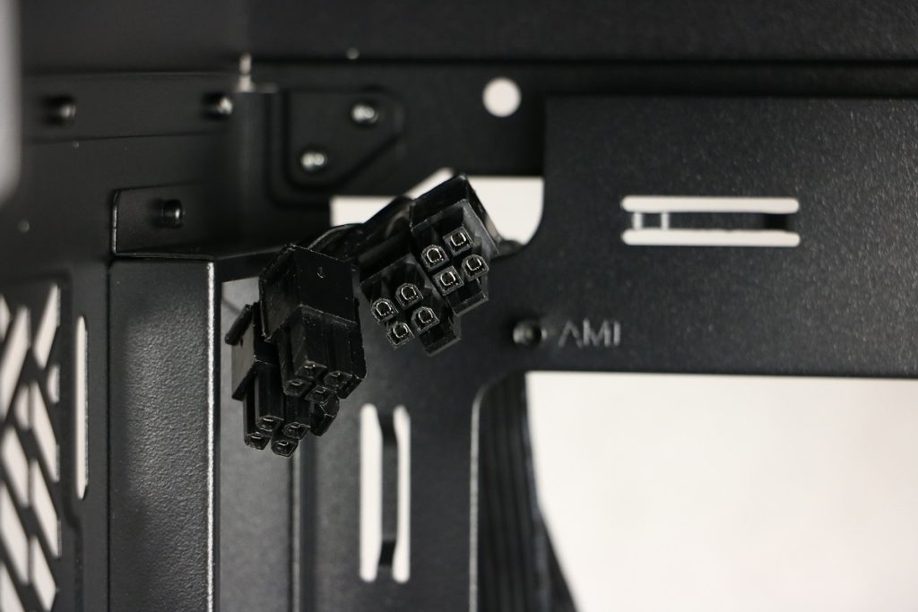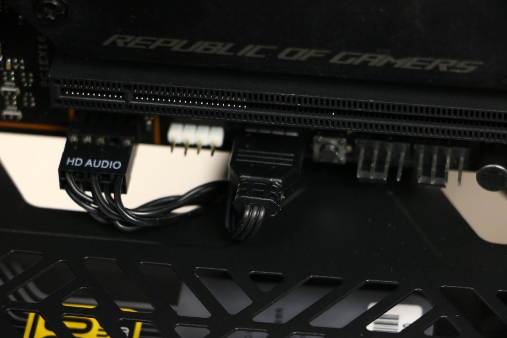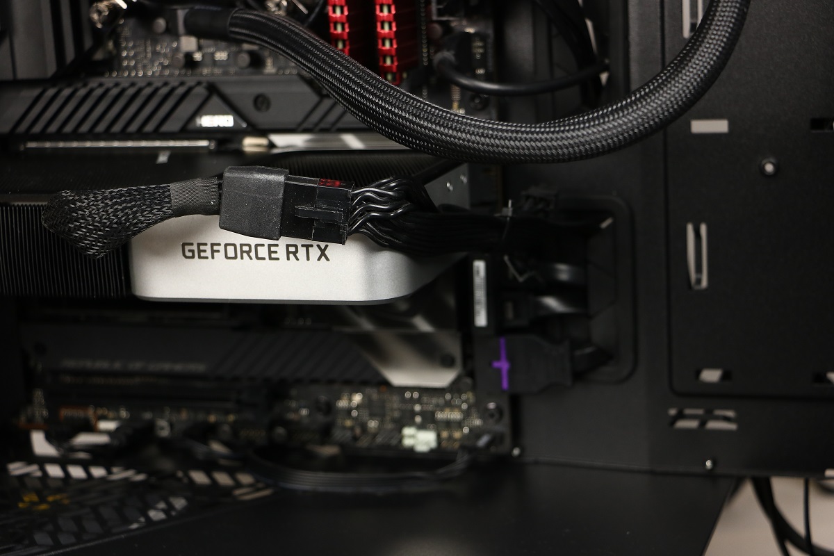 Dan gaan we het laatste onderdeel van de computer inbouwen: de videokaart. De sloten zijn iets naar binnen geplaatst maar dat is geen probleem. Om de kaart te kunnen plaatsen moeten er twee sloten verwijderd worden. Deze zitten niet met duimschroeven vast maar met gewone schroeven. Je hebt dus wel een schroevendraaier nodig. Haal deze los, verwijder de sloten en prik de kaart op zijn plek. Gebruik de eerder losgehaalde schroeven om de kaart weer vast te zetten. Als laatste moeten we nog de stroomkabel aansluiten. De 30 reeks van NVIDIA heeft helaas een andere aansluiting dan je standaard gebruikt dus moet er een verloopkabel gebruikt worden. Dit ziet er wat minder mooi uit maar de kabel kan nog redelijk netjes weggewerkt worden.