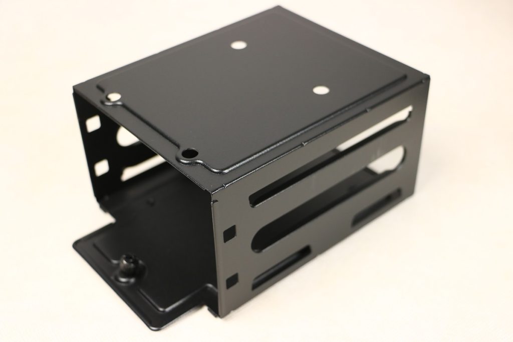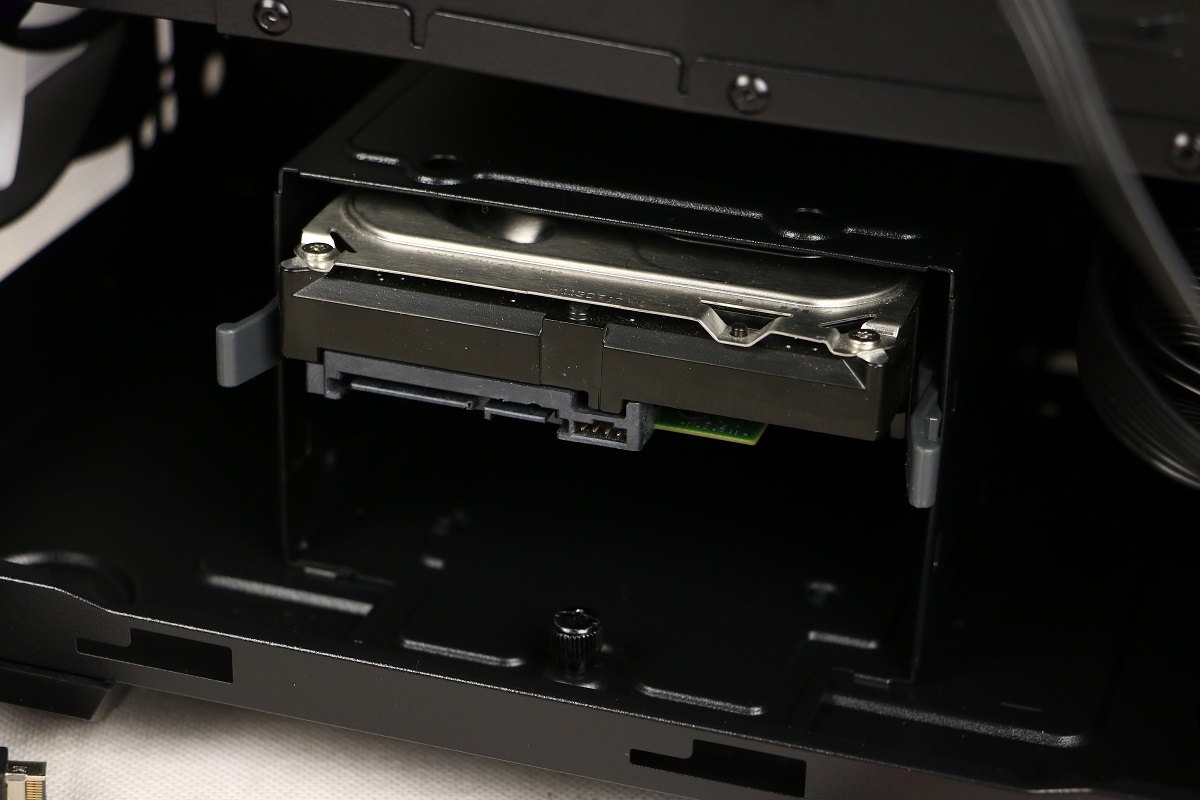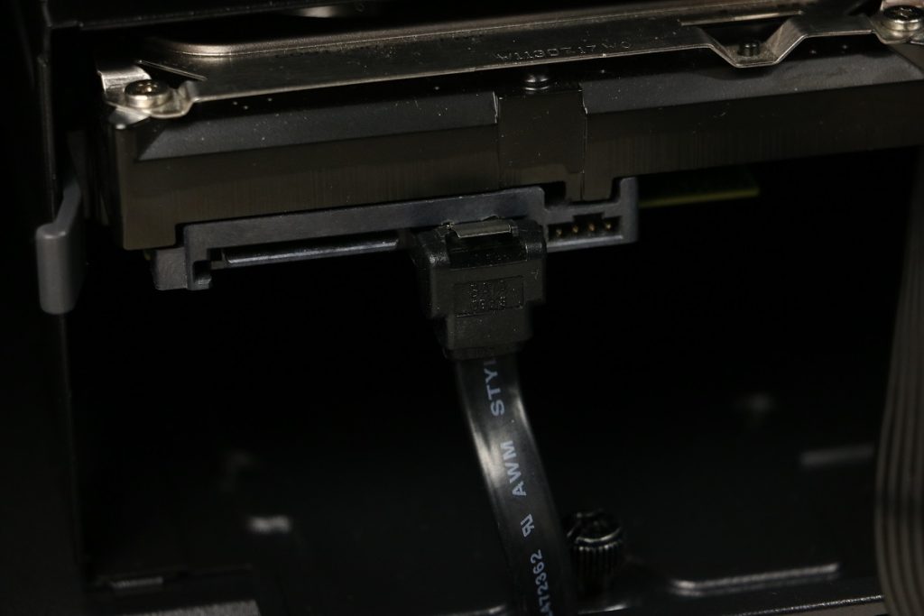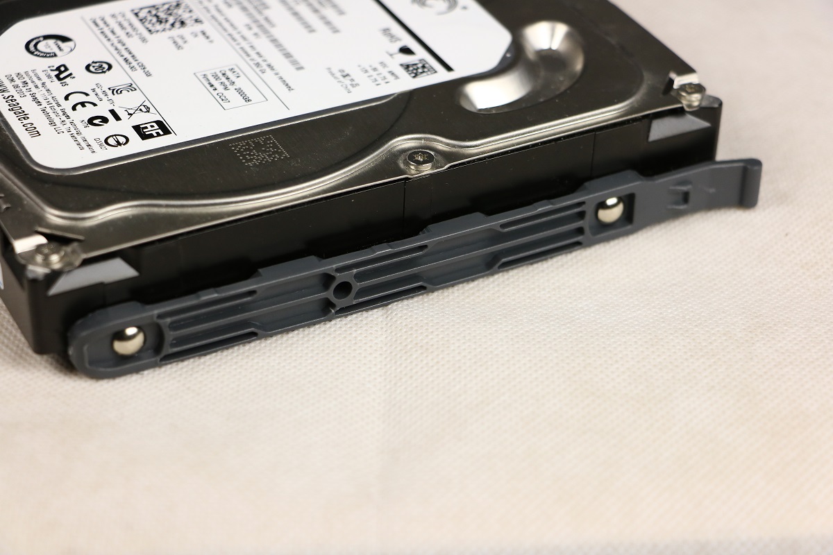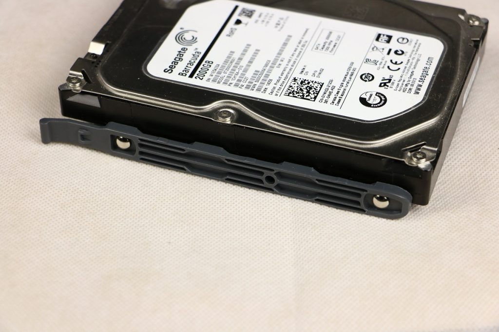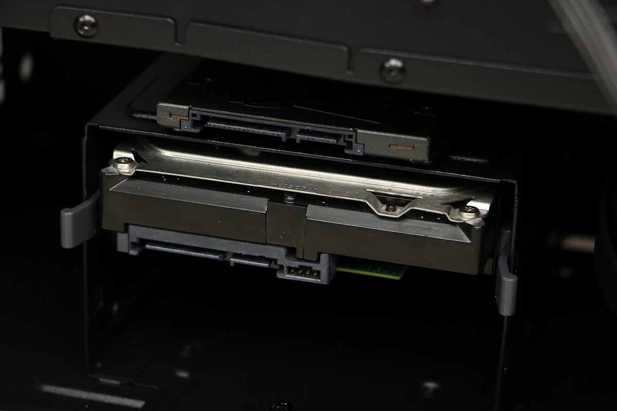De standaard harde schijven worden in de kast geplaatst met bijbehorende brackets. Deze kunnen heel eenvoudig op de zijkant van de harde schijf geplaatst worden, aan elke kant één. Wel moet het uitstekende deel van het bracket aan de kant komen waar de aansluitingen zitten. Als dit gedaan is kan de schijf in de kooi geplaatst worden die aan de voorkant onderin geplaatst is. Duw de schijf zo ver door tot hij vast klikt. Op een later moment kunnen we de kabels aansluiten zodat de schijf ook daadwerkelijk kan werken.