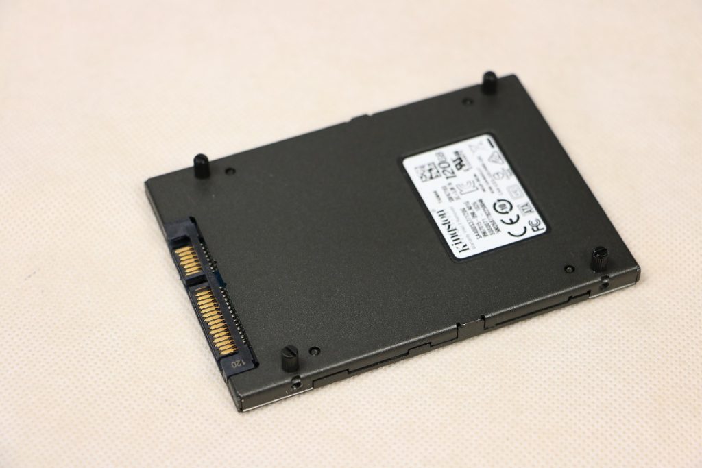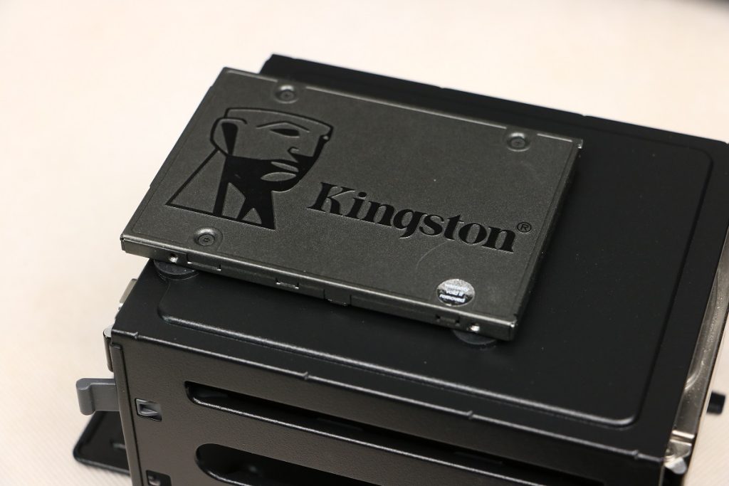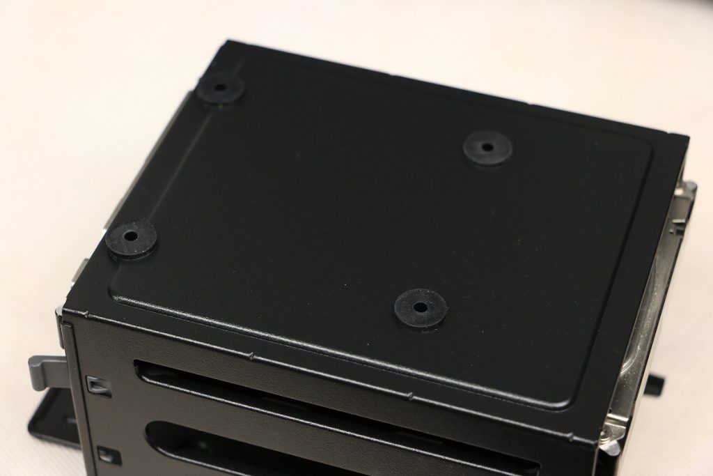 Er zijn ook drie plekken waar een SSD geplaatst kan worden. De eerste locatie is wellicht niet de meest logische maar dit is bovenop de harde schijf kooi. Hiervoor is het wel nodig de kooi uit de kast te halen want anders wordt het lastig de rubbers in de openingen te krijgen. Als eerste moeten we de pennen op de onderkant van de SSD schroeven. Hiermee wordt hij straks vastgedrukt op de daarvoor bestemde plek. Vervolgens plaatsen we de rubbers in de openingen van de kooi. Druk de schijf op zijn plek en schroef de kooi weer terug op zijn plaats. Later kunnen we de kabels op de schijf aansluiten om hem in gebruik te nemen. Twee andere plekken zijn te vinden op de achterkant van de moederbord tray. Hier geldt hetzelfde principe: plaats de rubbers in de openingen en druk de schijf op zijn plek.
