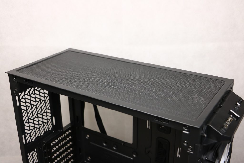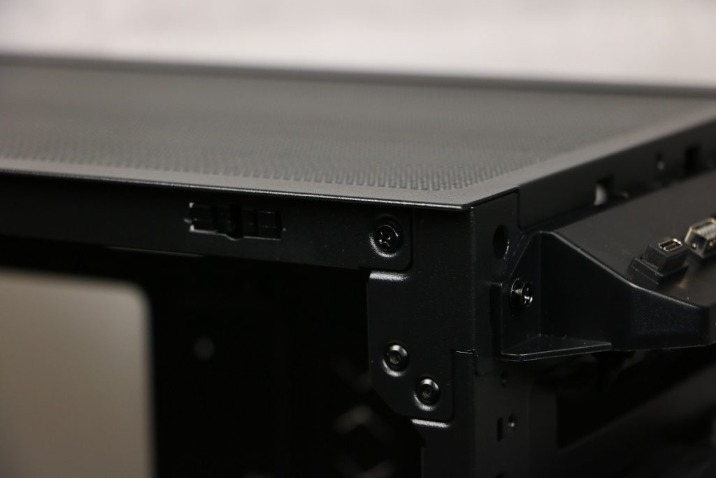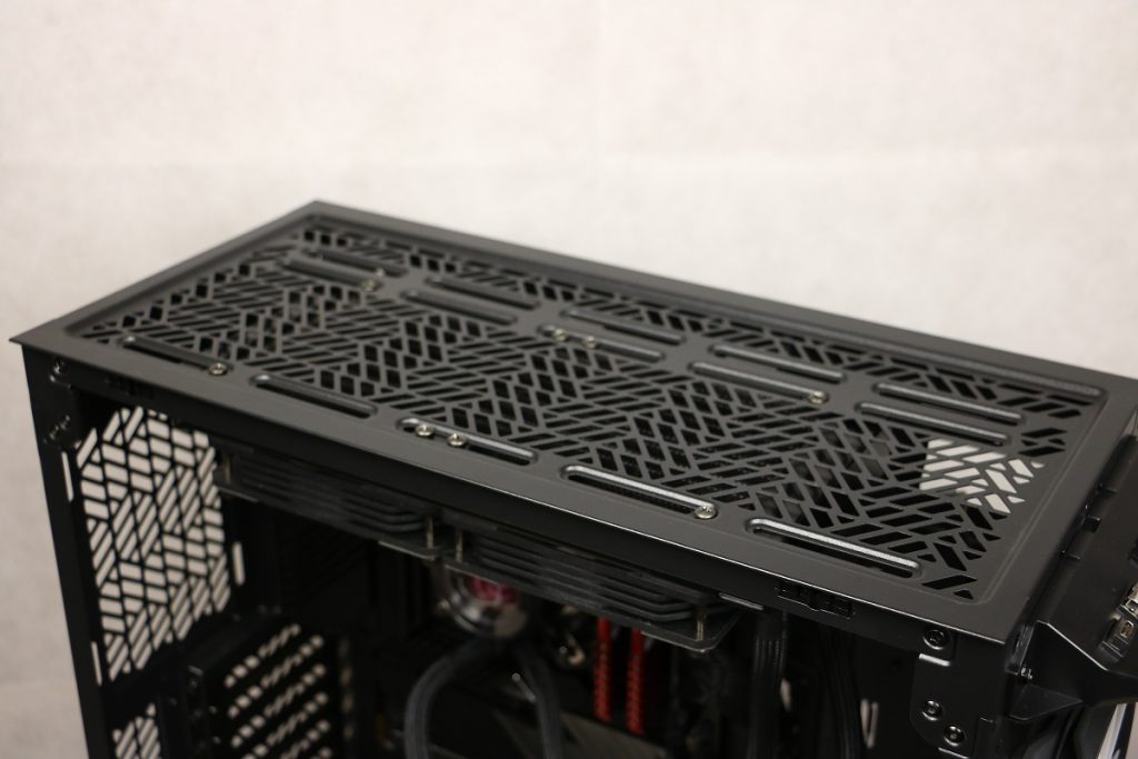 Één van de handigheden van deze kast is dat de bovenkant helemaal los kan van de kast zelf. Dit maakt het inbouwen van een waterkoeler, het moederbord en alle kabels aan de bovenkant vele malen makkelijker. Om deze los te halen moeten er maar liefst twee schroeven los. Daarna kan de bovenkant van de kast opgelicht worden en hebben we ineens zoveel meer ruimte tot onze beschikking. De bovenkant kan zo ook makkelijk op een radiator van een waterkoeler geschroefd worden.