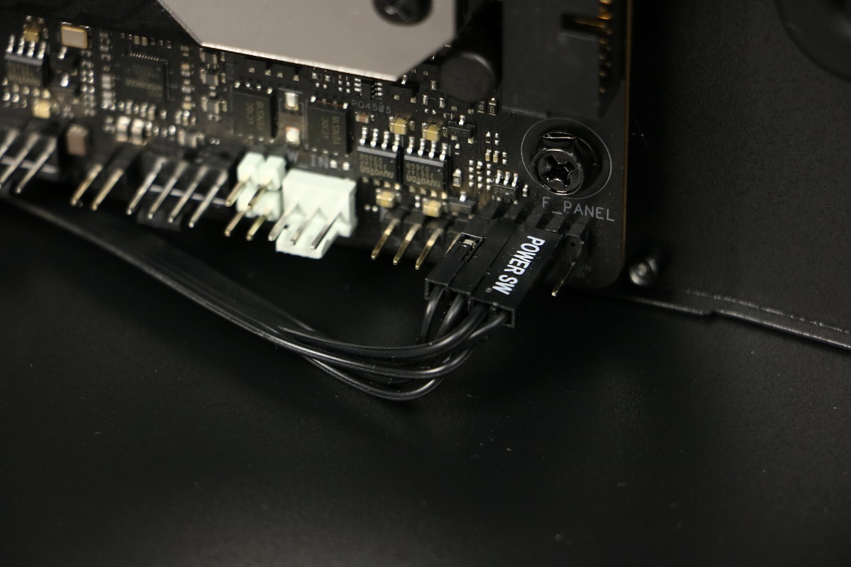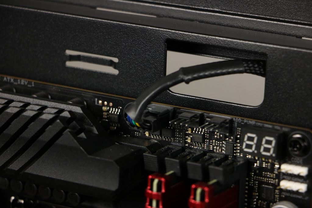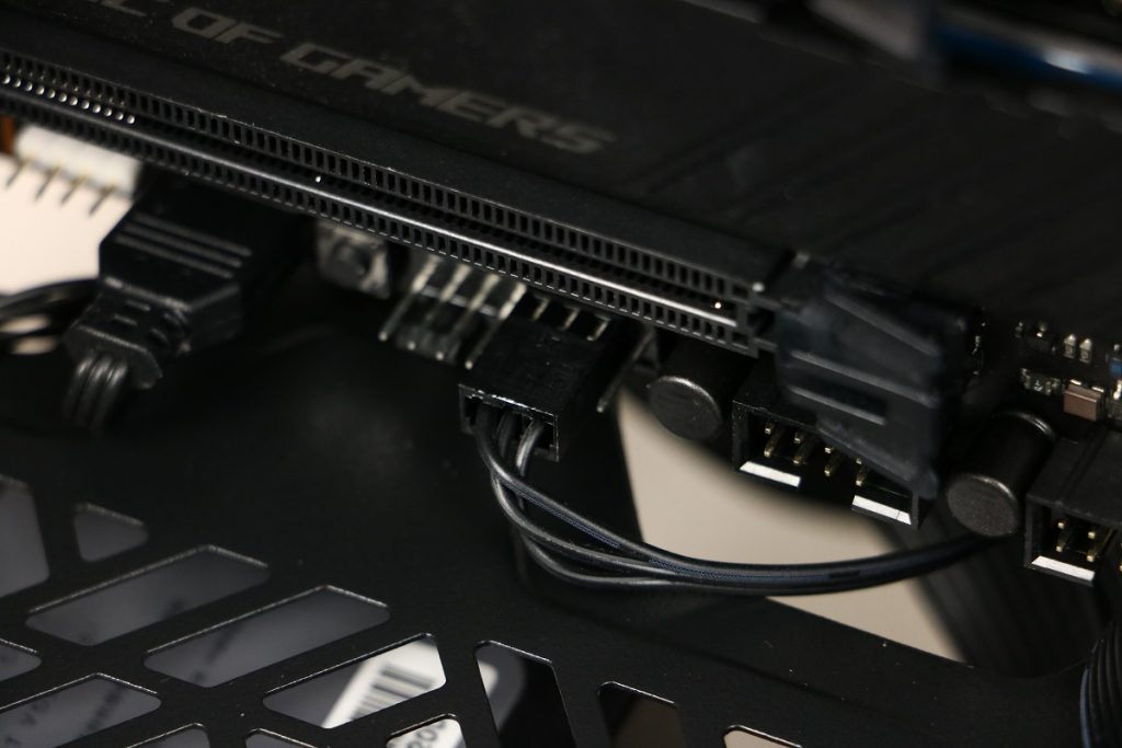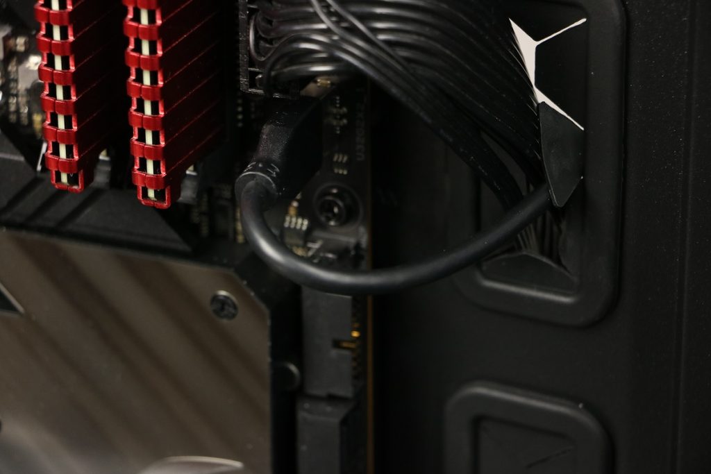 We kunnen nu alvast de verschillende kabels aan gaan sluiten op het moederbord. We hebben de aansluitingen van de kast zelf en de kabels voor het gebruik van de harde schijven. Sluit de connector van de front audio linksonder aan op het moederbord. Er is daar een mooie opening dus die kabel kan mooi weggewerkt worden. De RGB kabel kan daarnaast mooi aangesloten worden aangezien deze ook in de buurt van de opening zit. De volgende kabel is de kabel voor het aansturen van de ventilatoren. Deze kunnen via deze connector aangestuurd worden. Dan zijn er nog de kabels voor de USB 3.0 aansluiting en de USB Type-C wat weer een andere kabel is. Dan hebben we nog twee SATA kabels: één voor de harde schijf en de ander voor de SSD. Sluit de twee kabels aan op het moederbord en de andere kant op de schijf naar keuze. Het is wel handig om een haakse connector te gebruiken bij de gewone harde schijf want dan kunnen de kabels beter weggewerkt worden.