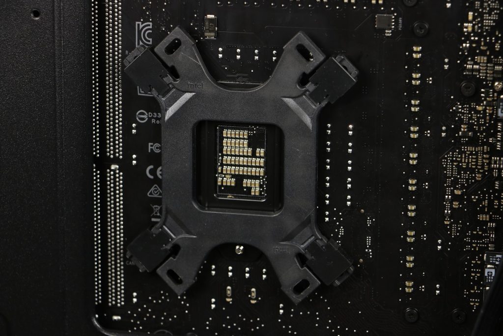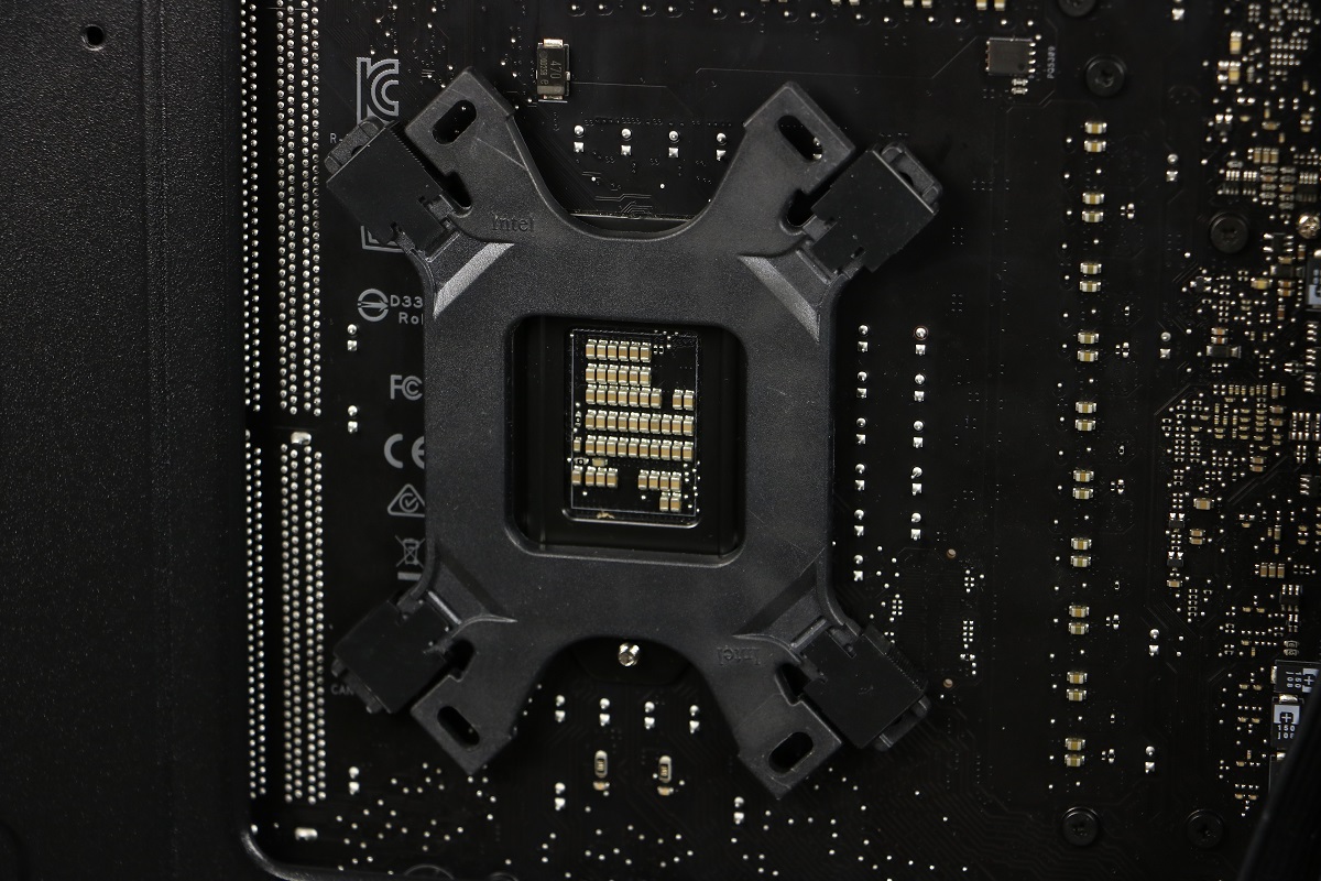 Dan is het tijd om de koeling in te gaan bouwen. We beginnen met het bracket waar het koelblok straks op vastgezet wordt. Aangezien het hier om een Intel moederbord gaat bereiden we deze variant voor. Deze wordt daarna via de achterkant op het bord geplaatst. Hier is genoeg ruimte beschikbaar om de backplate te plaatsen. Aan de andere kant wordt deze vastgezet met de benodigde schroeven. De volgende stap wordt het vastschroeven van de radiator aan de bovenkant die eerder losgehaald is. Plaats deze radiator op de juiste plek en schroef hem vast. Leg vervolgens het rooster op de bovenkant maar maak hem nog niet vast. Het is namelijk makkelijker om de kabels van de pomp, ventilatoren en de verlichting nu al door de openingen te leiden aangezien er straks weinig ruimte is. Sluit ook alvast de ventilatoren en de pomp aan op het moederbord. Nu kan het blok op de processor geplaatst worden en vastgezet met de vier duimschroefjes. Als deze vast zit kan het rooster aan de bovenkant weer vastgezet worden. Het geheel ziet er weer netjes uit en de koeler hangt keurig op zijn plek.