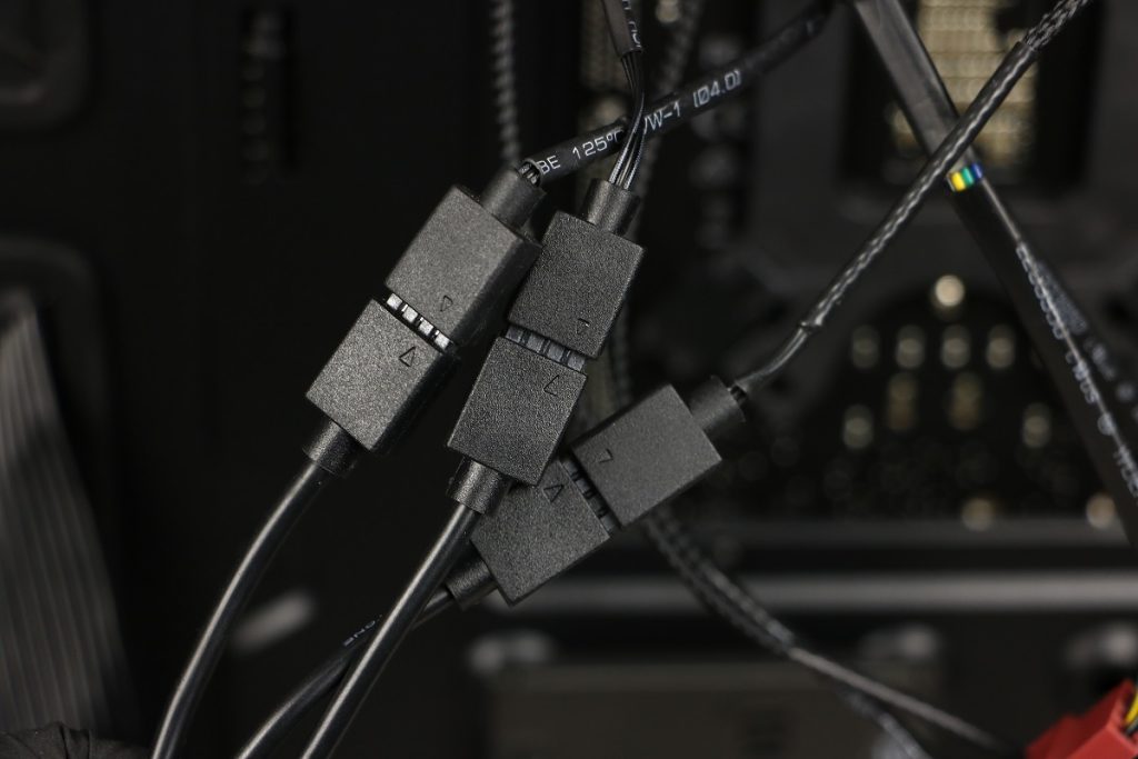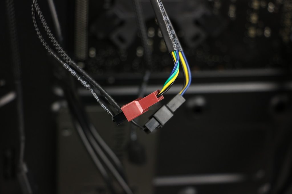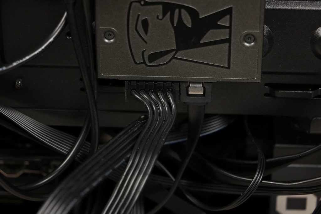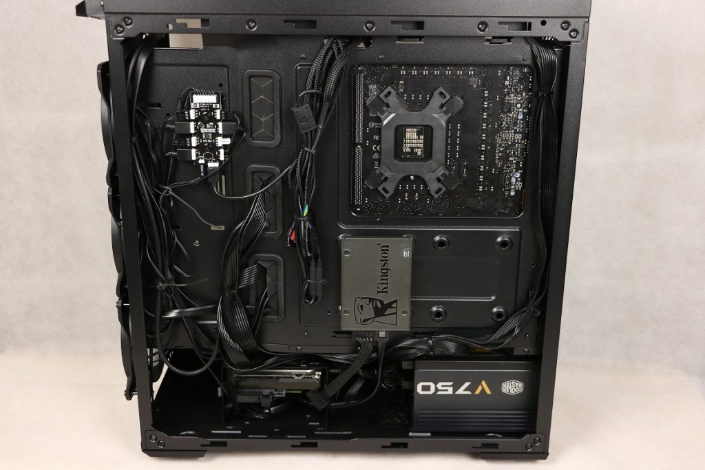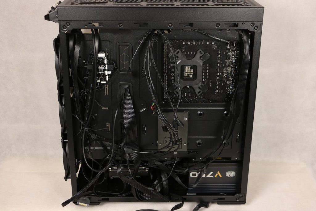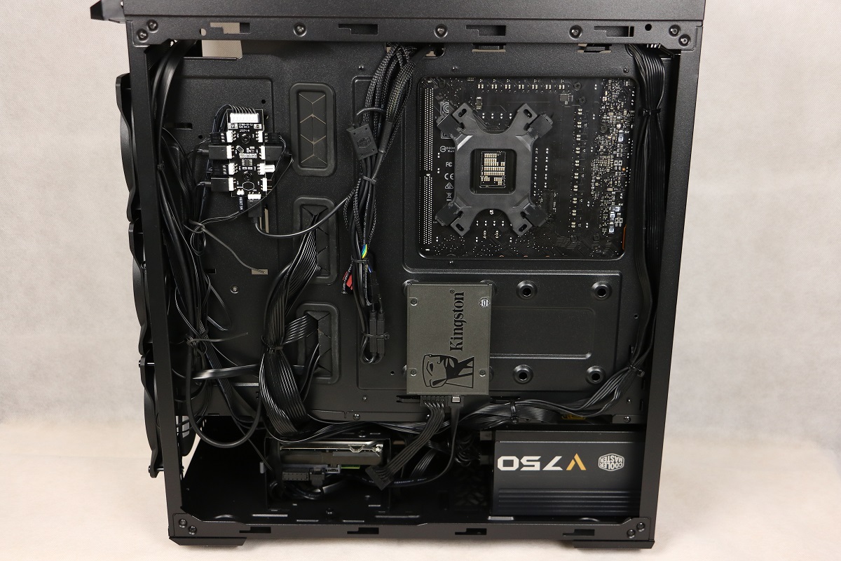 Alles is ingebouwd maar de kabels hangen er maar een beetje bij. En ook al wordt de achterkant van de machine afgedekt met een aluminium plaat, het is wel zo netjes om de kabels te bundelen en de machine netjes af te werken. Gelukkig heeft Cooler Master daar ook aan gedacht en zijn er oogjes aangebracht waar de kabels met tie wraps aan vastgezet kunnen worden. Dat zorgt ervoor dat het geheel toch wat beter afgewerkt is en dat de kabels binnenin de kast ook niet zoveel meer te zien zijn. Deze zijn voor het grootste deel achter het moederbord weggewerkt. Ook moeten er een aantal kabels aangesloten worden zoals de RGB verlichting en de ventilatoren. We hebben eerder de kabels op het bord aangesloten maar de ventilatoren zelf moeten nog wel aangesloten worden. De RGB verlichting kan op de hub aangesloten worden zodat de verlichting één geheel vormt. Als laatste sluiten we de SATA aansluitingen aan op de verschillende apparaten. Als alles aangesloten is kunnen we de kabels bundelen en vastzetten. Het eindresultaat is een machine die redelijk goed afgewerkt is waardoor je de kap weer netjes op de kast kan plaatsen.