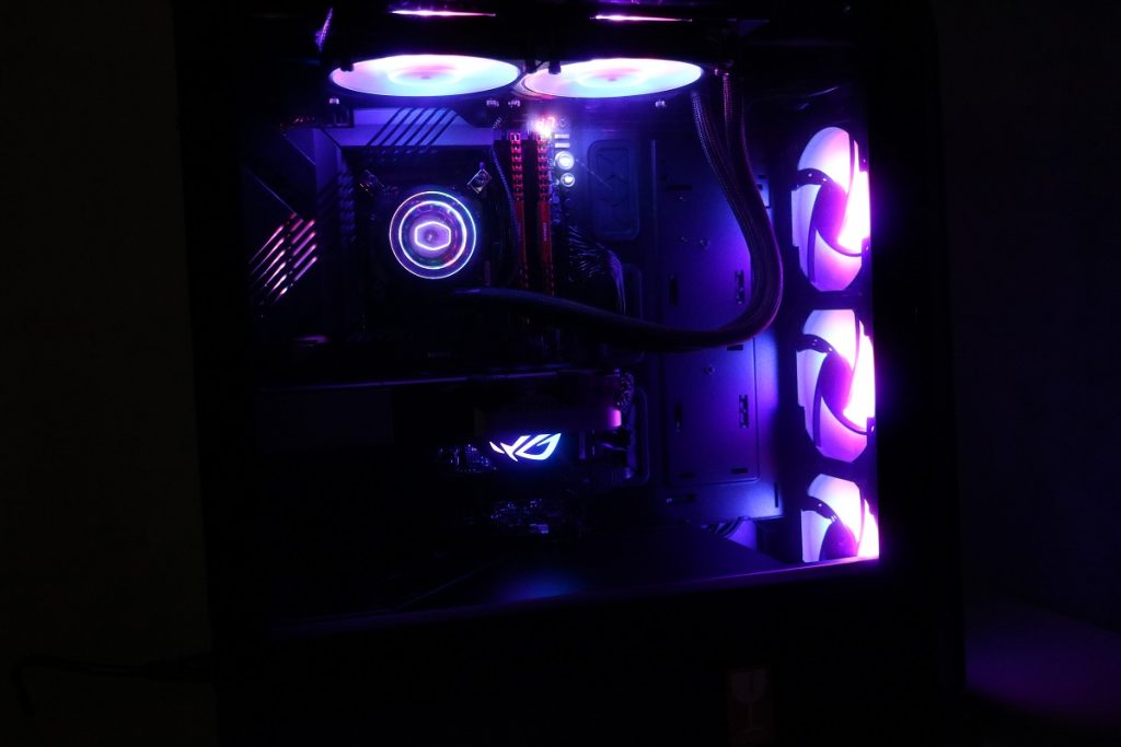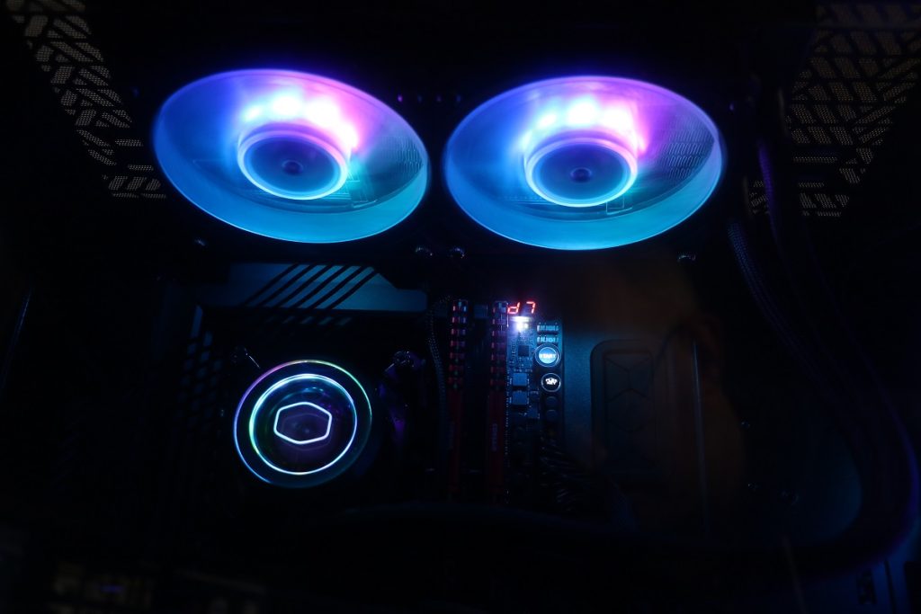 De verlichting is daardoor ook goed te zien. De ventilatoren die met de kast geleverd worden zien er qua kleur goed uit. Niet al te fel maar ook niet zo zwak dat je je af vraagt waar de verlichting is. Omdat de waterkoeler ook aangesloten is op de RGB hub synchroniseert de verlichting hiervan met de rest van de verlichting in de kast. Het resultaat mag er zeker zijn: de verlichting komt goed uit de verf en is makkelijk aan te sturen via de reset knop die hiervoor gereserveerd is. Uiteraard is het ook mogelijk om de verlichting via het moederbord aan te sturen maar deze knop is een mooie en makkelijke optie.