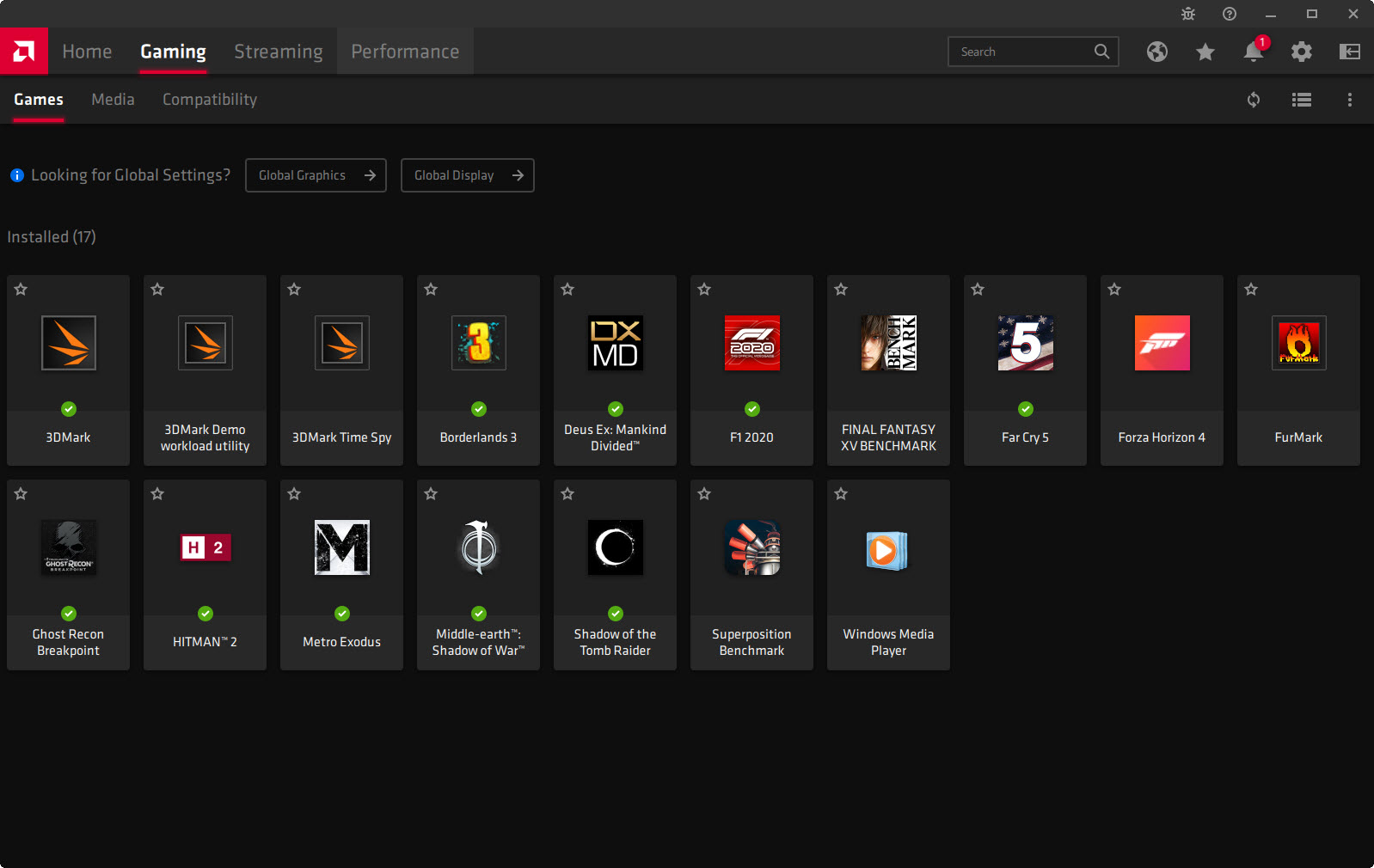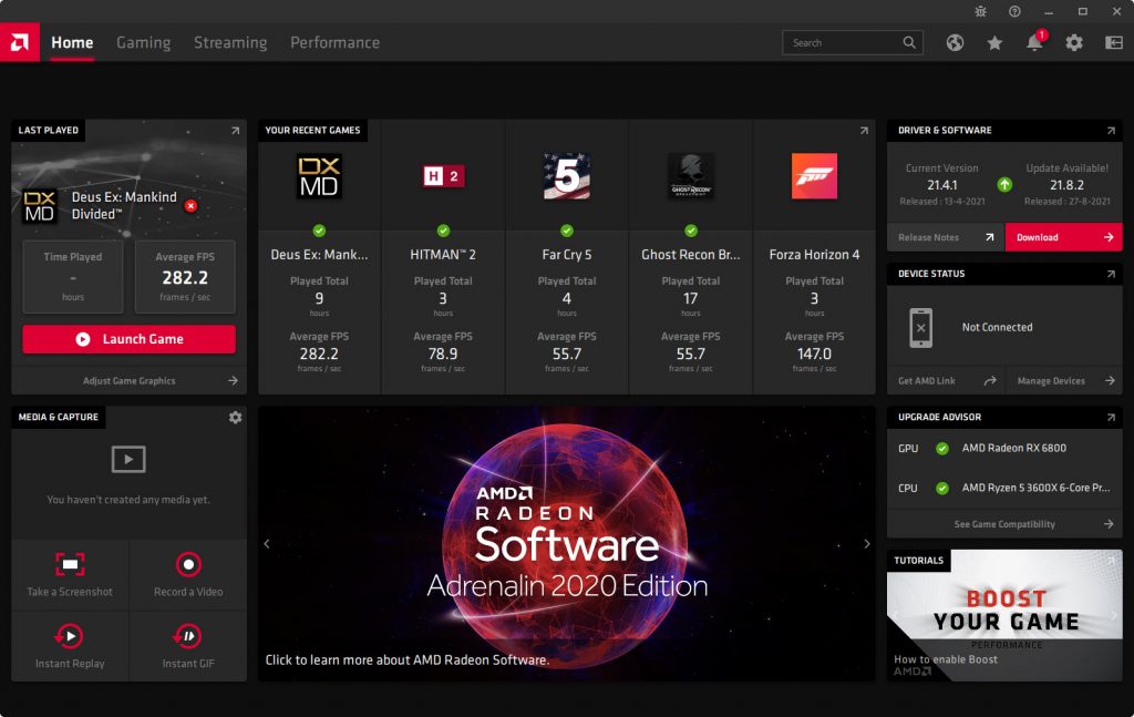 In het hoofdscherm zien we de meeste opties al terug. Bovenin hebben we een aantal tabbladen waarin tot in detail opties zijn verwerkt. Daaronder zien we het laatste gespeelde spel of benchmark terwijl je rechts daarvan de laatst gespeelde spellen ziet. Links vinden we een media venster waar schermopnames te zien zijn of video’s mee opgenomen kunnen worden. Aan de rechterkant zien we de stuurprogramma informatie, de apparaat status en een opwaardeer adviseur. Deze vertelt je wat je aan je computer kunt verbeteren voor de beste prestaties in een applicatie of spel.