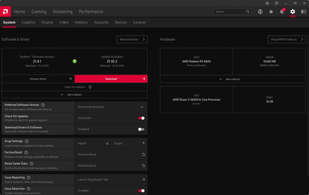Rechts bovenin kunnen we nog naar het instellingen menu door op het tandwieltje te klikken. Daar zien we meerdere tabbladen waar behoorlijk wat instellingen aan te passen zijn. Bij System kunnen updates ingesteld worden en kiezen of problemen meteen gemeld moeten worden als er iets mis gaat. In Graphics kunnen instellingen als Anti-Lag en Radeon Boost ingeschakeld worden. bij Display kan de FreeSync ingeschakeld worden als je beeldscherm dit ondersteunt. Ook is Scaling in te schakelen. Met Hotkeys kunnen sneltoetsen geprogrammeerd worden voor verschillende acties. Er zijn nog veel meer opties maar die gaan we hier niet benoemen.