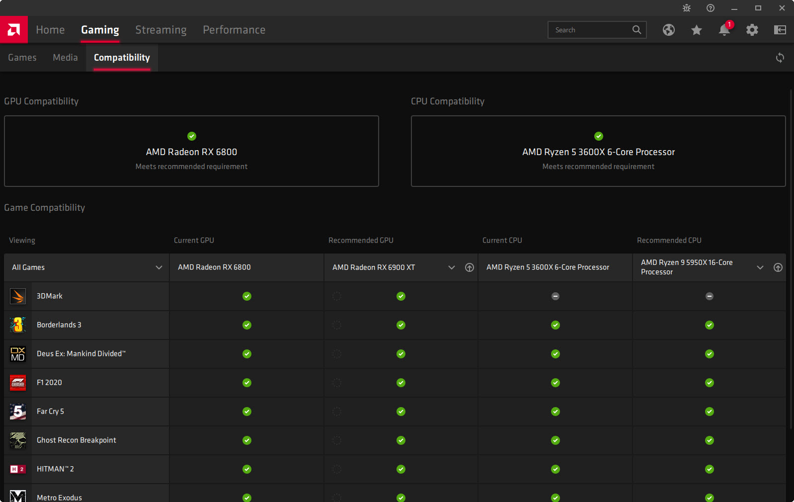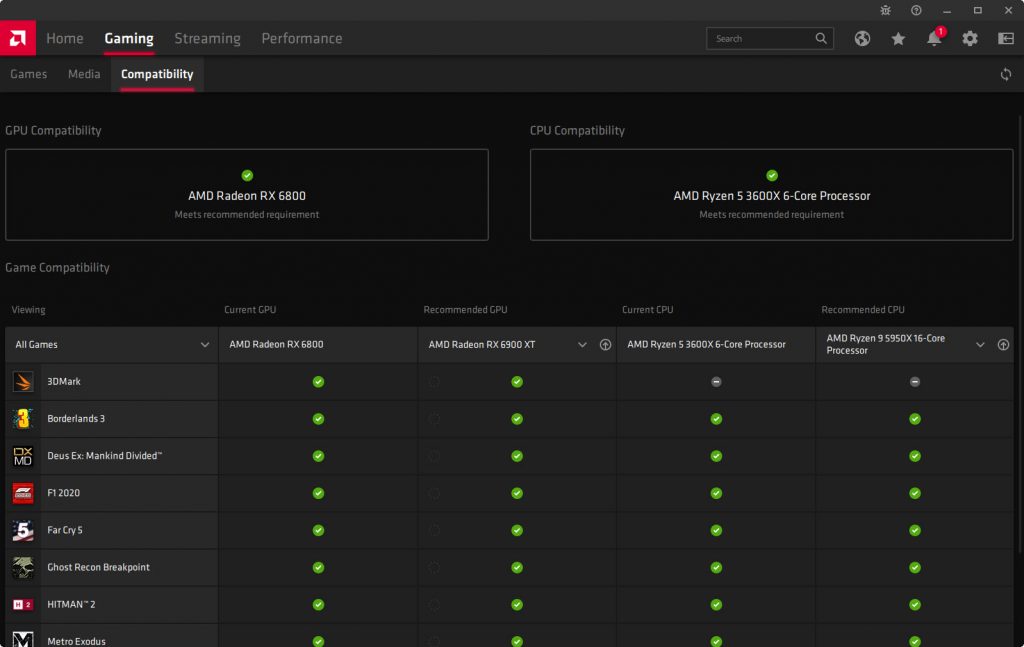Het tabblad Gaming laat zien welke spellen allemaal op de computer staan of al een keer gespeeld zijn. Dit is overigens ook terug te zien in het hoofdscherm waar tevens vermeld staat hoe lang een spel actief is geweest en hoeveel de gemiddelde FPS is. Klik je op een spel of applicatie dan krijg je wat meer informatie te zien. Het tabblad Compatibility laat zien of de hardware een spel of applicatie wel kan draaien en wat er eventueel aangepast dient te worden, wil je een beter resultaat krijgen. Dit kan een andere processor zijn of een andere videokaart.