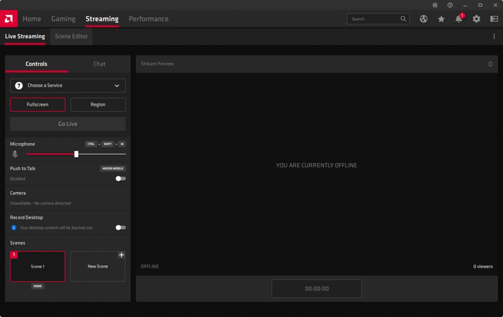 Ook is het mogelijk om de software van AMD te gebruiken voor het livestreamen. Daarvoor kan je naar het tabblad Streaming gaan. Daaronder zien we het onderdeel Live streaming en een tabblad Scene Editor. De eerste is om via een dienst ook daadwerkelijk de stream te starten, de chat te kunnen lezen en van scenes te wisselen. Op het andere blad kunnen er verschillende scènes ingesteld worden. Denk hierbij aan een scene waar je aan het praten bent, een game aan het spelen bent of een scherm waar je de stream mee eindigt. Allerlei opties zijn mogelijk.