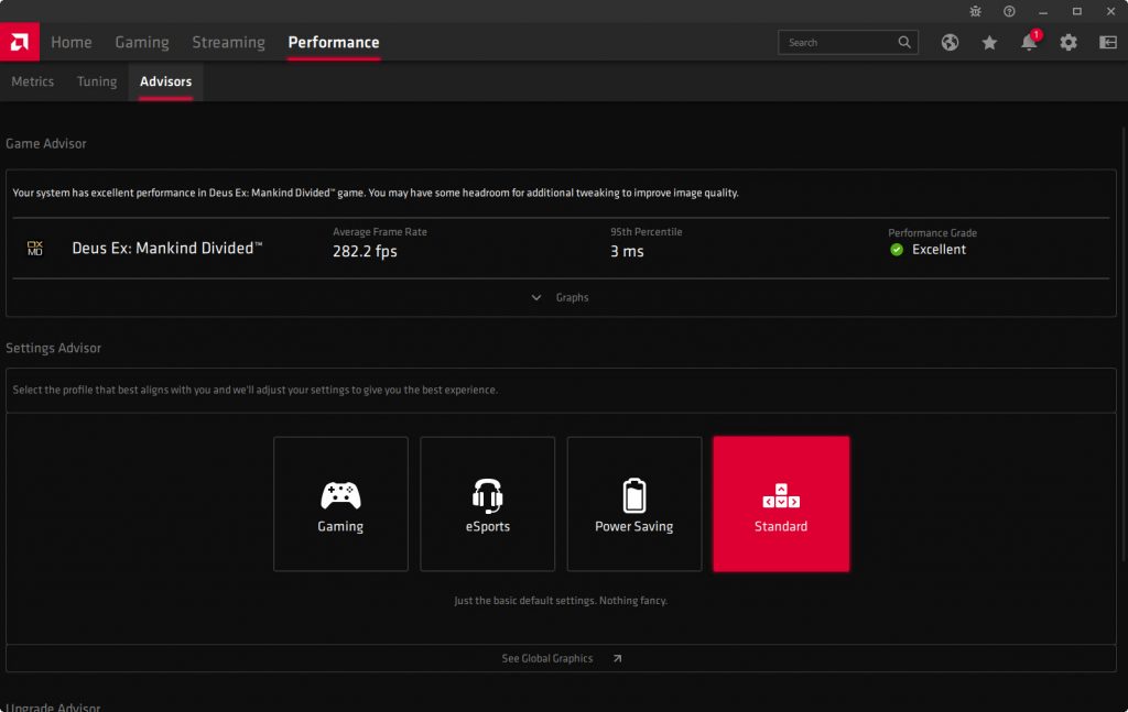 Het laatste tabblad is Performance. Hier kunnen in het tabblad Metrics het verbruik van de GPU en het videogeheugen in de gaten gehouden worden. Ook het verbruik van de processor en het RAM geheugen is hier te zien. Uiteraard mogen de temperaturen en het stroomverbruik niet ontbreken. Het tabblad Tuning gaan we bespreken in het hoofdstuk overklokken. Bij Advisors zien we aanbevelingen om spellen beter te laten lopen op je computer. Of het veel zin heeft om dit automatisch in te laten stellen verschilt per applicatie. En soms staan instellingen al goed van zichzelf.