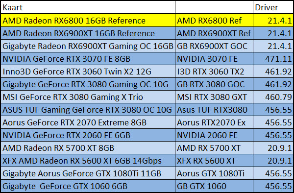 De videokaarten die tot nu toe getest zijn staan hieronder vermeld, samen met de versie van de gebruikte driver op dat moment.