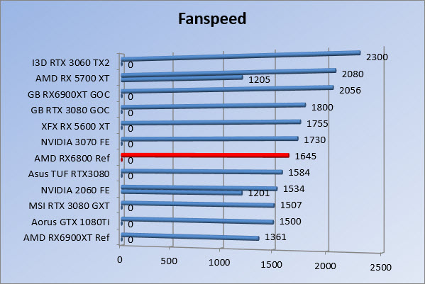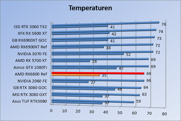 Staat de machine alleen maar aan en doet hij niets dan wordt er een temperatuur gemeten van 35 graden. Dus is redelijk aan de koele kant van alle kaarten die er tot nu toe getest zijn. Daarbij staan de ventilatoren stil wat dus in houdt dat er ook geen extra geluid is bij het koelen van de kaart. Zetten we vervolgens de kaart aan het werk door Furmark te starten dan stijgt de temperatuur naar 66 graden. Ook dat is redelijk koel te noemen in vergelijking met de andere kaarten. Een mooie prestatie van een reference ontwerp. De ventilatoren van de kaart draaien dan met een snelheid van 1645 toeren per minuut wat best mee valt. De temperatuur van het geheugen komt uit op 68 graden voor de mensen die dit zouden willen weten. Als de kaart overgeklokt is stijgt overigens de GPU temperatuur naar 70 graden en die van het geheugen naar 72 graden.
