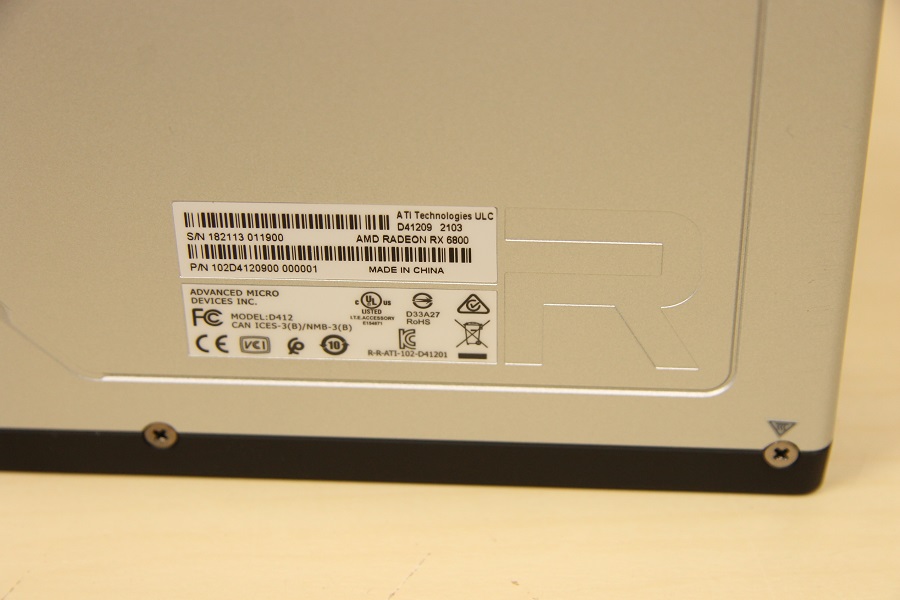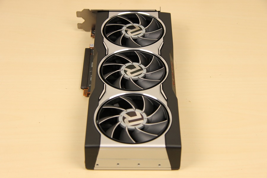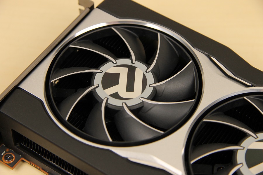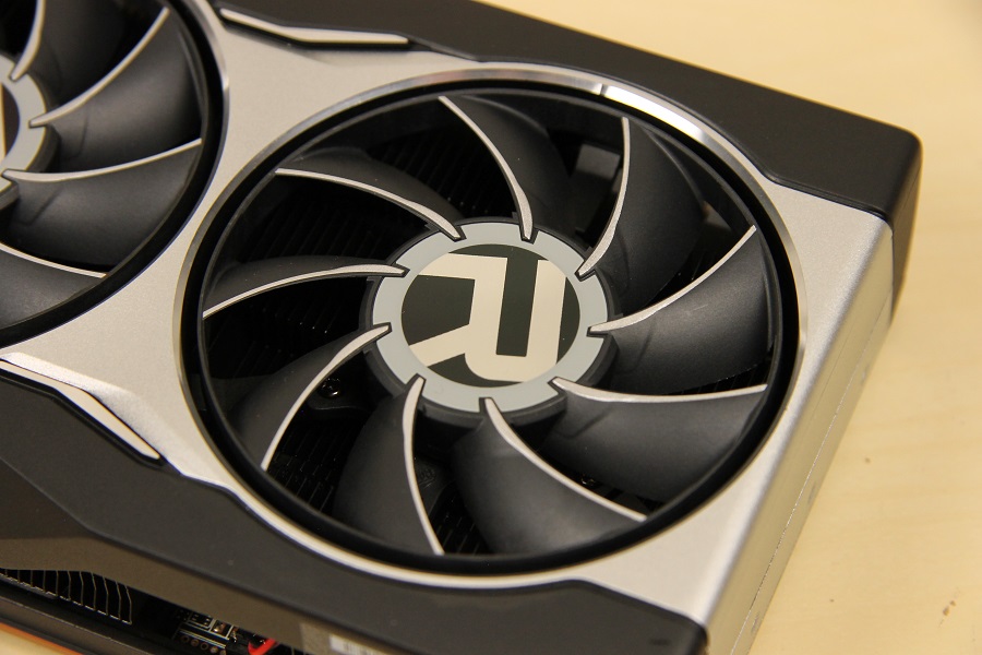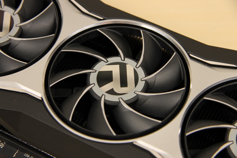 Om het geheel koel te houden heeft AMD drie ventilatoren op de koeler geplaatst. Deze draaien allemaal dezelfde richting uit dus ook hier geen speciale features of manieren om de kaart extra te koelen. De ventilatoren zijn in het zwart uitgevoerd met een aluminium gekleurd einde, dezelfde kleurstelling als de kaart heeft. Verder zitten op alle drie de varianten een sticker met een R, wederom een verwijzing naar RADEON. Boven de middelste ventilator zien we nogmaals de branding terug. Dit logo is verlicht maar alleen in het rood. Het is niet mogelijk om de kleur middels software aan te passen. Dit is alleen weggelegd voor de 6800XT en 6900XT. Dit is ook de enige verlichting die er op de kaart te vinden is. Andere verlichting moet je op een andere manier zien te regelen.